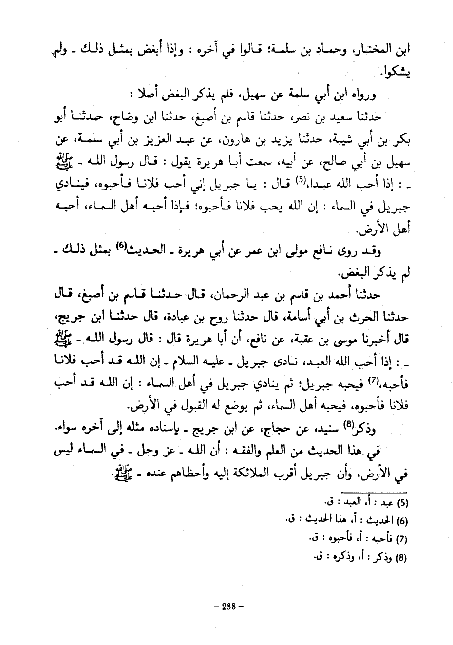ابن الْمُخْتَارِ وَحَمَّادُ بْنُ سَلَمَةَ قَالُوا فِي آخِرِهِ وَإِذَا أَبْغَضَ بِمِثْلِ ذَلِكَ وَلَمْ يَشُكُّوا وَرَوَاهُ ابْنُ أَبِي سَلَمَةَ عَنْ سُهَيْلِ فَلَمْ يَذْكُرِ الْبُغْضَ أَصْلًا حَدَّثَنَا سَعِيدُ بْنُ نَصْرٍ حَدَّثَنَا قَاسِمُ بْنُ أَصْبَغَ حَدَّثَنَا ابْنُ وَضَّاحٍ حَدَّثَنَا أَبُو بَكْرِ بْنُ أَبِي شَيْبَةَ حَدَّثَنَا يَزِيدُ بْنُ هَارُونَ عَنْ عَبْدِ الْعَزِيزِ بْنِ أَبِي سَلَمَةَ عَنْ سُهَيْلِ بْنِ أَبِي صَالِحٍ عَنْ أَبِيهِ سَمِعْتُ أَبَا هُرَيْرَةَ يَقُولُ قَالَ رَسُولُ اللَّهِ صَلَّى اللَّهُ عَلَيْهِ وَسَلَّمَ إِذَا أَحَبَّ اللَّهُ عَبْدًا قَالَ يَا جِبْرِيلُ إِنِّي أَحَبُّ فُلَانًا فَأَحِبُّوهُ فَيُنَادِي جِبْرِيلُ فِي السَّمَاءِ إِنِ اللَّهَ يُحِبُّ فُلَانًا فَأَحِبُّوهُ فَإِذَا أَحَبَّهُ أَهْلُ السَّمَاءِ أَحَبَّهُ أَهْلُ الْأَرْضِ وَقَدْ رَوَى نَافِعٍ مَوْلَى ابْنِ عُمَرَ عَنْ أَبِي هُرَيْرَةَ الْحَدِيثَ بِمِثْلِ ذَلِكَ لَمْ يَذْكُرِ الْبُغْضَ حَدَّثَنَا أَحْمَدُ بن قاسم بن عبد الرحمان قَالَ حَدَّثَنَا قَاسِمُ بْنُ أَصْبَغَ قَالَ حَدَّثَنَا الحرث بْنُ أَبِي أُسَامَةَ قَالَ حَدَّثَنَا رَوْحُ بْنُ عُبَادَةَ قَالَ حَدَّثَنَا ابْنُ جُرَيْجٍ قَالَ أَخْبَرَنَا مُوسَى بْنُ عُقْبَةَ عَنْ نَافِعٍ أَنَّ أَبَا هُرَيْرَةَ قَالَ قَالَ رَسُولُ اللَّهِ صَلَّى اللَّهُ عَلَيْهِ وَسَلَّمَ إِذَا أَحَبَّ اللَّهُ الْعَبْدَ نَادَى جِبْرِيلَ عَلَيْهِ السَّلَامُ إِنِ اللَّهَ قَدْ أَحَبَّ فُلَانًا فَأَحِبَّهُ فَيُحِبُّهُ جِبْرِيلُ ثُمَّ يُنَادِي جِبْرِيلُ فِي أَهْلِ السَّمَاءِ إِنِ اللَّهَ قَدْ أَحَبَّ فُلَانًا فَأَحِبُّوهُ فَيُحِبُّهُ أَهْلُ السَّمَاءِ ثُمَّ يُوضَعُ لَهُ الْقَبُولُ فِي الْأَرْضِ وَذَكَرَ سُنَيْدٍ عَنْ حَجَّاجٍ عَنِ ابْنِ جُرَيْجٍ بِإِسْنَادِهِ مِثْلَهُ إِلَى آخِرِهِ سَوَاءٌ فِي هَذَا الْحَدِيثِ مِنَ الْعِلْمِ وَالْفِقْهِ أَنَّ اللَّهَ عَزَّ وَجَلَّ فِي السَّمَاءِ لَيْسَ فِي الْأَرْضِ وَأَنَّ جِبْرِيلَ أَقْرَبُ الْمَلَائِكَةِ إِلَيْهِ وَأَحْظَاهُمْ عِنْدَهُ صَلَّى اللَّهُ عَلَيْهِ وَسَلَّمَ