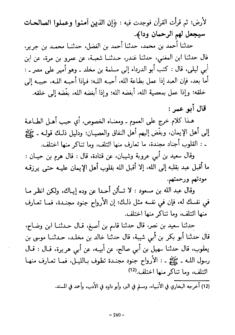 الأرض ثم قرأت القرى فَوَجَدْتُ فِيهِ إِنَّ الَّذِينَ آمَنُوا وَعَمِلُوا الصَّالِحَاتِ سيجعل لهم الرحمان وُدًّا حَدَّثَنَا أَحْمَدُ بْنُ مُحَمَّدٍ حَدَّثَنَا أَحْمَدُ بْنُ الْفَضْلِ حَدَّثَنَا مُحَمَّدُ بْنُ جَرِيرٍ قَالَ حَدَّثَنَا ابْنُ الْمُغَنِّي حَدَّثَنَا غُنْدَرٌ حَدَّثَنَا شُعْبَةُ عَنْ عَمْرِو بْنِ مُرَّةَ عَنْ ابْنِ أَبِي لَيْلَى قَالَ كَتَبَ أَبُو الدَّرْدَاءِ إِلَى مَسْلَمَةَ بْنِ مُخَلَّدٍ وَهُوَ أَمِيرٌ عَلَى مِصْرَ أَمَّا بَعْدُ فَإِنَّ الْعَبْدَ إِذَا عَمِلَ بِطَاعَةِ اللَّهِ أَحَبَّهُ اللَّهُ فَإِذَا أَحَبَّهُ اللَّهُ حَبَّبَهُ إِلَى خَلْقِهِ وَإِذَا عَمِلَ بِمَعْصِيَةِ اللَّهِ أَبَغَضَهُ اللَّهُ وَإِذَا أَبْغَضَهُ اللَّهُ بَغَّضَهُ إِلَى خَلْقِهِ قَالَ أَبُو عُمَرَ هَذَا كَلَامٌ خَرَجَ عَلَى الْعُمُومِ وَمَعْنَاهُ الْخُصُوصُ أَيْ حَبَّبَ أَهْلَ الطَّاعَةِ إِلَى أهل الإيمان وبغض إليهم أهل النفاق والصعيان وَدَلِيلُ ذَلِكَ قَوْلُهُ صَلَّى اللَّهُ عَلَيْهِ وَسَلَّمَ الْقُلُوبُ أَجْنَادٌ مُجَنَّدَةٌ مَا تَعَارَفَ مِنْهَا ائْتَلَفَ وَمَا تَنَاكَرَ مِنْهَا اخْتَلَفَ وَقَالَ سَعِيدُ بْنُ أَبِي عَرُوبَةَ وَشَيْبَانُ عَنْ قَتَادَةَ قَالَ قَالَ هرم بن حبان مَا أَقْبَلَ عَبْدٌ بِقَلْبِهِ إِلَى اللَّهِ إِلَّا أَقْبَلَ اللَّهُ بِقُلُوبِ أَهْلِ الْإِيمَانِ عَلَيْهِ حَتَّى يَرْزُقَهُ مَوَدَّتَهُمْ وَرَحْمَتَهُمْ وَقَالَ عَبْدُ اللَّهِ بْنُ مَسْعُودٍ لَا تَسْأَلَنَّ أَحَدًا عَنْ وِدِّهِ إِيَّاكَ وَلَكِنِ انْظُرْ مَا فِي نَفْسِكَ لَهُ فَإِنَّ فِي نَفْسِهِ مِثْلَ ذَلِكَ إِنِ الْأَرْوَاحُ جُنُودٌ مُجَنَّدَةٌ فَمَا تَعَارَفَ مِنْهَا ائْتَلَفَ وَمَا تَنَاكَرَ مِنْهَا اخْتَلَفَ حَدَّثَنَا سَعِيدُ بْنُ نَصْرٍ قَالَ حَدَّثَنَا قَاسِمُ بْنُ أَصْبَغَ قَالَ حَدَّثَنَا ابْنُ وَضَّاحٍ قَالَ حَدَّثَنَا أَبُو بَكْرِ بْنُ أَبِي شَيْبَةَ قَالَ حَدَّثَنَا خَالِدُ بْنُ مُخَلَّدٍ حَدَّثَنَا مُوسَى بْنُ يَعْقُوبَ قَالَ حَدَّثَنَا سُهَيْلُ بْنُ أَبِي صَالِحٍ عَنْ أَبِيهِ عَنْ أَبِي هُرَيْرَةَ قَالَ قَالَ رَسُولُ اللَّهِ صَلَّى اللَّهُ عَلَيْهِ وَسَلَّمَ الْأَرْوَاحُ جُنُودٌ مُجَنَّدَةٌ تَطُوفُ بِاللَّيْلِ فَمَا تَعَارَفَ مِنْهَا ائْتَلَفَ وَمَا تَنَاكَرَ مِنْهَا اخْتَلَفَ