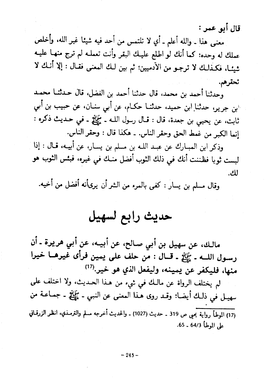 قَالَ أَبُو عُمَرَ مَعْنَى هَذَا وَاللَّهُ أَعْلَمُ أَيْ لَا تَلْتَمِسْ مِنْ أَحَدٍ فِيهِ شَيْئًا غَيْرَ اللَّهِ وَأَخْلِصْ عَمَلَكَ لَهُ وَحْدَهُ كَمَا أَنَّكَ لَوِ اطَّلَعَ عَلَيْكَ الْبَقَرُ وَأَنْتَ تَعْمَلُهُ لَمْ تَرْجُ مِنْهَا عَلَيْهِ شَيْئًا فَكَذَلِكَ لَا تَرْجُو مِنَ الْآدَمِيِّينَ ثُمَّ بَيَّنَ لَكَ الْمَعْنَى فَقَالَ إِلَّا أَنَّكَ لَا تَحْقِرْهُمْ وَحَدَّثَنَا أَحْمَدُ بْنُ مُحَمَّدٍ قَالَ حَدَّثَنَا أَحْمَدُ بْنُ الْفَضْلِ قَالَ حَدَّثَنَا مُحَمَّدُ بْنُ جَرِيرٍ حَدَّثَنَا ابْنُ حُمَيْدٍ حَدَّثَنَا حَكَّامٌ عَنْ أَبِي سِنَانٍ عَنْ حَبِيبِ بْنِ أَبِي ثَابِتٍ عَنْ يَحْيَى بْنِ جَعْدَةَ قَالَ قَالَ رَسُولُ اللَّهِ صَلَّى اللَّهُ عَلَيْهِ وَسَلَّمَ فِي حَدِيثِ ذَكَرَهُ إِنَّمَا الْكِبْرُ مَنْ غَمَطَ الْحَقَّ وَحَقَرَ النَّاسَ هَكَذَا قَالَ وَحَقَرَ النَّاسَ وَذَكَرَ ابْنُ الْمُبَارَكِ عَنْ عَبْدِ اللَّهِ بْنِ مُسْلِمِ بْنِ يَسَارٍ عَنْ أَبِيهِ قَالَ إِذَا لَبِسْتَ ثَوْبًا فَظَنَنْتَ أَنَّكَ فِي ذَلِكَ الثَّوْبِ أَفْضَلُ مِنْكَ فِي غَيْرِهِ فَبِئْسَ الثَّوْبُ هُوَ لَكَ وَقَالَ مُسْلِمُ بْنُ يَسَارٍ كَفَى بِالْمَرْءِ مِنَ الشَّرِّ أَنْ يَرَى أَنَّهُ أَفْضَلُ مِنْ أَخِيهِ