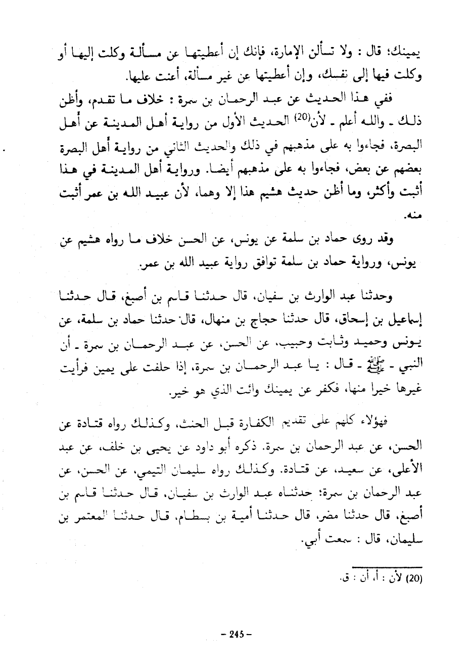 يَمِينِكَ قَالَ وَلَا تَسْأَلَنَّ الْإِمَارَةَ فَإِنَّكَ إِنْ أُعْطِيتَهَا عَنْ مَسْأَلَةٍ وُكِلْتَ إِلَيْهَا أَوْ وُكِلْتَ فِيهَا إِلَى نَفْسِكَ وَإِنْ أُعْطِيتَهَا عَنْ غَيْرِ مَسْأَلَةٍ أُعِنْتَ عَلَيْهَا فَفِي هَذَا الْحَدِيثِ عَنْ عبد الرحمان بْنِ سَمُرَةَ خِلَافُ مَا تَقَدَّمَ وَأَظُنُّ ذَلِكَ وَاللَّهُ أَعْلَمُ لِأَنَّ الْحَدِيثَ الْأَوَّلَ مِنْ رِوَايَةِ أَهْلِ الْمَدِينَةِ عَنْ أَهْلِ الْبَصْرَةِ فَجَاءُوا بِهِ عَلَى مَذْهَبِهِمْ فِي ذَلِكَ وَالْحَدِيثُ الثَّانِي مِنْ رِوَايَةِ أَهْلِ الْبَصْرَةِ بَعْضُهُمْ عَنْ بَعْضٍ فَجَاءُوا بِهِ عَلَى مَذْهَبِهِمْ أَيْضًا وَرِوَايَةُ أَهْلِ الْمَدِينَةِ فِي هَذَا أَثْبَتُ وَأَكْثَرُ وَمَا أَظُنُّ حَدِيثَ هُشَيْمٍ هَذَا إِلَّا وَهْمًا لِأَنَّ عُبَيْدَ اللَّهِ بْنَ عُمَرَ أَثْبَتُ مِنْهُ وَقَدْ رَوَى حَمَّادُ بْنُ سَلَمَةَ عَنْ يُونُسَ عَنِ الْحَسَنِ خِلَافَ مَا رَوَاهُ هُشَيْمٌ عَنْ يُونُسَ وَرِوَايَةُ حَمَّادِ بْنِ سَلَمَةَ تَوَافُقُ رِوَايَةَ عُبَيْدِ اللَّهِ بْنِ عُمَرَ وَحَدَّثَنَا عَبْدُ الْوَارِثِ بْنُ سُفْيَانَ قَالَ حَدَّثَنَا قَاسِمُ بْنُ أَصْبَغَ قَالَ حَدَّثَنَا إِسْمَاعِيلُ بْنُ إِسْحَاقَ قَالَ حَدَّثَنَا حَجَّاجُ بْنُ مِنْهَالٍ قَالَ حَدَّثَنَا حَمَّادُ بْنُ سَلَمَةَ عَنْ يُونُسَ وَحُمَيْدٍ وَثَابِتٍ وَحَبِيبٍ عَنِ الْحَسَنِ عَنْ عَبْدِ الرحمان بْنِ سَمُرَةَ أَنَّ النَّبِيَّ صَلَّى اللَّهُ عَلَيْهِ وَسَلَّمَ قَالَ يا عبد الرحمان بْنَ سَمُرَةَ إِذَا حَلَفْتَ عَلَى يَمِينٍ فَرَأَيْتَ غَيْرَهَا خَيْرًا مِنْهَا فَكَفِّرْ عَنْ يَمِينِكَ وَائْتِ الَّذِي هُوَ خَيْرٌ فَهَؤُلَاءِ كُلُّهُمْ عَلَى تَقْدِيمِ الْكَفَّارَةِ قَبْلَ الْحِنْثِ وَكَذَلِكَ رَوَاهُ قَتَادَةُ عَنِ الحسن عن عبد الرحمان بْنِ سَمُرَةَ ذَكَرَهُ أَبُو دَاوُدَ عَنْ يَحْيَى بْنِ خَلَفٍ عَنْ عَبْدِ الْأَعْلَى عَنْ سَعِيدٍ عَنْ قَتَادَةَ وَكَذَلِكَ رَوَاهُ سُلَيْمَانُ التَّيْمِيُّ عَنِ الحسن عن عبد الرحمان بْنِ سَمُرَةَ حَدَّثَنَاهُ عَبْدُ الْوَارِثِ بْنُ سُفْيَانَ قَالَ حَدَّثَنَا قَاسِمُ بْنُ أَصْبَغَ قَالَ حَدَّثَنَا مَضَرٌ قَالَ حَدَّثَنَا أُمَيَّةُ بْنُ بِسِطَامٍ قَالَ حَدَّثَنَا الْمُعْتَمِرُ بْنُ سُلَيْمَانَ قَالَ سَمِعْتُ أَبِي