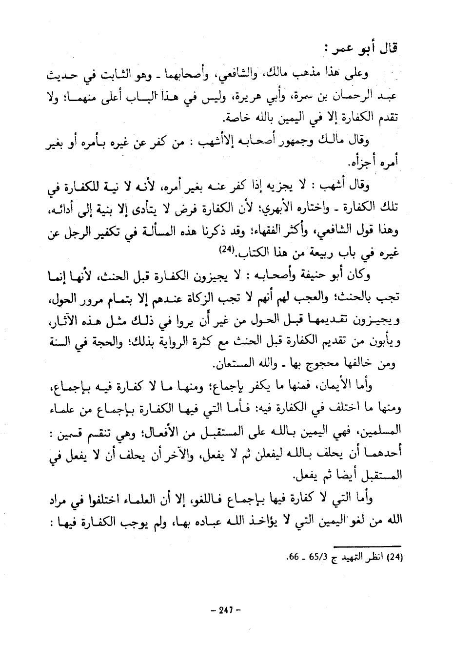 قَالَ أَبُو عُمَرَ وَعَلَى هَذَا مَذْهَبُ مَالِكٍ وَالشَّافِعِيِّ وَأَصْحَابِهِمَا وَهُوَ الثَّابِتُ فِي حَدِيثِ عَبْدِ الرحمان بْنِ سَمُرَةَ وَأَبِي هُرَيْرَةَ وَلَيْسَ فِي هَذَا الْبَابِ أَعْلَى مِنْهُمَا وَلَا تُقَدَّمُ الْكَفَّارَةُ إِلَّا فِي الْيَمِينِ بِاللَّهِ خَاصَّةً وَقَالَ مَالِكٌ وَجُمْهُورُ أَصْحَابِهِ إِلَّا أَشْهَبَ مَنْ كَفَّرَ عَنْ غَيْرِهِ بِأَمْرِهِ أَوْ بِغَيْرِ أَمْرِهِ أَجْزَأَهُ وَقَالَ أَشْهَبُ لَا يَجْزِيهِ إِذَا كَفَّرَ عَنْهُ بِغَيْرِ أَمْرِهِ لِأَنَّهُ لَا نِيَّةَ لِلْكَفَّارَةِ فِي تِلْكَ الْكَفَّارَةِ وَاخْتَارَهُ الْأَبْهَرِيُّ لِأَنَّ الْكَفَّارَةَ فَرْضٌ لَا يَتَأَدَّى إلا بنية إليك أَدَائِهِ وَهَذَا قَوْلُ الشَّافِعِيِّ وَأَكْثَرُ الْفُقَهَاءِ وَقَدْ ذَكَرْنَا هَذِهِ الْمَسْأَلَةَ فِي تَكْفِيرِ الرَّجُلِ عَنْ غَيْرِهِ فِي بَابِ رَبِيعَةَ مِنْ هَذَا الْكِتَابِ وَكَانَ أَبُو حَنِيفَةَ وَأَصْحَابُهُ لَا يُجِيزُونَ الْكَفَّارَةَ قَبْلَ الْحِنْثِ لِأَنَّهَا إِنَّمَا تَجِبُ بِالْحِنْثِ وَالْعَجَبُ لَهُمْ أَنَّهُمْ لَا تُجِبُ الزَّكَاةُ عِنْدَهُمْ إِلَّا بِتَمَامِ مُرُورِ الْحَوْلِ وَيُجِيزُونَ تَقْدِيمَهَا قَبْلَ الْحَوْلِ من غير ان يروا فِي ذَلِكَ مِثْلُ هَذِهِ الْآثَارِ وَيَأْبَوْنَ مِنْ تَقْدِيمِ الْكَفَّارَةِ قَبْلَ الْحِنْثِ مَعَ كَثْرَةِ الرِّوَايَةِ بِذَلِكَ وَالْحُجَّةُ فِي السُّنَّةِ وَمَنْ خَالَفَهَا مَحْجُوجٌ بِهَا وَاللَّهُ الْمُسْتَعَانُ وَأَمَّا الْأَيْمَانُ فَمِنْهَا مَا يُكَفَّرُ بِإِجْمَاعٍ وَمِنْهَا مَا لَا كَفَّارَةَ فِيهِ بِإِجْمَاعٍ وَمِنْهَا مَا اخْتُلِفَ فِي الْكَفَّارَةِ فِيهِ فَأَمَّا الَّتِي فِيهَا الْكَفَّارَةُ بِإِجْمَاعٍ مِنْ عُلَمَاءِ الْمُسْلِمِينَ فَهِيَ الْيَمِينُ بِاللَّهِ عَلَى الْمُسْتَقْبَلِ مِنَ الْأَفْعَالِ وَهِيَ تَنْقَسِمُ قِسْمَيْنِ أَحَدُهُمَا أَنْ يَحْلِفَ بِاللَّهِ لِيَفْعَلَنَّ ثُمَّ لَا يَفْعَلُ وَالْآخَرُ أَنْ يَحْلِفَ أَنْ لَا يَفْعَلَ فِي الْمُسْتَقْبَلِ أَيْضًا ثُمَّ يَفْعَلُ وَأَمَّا الَّتِي لَا كَفَّارَةَ فِيهَا بِإِجْمَاعٍ فَاللَّغْوُ إِلَّا أَنَّ الْعُلَمَاءَ اخْتَلَفُوا فِي مراد الله من لغو المين الَّتِي لَا يُؤَاخِذُ اللَّهَ عِبَادَهُ بِهَا وَلَمْ يُوجِبِ الْكَفَّارَةَ فِيهَا