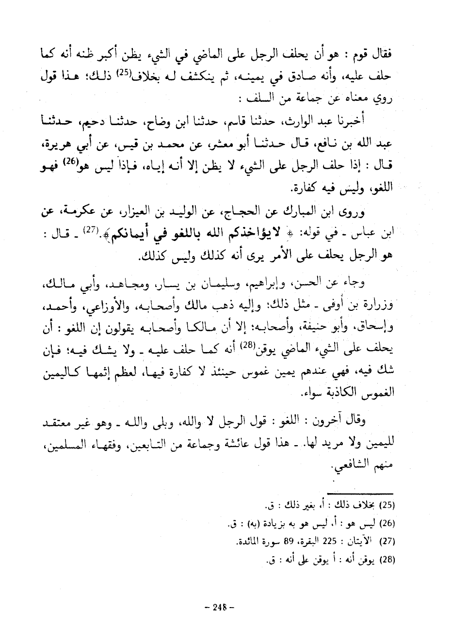 فَقَالَ قَوْمٌ هُوَ أَنْ يَحْلِفَ الرَّجُلُ عَلَى الْمَاضِي فِي الشَّيْءِ يَظُنُّ أَكْبَرَ ظَنِّهِ أَنَّهُ كَمَا حَلَفَ عَلَيْهِ وَأَنَّهُ صَادِقٌ فِي يَمِينِهِ ثُمَّ يَنْكَشِفُ لَهُ بِخِلَافِ ذَلِكَ هَذَا قَوْلٌ رُوِيَ مَعْنَاهُ عَنْ جَمَاعَةٍ مِنَ السَّلَفِ أَخْبَرَنَا عَبْدُ الْوَارِثِ حَدَّثَنَا قَاسِمٌ حَدَّثَنَا ابْنُ وَضَّاحٍ حَدَّثَنَا دُحَيْمٌ حَدَّثَنَا عَبْدُ اللَّهِ بْنُ نَافِعٍ قَالَ حَدَّثَنَا أَبُو مَعْشَرٍ عَنْ مُحَمَّدِ بْنِ قَيْسٍ عَنْ أَبِي هُرَيْرَةَ قَالَ إِذَا حَلَفَ الرَّجُلُ عَلَى الشَّيْءِ لَا يَظُنُّ إِلَّا أَنَّهُ إِيَّاهُ فَإِذَا لَيْسَ هُوَ فَهُوَ اللَّغْوُ وَلَيْسَ فِيهِ كَفَّارَةٌ وَرَوَى ابْنُ الْمُبَارَكِ عَنِ الْحَجَّاجِ عَنِ الْوَلِيدِ بْنِ الْعَيْزَارِ عَنْ عِكْرِمَةَ عَنِ ابْنِ عَبَّاسٍ فِي قَوْلِهِ لَا يُؤَاخِذُكُمُ اللَّهُ بِاللَّغْوِ فِي أَيْمَانِكُمْ قَالَ هُوَ الرَّجُلُ يَحْلِفُ عَلَى الْأَمْرِ يَرَى أَنَّهُ كَذَلِكَ وَلَيْسَ كَذَلِكَ وَجَاءَ عَنِ الْحَسَنِ وَإِبْرَاهِيمَ وَسُلَيْمَانَ بْنِ يَسَارٍ وَمُجَاهِدٍ وَأَبِي مَالِكٍ وَزُرَارَةَ بْنِ أَوْفَى مِثْلُ ذَلِكَ وَإِلَيْهِ ذَهَبَ مَالِكٌ وَأَصْحَابُهُ وَالْأَوْزَاعِيُّ وَأَحْمَدُ وَإِسْحَاقُ وَأَبُو حَنِيفَةَ وَأَصْحَابُهُ إِلَّا أَنَّ مَالِكًا وَأَصْحَابُهُ يَقُولُونَ إِنَّ اللَّغْوَ أَنْ يَحْلِفَ عَلَى الشَّيْءِ الْمَاضِي يُوقِنُ أَنَّهُ كَمَا حَلَفَ عَلَيْهِ وَلَا يَشُكُّ فِيهِ فَإِنْ شَكَّ فِيهِ فَهِيَ عندهم يمين غموس حنيئذ لَا كَفَّارَةَ فِيهَا لِعِظَمِ إِثْمِهَا كَالْيَمِينِ الْغَمُوسِ الْكَاذِبَةِ سَوَاءٌ وَقَالَ آخَرُونَ اللَّغْوُ قَوْلُ الرَّجُلِ لَا وَاللَّهِ وَبِلَى وَاللَّهِ وَهُوَ غَيْرُ مُعْتَقَدٍ لِلْيَمِينِ وَلَا مُرِيدٍ لَهَا هَذَا قَوْلُ عَائِشَةَ وَجَمَاعَةٌ مِنَ التَّابِعِينَ وَفُقَهَاءِ الْمُسْلِمِينَ مِنْهُمُ الشَّافِعِيُّ