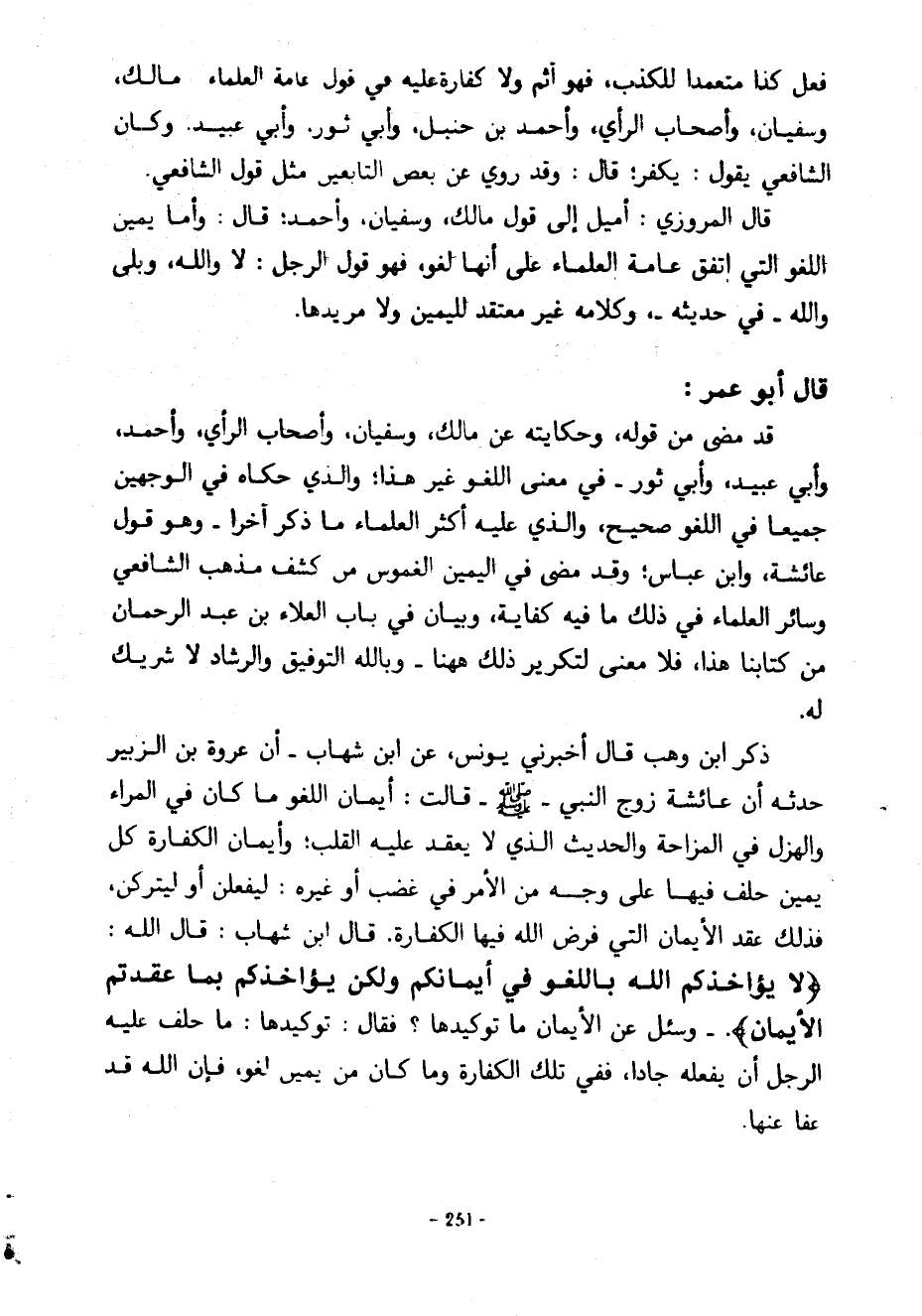 فَعَلَ كَذَا مُتَعَمِّدًا لِلْكَذِبِ فَهُوَ آثِمٌ وَلَا كَفَّارَةَ عَلَيْهِ فِي قَوْلِ عَامَّةِ الْعُلَمَاءِ مَالِكٌ وَسُفْيَانُ وَأَصْحَابُ الرَّأْيِ وَأَحْمَدُ بْنُ حَنْبَلٍ وَأَبِي ثَوْرٍ وَأَبِي عُبَيْدٍ وَكَانَ الشَّافِعِيُّ يَقُولُ يُكَفِّرُ قَالَ وَقَدْ رُوِيَ عَنْ بَعْضِ التَّابِعِينَ مِثْلَ قَوْلِ الشَّافِعِيِّ قَالَ الْمَرْوَزِيُّ أَمِيلُ إِلَى قَوْلِ مَالِكٍ وَسُفْيَانَ وَأَحْمَدَ قَالَ وَأَمَّا يَمِينُ اللَّغْوِ الَّتِي اتَّفَقَ عَامَّةُ الْعُلَمَاءِ عَلَى أَنَّهَا لَغْوٌ فَهُوَ قَوْلُ الرَّجُلِ لَا وَاللَّهِ وَبَلَى وَاللَّهِ فِي حَدِيثِهِ وَكَلَامِهِ غَيْرَ مُعْتَقَدٍ لِلْيَمِينِ وَلَا مُرِيدِهَا قَالَ أَبُو عُمَرَ قَدْ مَضَى مِنْ قَوْلِهِ وَحِكَايَتِهِ عَنْ مَالِكٍ وَسُفْيَانَ وَأَصْحَابِ الرَّأْيِ وَأَحْمَدَ وَأَبِي عُبَيْدٍ وَأَبِي ثَوْرٍ فِي مَعْنَى اللغو غير هَذَا وَالَّذِي حَكَاهُ فِي الْوَجْهَيْنِ جَمِيعًا فِي اللَّغْوِ صَحِيحٌ وَالَّذِي عَلَيْهِ أَكْثَرُ الْعُلَمَاءِ مَا ذُكِرَ آخِرًا وَهُوَ قَوْلُ عَائِشَةَ وَابْنِ عَبَّاسٍ وَقَدْ مَضَى فِي الْيَمِينِ الْغَمُوسِ مِنْ كَشْفِ مَذْهَبِ الشَّافِعِيِّ وَسَائِرِ الْعُلَمَاءِ فِي ذَلِكَ مَا فِيهِ كِفَايَةٌ وَبَيَانٌ فِي بَابِ الْعَلَاءِ بْنِ عبد الرحمان مِنْ كِتَابِنَا هَذَا فَلَا مَعْنَى لِتَكْرِيرِ ذَلِكَ ههنا وَبِاللَّهِ التَّوْفِيقُ وَالرَّشَادُ لَا شَرِيكَ لَهُ ذَكَرَ ابْنُ وَهْبٍ قَالَ أَخْبَرَنِي يُونُسُ عَنِ ابْنِ شِهَابٍ أَنَّ عُرْوَةَ بْنَ الزُّبَيْرِ حَدَّثَهُ أَنَّ عَائِشَةَ زَوْجَ النَّبِيِّ صَلَّى اللَّهُ عَلَيْهِ وَسَلَّمَ قَالَتْ أَيْمَانُ اللَّغْوِ مَا كَانَ فِي الْمِرَاءِ وَالْهَزْلِ فِي الْمُزَاحَةِ وَالْحَدِيثِ الَّذِي لَا يُعْقَدُ عَلَيْهِ الْقَلْبُ وَأَيْمَانُ الْكَفَّارَةِ كُلُّ يَمِينٍ حَلَفَ فِيهَا عَلَى وَجْهٍ مِنَ الْأَمْرِ فِي غَضَبٍ أَوْ غَيْرِهِ لِيَفْعَلَنَّ أَوْ لَيَتْرُكَنَّ فَذَلِكَ عَقْدُ الْأَيْمَانِ الَّتِي فَرَضَ اللَّهُ فِيهَا الْكَفَّارَةَ قَالَ ابْنُ شِهَابٍ قَالَ اللَّهُ لَا يُؤَاخِذُكُمُ اللَّهُ بِاللَّغْوِ فِي أَيْمَانِكُمْ وَلَكِنْ يُؤَاخِذُكُمْ بِمَا عَقَّدْتُمُ الْأَيْمَانَ وَسُئِلَ عَنِ الْأَيْمَانِ مَا تَوْكِيدُهَا فَقَالَ تَوْكِيدُهَا مَا حَلَفَ عَلَيْهِ الرَّجُلُ أَنْ يَفْعَلَهُ جَادًّا فَفِي تِلْكَ الْكَفَّارَةُ وَمَا كَانَ مِنْ يَمِينِ لَغْوٍ فَإِنَّ اللَّهَ قَدْ عَفَا عَنْهَا
