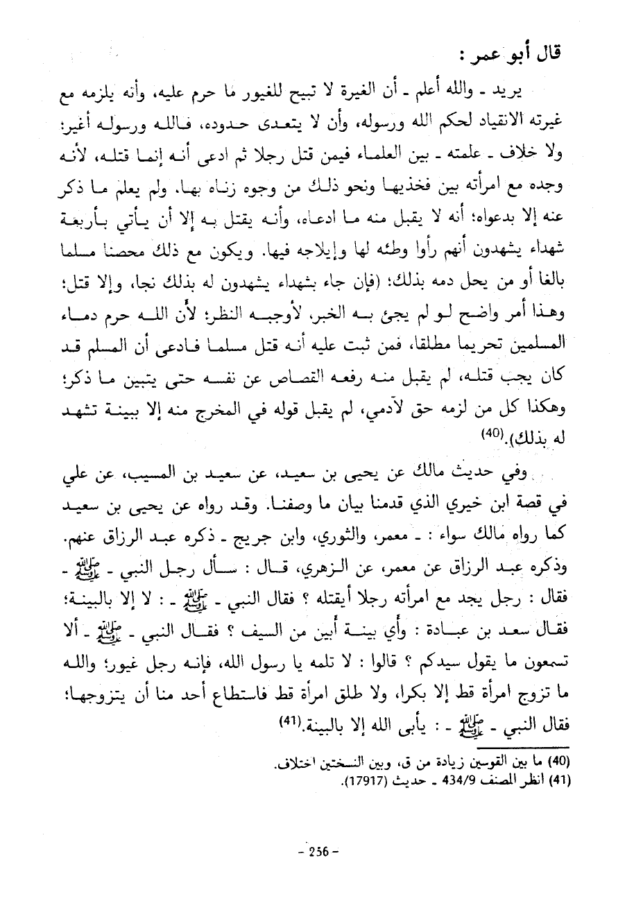 قَالَ أَبُو عُمَرَ يُرِيدُ وَاللَّهُ أَعْلَمُ أَنَّ الْغَيْرَةَ لَا تُبِيحُ لِلْغَيُورِ مَا حُرِمَ عَلَيْهِ وَأَنَّهُ يَلْزَمُهُ مَعَ غَيْرَتِهِ الِانْقِيَادُ لِحُكْمِ اللَّهِ وَرَسُولِهِ وَأَنْ لَا يَتَعَدَّى حُدُودَهُ فَاللَّهُ وَرَسُولُهُ أَغْيَرُ وَلَا خِلَافَ عَلِمْتُهُ بَيْنَ الْعُلَمَاءِ فِيمَنْ قَتَلَ رَجُلًا ثُمَّ ادَّعَى أَنَّهُ إِنَّمَا قَتَلَهُ لِأَنَّهُ وَجَدَهُ مَعَ امْرَأَتِهِ بَيْنَ فَخِذَيْهَا وَنَحْوِ ذَلِكَ مِنْ وُجُوهِ زِنَاهُ بِهَا وَلَمْ يُعْلَمْ مَا ذَكَرَ عَنْهُ إِلَّا بِدَعْوَاهُ أَنَّهُ لَا يُقْبَلُ مِنْهُ مَا ادَّعَاهُ وَأَنَّهُ يُقْتَلُ بِهِ إِلَّا أَنْ يَأْتِيَ بِأَرْبَعَةِ شُهَدَاءَ يَشْهَدُونَ أَنَّهُمْ رَأَوْا وَطْئَهُ لَهَا وَإِيلَاجَهُ فِيهَا وَيَكُونُ مَعَ ذَلِكَ مُحْصَنًا مُسْلِمًا بَالِغًا أَوْ مَنْ يَحِلُّ دَمُهُ بِذَلِكَ (فَإِنْ جَاءَ بِشُهَدَاءَ يَشْهَدُونَ لَهُ بِذَلِكَ نَجَا وَإِلَّا قُتِلَ وَهَذَا أَمْرٌ وَاضِحٌ لو لم يجيء بِهِ الْخَبَرُ لَأَوْجَبَهُ النَّظَرُ لَأَنَّ اللَّهَ حَرَّمَ دِمَاءَ الْمُسْلِمِينَ تَحْرِيمًا مُطْلَقًا فَمَنْ ثَبَتَ عَلَيْهِ أَنَّهُ قَتَلَ مُسْلِمًا فَادَّعَى أَنَّ الْمُسْلِمَ قَدْ كَانَ يَجِبُ قَتْلُهُ لَمْ يَقْبَلْ مِنْهُ رَفْعُهُ الْقِصَاصَ عَنْ نَفْسِهِ حَتَّى يَتَبَيَّنَ مَا ذَكَرَ وَهَكَذَا كُلُّ مَنْ لَزِمَهُ حَقٌّ لِآدَمِيٍّ لَمْ يُقْبَلْ قَوْلُهُ فِي الْمَخْرَجِ مِنْهُ إِلَّا بِبَيِّنَةٍ تَشْهَدُ لَهُ بِذَلِكَ) وَفِي حَدِيثِ مَالِكٌ عَنْ يَحْيَى بْنِ سَعِيدٍ عَنْ سَعِيدِ بْنِ الْمُسَيَّبِ عن علي في قصة ابن خيري الَّذِي قَدَّمْنَا بَيَانَ مَا وَصَفْنَا وَقَدْ رَوَاهُ عَنْ يَحْيَى بْنِ سَعِيدٍ كَمَا رَوَاهُ مَالِكٌ سَوَاءً مَعْمَرٌ وَالثَّوْرِيُّ وَابْنُ جُرَيْجٍ ذَكَرَهُ عَبْدُ الرَّزَّاقِ عَنْهُمْ وَذَكَرَهُ عَبْدُ الرَّزَّاقِ عَنْ مَعْمَرٍ عَنِ الزُّهْرِيِّ قَالَ سَأَلَ رَجُلٌ النَّبِيَّ صَلَّى اللَّهُ عَلَيْهِ وَسَلَّمَ فَقَالَ رَجُلٌ يَجِدُ مَعَ امْرَأَتِهِ رَجُلًا أَيَقْتُلُهُ فَقَالَ النَّبِيُّ صَلَّى اللَّهُ عَلَيْهِ وَسَلَّمَ لَا إِلَّا بِالْبَيِّنَةِ فَقَالَ سَعْدُ بْنُ عُبَادَةَ وَأَيُّ بَيِّنَةٍ أَبْيَنُ مِنَ السَّيْفِ فَقَالَ النَّبِيُّ صَلَّى اللَّهُ عَلَيْهِ وَسَلَّمَ أَلَا تَسْمَعُونَ مَا يَقُولُ سَيِّدُكُمْ قَالُوا لَا تَلُمْهُ يَا رَسُولَ اللَّهِ فَإِنَّهُ رَجُلٌ غَيُورٌ وَاللَّهِ مَا تُزَوَّجَ امْرَأَةً قَطُّ إِلَّا بِكْرًا وَلَا طَلَّقَ امْرَأَةً قَطُّ فَاسْتَطَاعَ أَحَدٌ مِنَّا أَنْ يَتَزَوَّجَهَا فَقَالَ النَّبِيُّ صَلَّى اللَّهُ عَلَيْهِ وَسَلَّمَ يَأْبَى اللَّهُ إِلَّا بِالْبَيِّنَةِ