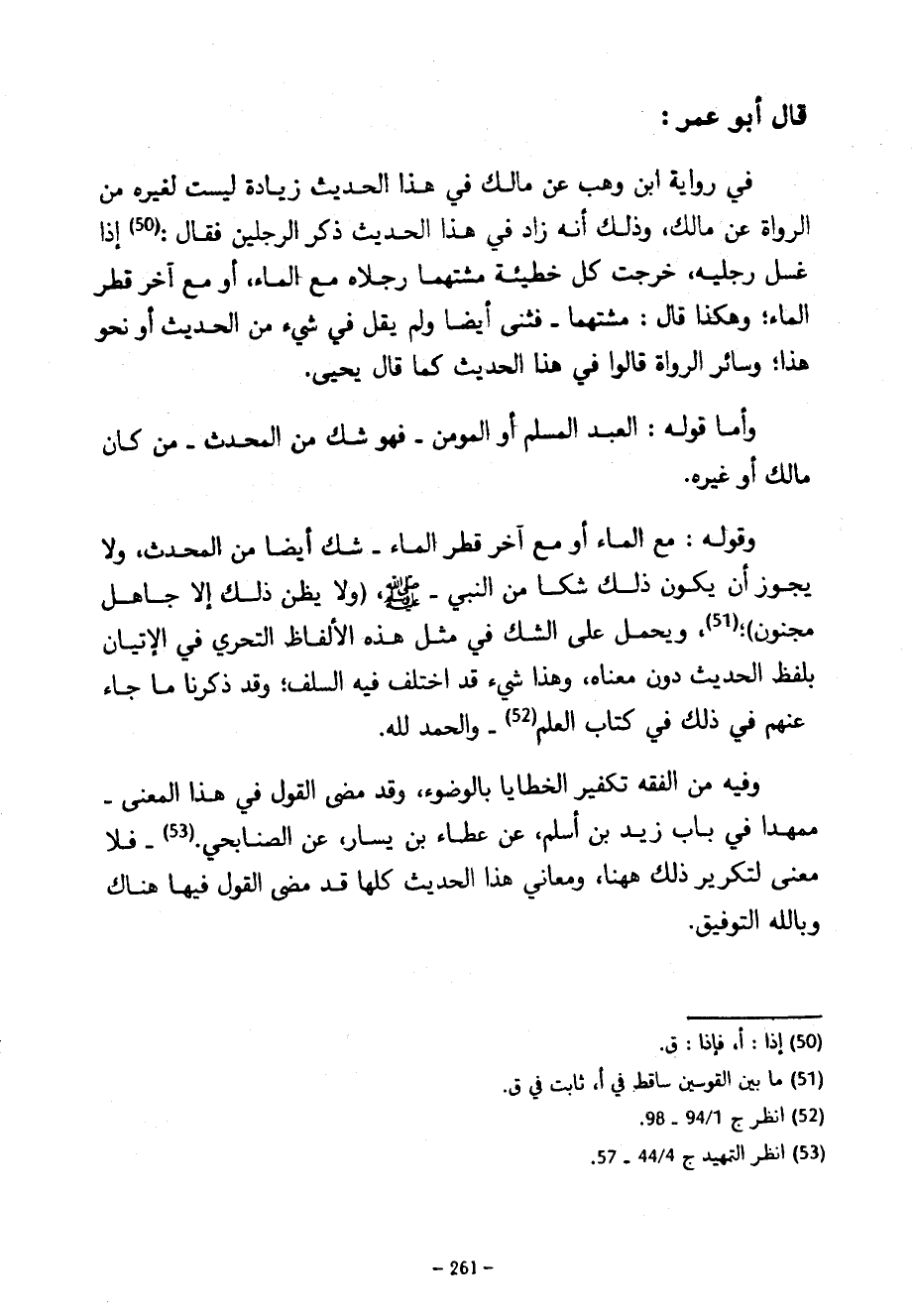 قَالَ أَبُو عُمَرَ فِي رِوَايَةِ ابْنِ وَهْبٍ عَنْ مَالِكٍ فِي هَذَا الْحَدِيثِ زِيَادَةٌ لَيْسَتْ لِغَيْرِهِ مِنَ الرُّوَاةِ عَنْ مَالِكٍ وَذَلِكَ أَنَّهُ زَادَ فِي هَذَا الْحَدِيثِ ذِكْرَ الرِّجْلَيْنِ فَقَالَ إِذَا غَسَلَ رِجْلَيْهِ خَرَجَتْ كُلُّ خَطِيئَةٍ مَشَّتْهُمَا رِجْلَاهُ مَعَ الْمَاءِ أَوْ مَعَ آخِرِ قَطْرِ الْمَاءِ وَهَكَذَا قَالَ مَشَتْهُمَا فَثَنَّى أَيْضًا وَلَمْ يُقُلْ فِي شَيْءٍ مِنَ الْحَدِيثِ أَوْ نَحْوِ هَذَا وَسَائِرُ الرُّوَاةِ قَالُوا فِي هَذَا الْحَدِيثِ كَمَا قَالَ يَحْيَى وَأَمَّا قَوْلُهُ الْعَبْدُ الْمُسْلِمُ أَوِ الْمُؤْمِنُ فَهُوَ شَكٌّ مِنَ الْمُحَدِّثِ مَنْ كَانَ مَالِكٌ أَوْ غَيْرُهُ وَقَوْلُهُ مَعَ الْمَاءِ أَوْ مَعَ آخِرِ قَطْرِ الْمَاءِ شَكٌّ أَيْضًا مِنَ الْمُحَدِّثِ وَلَا يَجُوزُ أَنْ يَكُونَ ذَلِكَ شَكًّا مِنَ النَّبِيِّ صَلَّى اللَّهُ عَلَيْهِ وَسَلَّمَ (وَلَا يَظُنُّ ذَلِكَ إِلَّا جَاهِلٌ مَجْنُونٌ) وَيُحْمَلُ عَلَى الشَّكِّ فِي مِثْلِ هَذِهِ الْأَلْفَاظِ التَّحَرِّي فِي الْإِتْيَانِ بِلَفْظِ الْحَدِيثِ دُونَ مَعْنَاهُ وَهَذَا شَيْءٌ قَدِ اخْتَلَفَ فِيهِ السَّلَفُ وَقَدْ ذَكَرْنَا مَا جَاءَ عَنْهُمْ فِي ذَلِكَ فِي كِتَابِ الْعِلْمِ وَالْحَمْدُ لِلَّهِ وَفِيهِ مِنَ الْفِقْهِ تَكْفِيرُ الْخَطَايَا بِالْوُضُوءِ وَقَدْ مَضَى الْقَوْلُ فِي هَذَا الْمَعْنَى مُمَهَّدًا فِي بَابِ زَيْدِ بْنِ أَسْلَمَ عَنْ عَطَاءِ بْنِ يَسَارٍ عَنِ الصُّنَابِحِيِّ فَلَا معنى لتكرير ذلك ههنا وَمَعَانِي هَذَا الْحَدِيثِ كُلُّهَا قَدْ مَضَى الْقَوْلُ فِيهَا هُنَاكَ وَبِاللَّهِ التَّوْفِيقُ