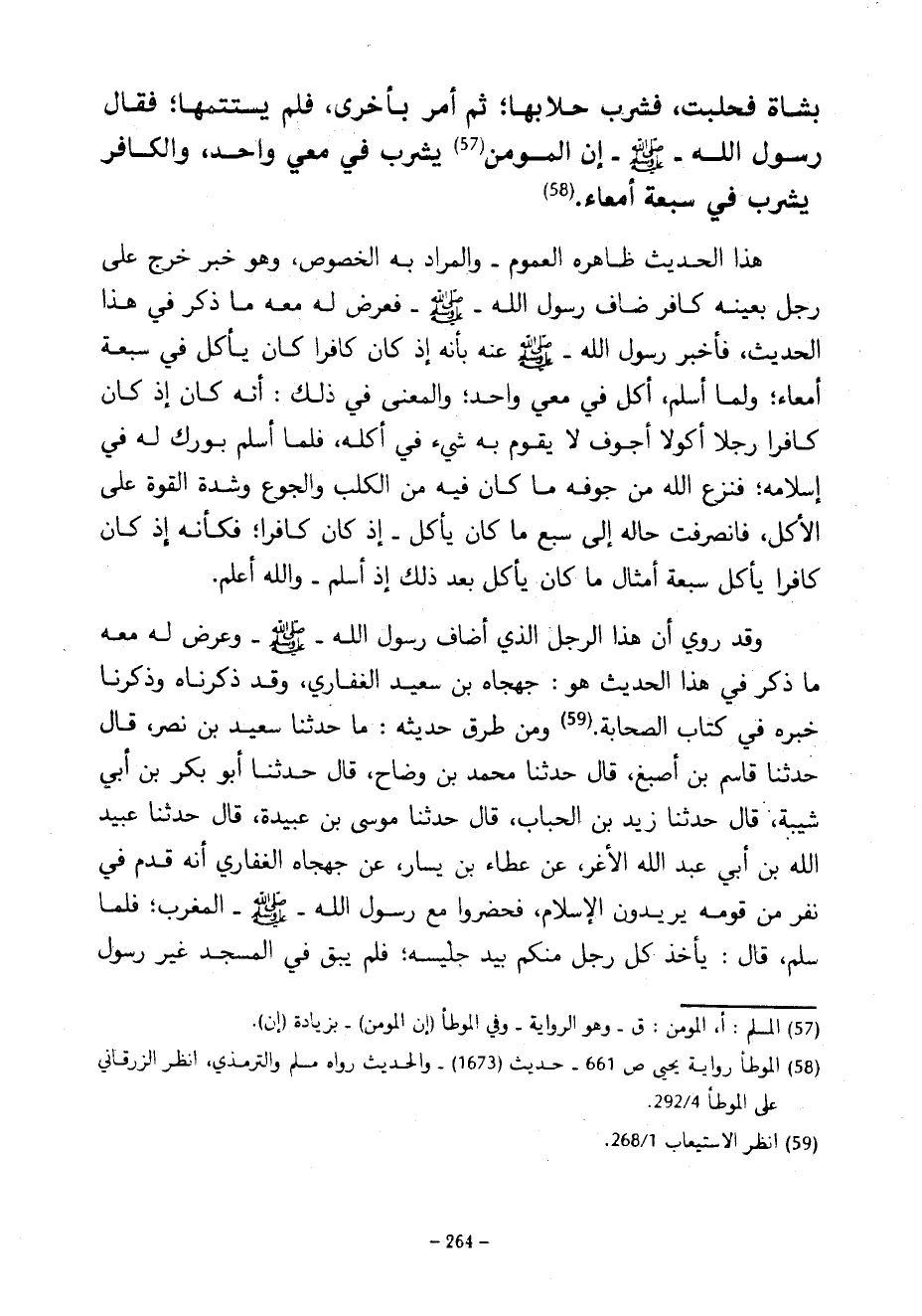 بِشَاةٍ فَحُلِبَتْ فَشَرِبَ حِلَابَهَا ثُمَّ أَمَرَ بِأُخْرَى فَلَمْ يَسْتَتِمَّهَا فَقَالَ رَسُولُ اللَّهِ صَلَّى اللَّهُ عَلَيْهِ وَسَلَّمَ إِنَّ الْمُؤْمِنَ يَشْرَبُ فِي مِعًى وَاحِدٍ وَالْكَافِرُ يَشْرَبُ فِي سَبْعَةِ أَمْعَاءٍ هَذَا الْحَدِيثُ ظَاهِرُهُ الْعُمُومُ وَالْمُرَادُ بِهِ الْخُصُوصُ وَهُوَ خَبَرٌ خَرَجَ عَلَى رَجُلٍ بِعَيْنِهِ كَافِرٍ ضَافَ رَسُولَ اللَّهِ صَلَّى اللَّهُ عَلَيْهِ وَسَلَّمَ فَعَرَضَ لَهُ مَعَهُ مَا ذُكِرَ فِي هَذَا الْحَدِيثِ فَأَخْبَرَ رَسُولَ اللَّهِ صَلَّى اللَّهُ عَلَيْهِ وَسَلَّمَ عَنْهُ بِأَنَّهُ إِذْ كَانَ كَافِرًا كَانَ يَأْكُلُ فِي سَبْعَةِ أَمْعَاءٍ وَلَمَّا أَسْلَمَ أَكَلَ فِي مِعًى وَاحِدٍ وَالْمَعْنَى فِي ذَلِكَ أَنَّهُ كَانَ إِذْ كَانَ كَافِرًا رَجُلًا أَكُولًا أَجْوَفَ لَا يَقُومُ بِهِ شَيْءٌ فِي أَكْلِهِ فَلَمَّا أَسْلَمَ بُورِكَ لَهُ فِي إِسْلَامِهِ فَنَزَعَ اللَّهُ مِنْ جَوْفِهِ مَا كَانَ فِيهِ مِنَ الْكَلَبِ وَالْجُوعِ وَشِدَّةِ الْقُوَّةِ عَلَى الْأَكْلِ فَانْصَرَفَتْ حَالُهُ إِلَى سُبُعِ مَا كَانَ يَأْكُلُ إِذْ كَانَ كَافِرًا فَكَأَنَّهُ إِذْ كَانَ كَافِرًا يَأْكُلُ سَبْعَةَ أَمْثَالِ مَا كَانَ يَأْكُلُ بَعْدَ ذَلِكَ إِذْ أَسْلَمْ وَاللَّهُ أَعْلَمُ وَقَدْ رُوِيَ أَنَّ هَذَا الرَّجُلَ الَّذِي أَضَافَ رَسُولَ اللَّهِ صَلَّى اللَّهُ عَلَيْهِ وَسَلَّمَ وَعَرَضَ لَهُ مَعَهُ مَا ذُكِرَ فِي هَذَا الْحَدِيثِ هُوَ جَهْجَاهُ بْنُ سَعِيدٍ الْغِفَارِيُّ وَقَدْ ذَكَرْنَاهُ وَذَكَرْنَا خَبَرَهُ فِي كِتَابِ الصَّحَابَةِ وَمِنْ طُرُقِ حَدِيثِهِ مَا حَدَّثَنَا سَعِيدُ بْنُ نَصْرٍ قَالَ حَدَّثَنَا قَاسِمُ بْنُ أَصْبَغَ قَالَ حَدَّثَنَا مُحَمَّدُ بْنُ وَضَّاحٍ قَالَ حَدَّثَنَا أَبُو بَكْرِ بْنُ أَبِي شَيْبَةَ قَالَ حَدَّثَنَا زَيْدُ بْنُ الْحُبَابِ قَالَ حَدَّثَنَا مُوسَىُ بْنُ عُبَيْدَةَ قَالَ حَدَّثَنَا عُبَيْدِ اللَّهِ بْنِ أَبِي عَبْدِ اللَّهِ الْأَغَرِّ عَنْ عَطَاءِ بْنِ يَسَارٍ عَنْ جَهْجَاهٍ الْغِفَارِيِّ أَنَّهُ قَدِمَ فِي نَفَرٍ مِنْ قَوْمِهِ يُرِيدُونَ الْإِسْلَامَ فَحَضَرُوا مَعَ رَسُولِ اللَّهِ صَلَّى اللَّهُ عَلَيْهِ وَسَلَّمَ الْمَغْرِبَ فَلَمَّا سَلَّمَ قال يأخذ كُلُّ رَجُلٍ مِنْكُمْ بِيَدِ جَلِيسِهِ فَلَمْ يَبْقَ فِي الْمَسْجِدِ غَيْرُ رَسُولِ