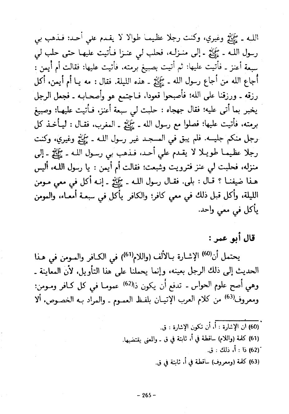 اللَّهِ صَلَّى اللَّهُ عَلَيْهِ وَسَلَّمَ وَغَيْرِي وَكُنْتُ رَجُلًا عَظِيمًا طِوَالًا لَا يُقَدُّمُ عَلَيَّ أَحَدٌ فَذَهَبَ بِي رَسُولُ اللَّهِ صَلَّى اللَّهُ عَلَيْهِ وَسَلَّمَ إِلَى مَنْزِلِهِ فَحَلَبَ لِي عَنْزًا فَأَتَيْتُ عَلَيْهَا حَتَّى حَلَبَ لِي سَبْعَةَ أَعْنُزٍ فَأَتَيْتُ عَلَيْهَا ثُمَّ أُتِيتُ بِصَبِيغٍ بِرُمَّتِهِ فَأَتَيْتُ عَلَيْهَا فَقَالَتْ أُمُّ أَيْمَنَ أَجَاعَ اللَّهُ مَنْ أَجَاعَ رَسُولُ اللَّهِ صَلَّى اللَّهُ عَلَيْهِ وَسَلَّمَ هَذِهِ اللَّيْلَةَ فَقَالَ مَهْ يَا أُمَّ أَيْمَنَ أَكَلَ رِزْقَهُ وَرِزْقُنَا عَلَى اللَّهِ فَأَصْبَحُوا قُعُودًا فَاجْتَمَعَ هُوَ وَأَصْحَابُهُ فَجَعَلَ الرَّجُلُ يُخْبِرُ بِمَا أَتَى عَلَيْهِ فَقَالَ جَهْجَاهٌ حُلِبَتْ لِي سَبْعَةُ أَعْنُزٍ فَأَتَيْتُ عَلَيْهَا وَصَبِيغٌ بِرُمَّتِهِ فَأَتَيْتُ عَلَيْهَا فَصَلَّوْا مَعَ رَسُولِ اللَّهِ صَلَّى اللَّهُ عَلَيْهِ وَسَلَّمَ الْمَغْرِبَ فَقَالَ لِيَأْخُذْ كُلُّ رَجُلٍ مِنْكُمْ جَلِيسَهُ فَلَمْ يَبْقَ فِي الْمَسْجِدِ غَيْرُ رَسُولِ اللَّهِ صَلَّى اللَّهُ عَلَيْهِ وَسَلَّمَ وَغَيْرِي وَكُنْتُ رَجُلًا عَظِيمًا طَوِيلًا لَا يُقَدُّمُ عَلَيَّ أَحَدٌ فَذَهَبَ بِي رَسُولُ اللَّهِ صَلَّى اللَّهُ عَلَيْهِ وَسَلَّمَ إِلَى مَنْزِلِهِ فَحُلِبَتْ لِي عَنْزٌ فَتَرَوَّيْتُ وَشَبِعْتُ فَقَالَتْ أُمُّ أَيْمَنَ يَا رَسُولَ اللَّهِ أَلَيْسَ هَذَا ضَيْفَنَا قَالَ بَلَى فَقَالَ رَسُولُ اللَّهِ صَلَّى اللَّهُ عَلَيْهِ وَسَلَّمَ إِنَّهُ أَكَلَ فِي مَعِيِّ مُؤْمِنٍ اللَّيْلَةَ وَأَكَلَ قَبْلَ ذَلِكَ فِي مَعِيِّ كَافِرٍ وَالْكَافِرُ يَأْكُلُ فِي سَبْعَةِ أَمْعَاءٍ وَالْمُؤْمِنُ يَأْكُلُ فِي مِعًى وَاحِدٍ قَالَ أَبُو عُمَرَ يُحْتَمَلُ أَنِ الْإِشَارَةَ بِالْأَلِفِ (وَاللَّامِ (61) فِي الكفار وَالْمُؤْمِنِ فِي هَذَا الْحَدِيثِ إِلَى ذَلِكَ الرَّجُلِ بِعَيْنِهِ وَإِنَّمَا يَحْمِلُنَا عَلَى هَذَا التَّأْوِيلِ لِأَنَّ الْمُعَايَنَةَ وَهِيَ أَصَحُّ عُلُومِ الْحَوَاسِّ تَدْفَعُ أَنْ يَكُونَ ذَا عُمُومًا فِي كُلِّ كَافِرٍ وَمُؤْمِنٍ وَمَعْرُوفٌ مِنْ كَلَامِ الْعَرَبِ الْإِتْيَانُ بِلَفْظِ الْعُمُومِ وَالْمُرَادُ بِهِ الْخُصُوصُ أَلَا