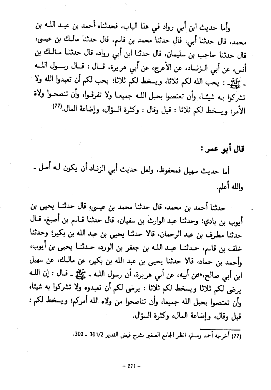 وَأَمَّا حَدِيثُ ابْنِ أَبِي رَوَّادٍ فِي هَذَا الْبَابِ فَحَدَّثَنَاهُ أَحْمَدُ بْنُ عَبْدِ اللَّهِ بْنِ مُحَمَّدٍ قَالَ حَدَّثَنَا أَبِي قَالَ حَدَّثَنَا مُحَمَّدُ بْنُ قَاسِمٍ قَالَ حَدَّثَنَا مَالِكُ بْنُ عِيسَى قَالَ حَدَّثَنَا حَاجِبُ بْنُ سُلَيْمَانَ قَالَ حَدَّثَنَا ابْنُ أَبِي رَوَّادٍ قَالَ حَدَّثَنَا مَالِكُ بْنُ أَنَسٍ عَنْ أَبِي الزِّنَادِ عَنِ الْأَعْرَجِ عَنْ أَبِي هُرَيْرَةَ قَالَ قَالَ رَسُولُ اللَّهِ صَلَّى اللَّهُ عَلَيْهِ وَسَلَّمَ يُحِبُّ اللَّهُ لَكُمْ ثَلَاثًا وَيَسْخَطُ لَكُمْ ثَلَاثًا يُحِبُّ لَكُمْ أَنْ تَعْبُدُوا اللَّهَ وَلَا تُشْرِكُوا بِهِ شَيْئًا وَأَنْ تَعْتَصِمُوا بِحَبْلِ اللَّهِ جَمِيعًا وَلَا تَفَرَّقُوا وَأَنْ تَنْصَحُوا وُلَاةَ الْأَمْرِ وَيَسْخَطُ لَكُمْ ثَلَاثًا قِيلَ وَقَالَ وَكَثْرَةَ السُّؤَالِ وَإِضَاعَةَ الْمَالِ قَالَ أَبُو عُمَرَ أَمَّا حَدِيثُ سُهَيْلٍ فَمَحْفُوظٌ وَلَعَلَّ حَدِيثَ أَبِي الزِّنَادِ أَنْ يَكُونَ لَهُ أَصْلٌ وَاللَّهُ أَعْلَمُ حَدَّثَنَا أَحْمَدُ بْنُ مُحَمَّدٍ قَالَ حَدَّثَنَا مُحَمَّدُ بْنُ عِيسَى قَالَ حَدَّثَنَا يَحْيَى بْنُ أَيُّوبَ بْنِ بَادِي وَحَدَّثَنَا عَبْدُ الْوَارِثِ بْنُ سُفْيَانَ قَالَ حَدَّثَنَا قَاسِمُ بْنُ أَصْبَغَ قَالَ حَدَّثَنَا مُطَرِّفُ بْنُ عبد الرحمان قَالَا حَدَّثَنَا يَحْيَى بْنُ عَبْدِ اللَّهِ بْنِ بُكَيْرٍ وَحَدَّثَنَا خَلَفُ بْنُ قَاسِمٍ حَدَّثَنَا عَبْدُ اللَّهِ بْنُ جَعْفَرِ بْنِ الْوَرْدِ حَدَّثَنَا يَحْيَى بْنُ أَيُّوبَ وَأَحْمَدُ بْنُ حَمَّادٍ قَالَا حَدَّثَنَا يَحْيَى بْنُ عَبْدِ اللَّهِ بْنِ بُكَيْرٍ عَنْ مالك عن سهيل ابن أَبِي صَالِحٍ عَنْ أَبِيهِ عَنْ أَبِي هُرَيْرَةَ أن رسول الله صلى الله عليه وسلم قَالَ إِنَّ اللَّهَ يَرْضَى لَكُمْ ثَلَاثًا وَيَسْخَطُ لَكُمْ ثَلَاثًا يَرْضَى لَكُمْ أَنْ تَعْبُدُوهُ وَلَا تُشْرِكُوا بِهِ شَيْئًا وَأَنْ تَعْتَصِمُوا بِحَبْلِ اللَّهِ جَمِيعًا وَأَنْ تُنَاصِحُوا مَنْ وَلَّاهُ اللَّهُ أَمْرَكُمْ وَيَسْخَطُ لَكُمْ قِيلَ وَقَالَ وَإِضَاعَةَ الْمَالِ وَكَثْرَةَ السؤال