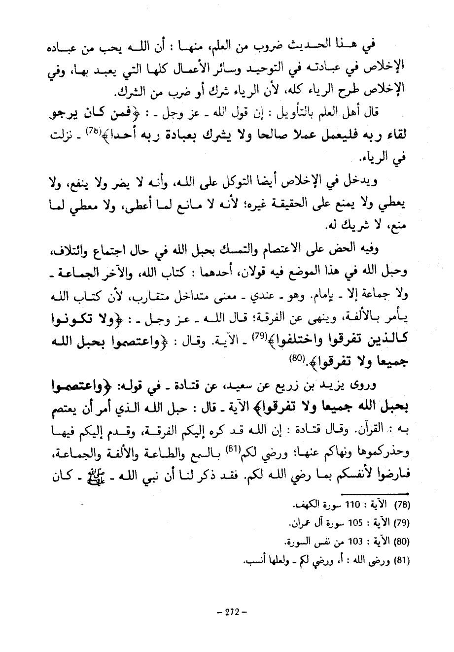 فِي هَذَا الْحَدِيثِ ضُرُوبٌ مِنَ الْعِلْمِ مِنْهَا أَنَّ اللَّهَ يُحِبُّ مِنْ عِبَادِهِ الْإِخْلَاصَ فِي عِبَادَتِهِ فِي التَّوْحِيدِ وَسَائِرِ الْأَعْمَالِ كُلِّهَا الَّتِي يُعْبَدُ بِهَا وَفِي الْإِخْلَاصِ طَرْحُ الرِّيَاءِ كُلِّهِ لِأَنَّ الرِّيَاءَ شِرْكٌ أَوْ ضَرْبٌ مِنَ الشِّرْكِ قَالَ أَهْلُ الْعِلْمِ بِالتَّأْوِيلِ إِنَّ قَوْلَ اللَّهِ عز وجل فمن كان يرجو لِقَاءَ رَبِّهِ فَلْيَعْمَلْ عَمَلًا صَالِحًا وَلَا يُشْرِكْ بِعِبَادَةِ رَبِّهِ أَحَدًا نَزَلَتْ فِي الرِّيَاءِ وَيَدْخُلُ فِي الْإِخْلَاصِ أَيْضًا التَّوَكُّلُ عَلَى اللَّهِ وَأَنَّهُ لَا يَضُرُّ وَلَا يَنْفَعُ وَلَا يُعْطِي وَلَا يَمْنَعُ عَلَى الْحَقِيقَةِ غَيْرُهُ لِأَنَّهُ لَا مَانِعَ لِمَا أَعْطَى وَلَا مُعْطِيَ لِمَا مَنَعَ لَا شَرِيكَ لَهُ وَفِيهِ الْحَضُّ عَلَى الِاعْتِصَامِ وَالتَّمَسُّكِ بِحَبْلِ اللَّهِ فِي حَالِ اجْتِمَاعٍ وَائْتِلَافٍ وَحَبْلُ اللَّهِ فِي هَذَا الْمَوْضِعِ فِيهِ قَوْلَانِ أَحَدُهُمَا كِتَابُ اللَّهِ وَالْآخَرُ الْجَمَاعَةُ وَلَا جَمَاعَةَ إِلَّا بِإِمَامٍ وَهُوَ عِنْدِي مَعْنَى مُتَدَاخِلٌ مُتَقَارِبٌ لِأَنَّ كِتَابَ اللَّهِ يَأْمُرُ بِالْأُلْفَةِ وَيَنْهَى عَنِ الْفُرْقَةِ قَالَ اللَّهُ عَزَّ وَجَلَّ وَلَا تَكُونُوا كَالَّذِينَ تَفَرَّقُوا وَاخْتَلَفُوا الْآيَةَ وَقَالَ وَاعْتَصِمُوا بِحَبْلِ اللَّهِ جَمِيعًا وَلَا تَفَرَّقُوا وَرَوَى يَزِيدُ بْنُ زُرَيْعٍ عَنْ سَعِيدٍ عَنْ قَتَادَةَ فِي قَوْلِهِ وَاعْتَصِمُوا بِحَبْلِ اللَّهِ جَمِيعًا وَلَا تَفَرَّقُوا الْآيَةَ قَالَ حَبْلُ اللَّهِ الَّذِي أَمَرَ أَنْ يُعْتَصَمَ بِهِ الْقُرْآنُ وَقَالَ قَتَادَةُ إِنَّ اللَّهَ قَدْ كَرِهَ إِلَيْكُمُ الْفُرْقَةَ وَقَدَّمَ إِلَيْكُمْ فِيهَا وَحَذَّرَكُمُوهَا وَنَهَاكُمْ عَنْهَا وَرَضِيَ لَكُمْ بِالسَّمْعِ وَالطَّاعَةِ وَالْأُلْفَةِ وَالْجَمَاعَةِ فَارْضَوْا لِأَنْفُسِكُمْ بِمَا رَضِيَ اللَّهُ لَكُمْ فَقَدْ ذُكِرَ لَنَا أَنَّ نَبِيَّ اللَّهِ صَلَّى اللَّهُ عَلَيْهِ وَسَلَّمَ كَانَ