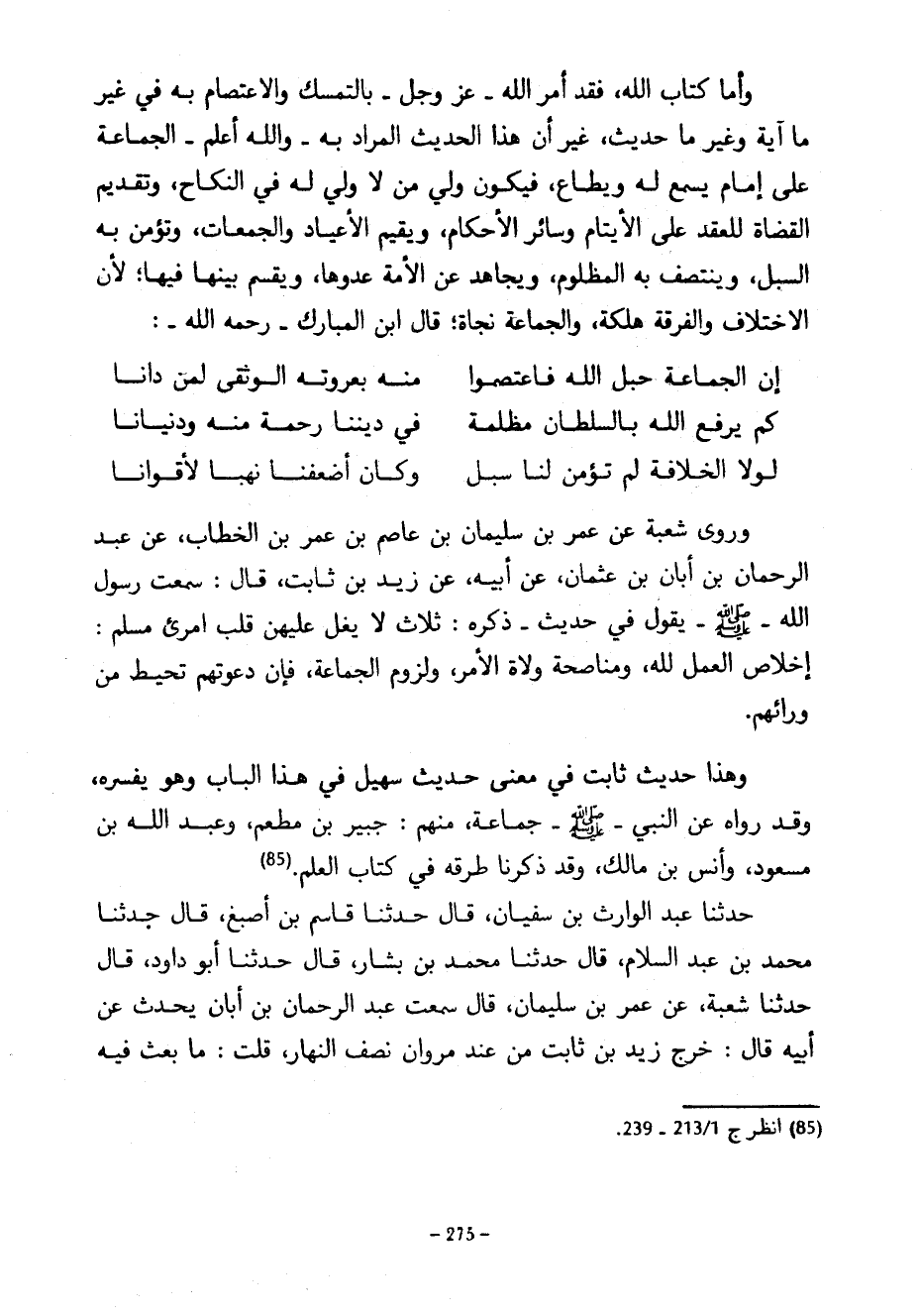 وَأَمَّا كِتَابُ اللَّهِ فَقَدْ أَمَرَ اللَّهُ عَزَّ وَجَلَّ بِالتَّمَسُّكِ وَالِاعْتِصَامِ بِهِ فِي غَيْرِ مَا آيَةٍ وَغَيْرِ مَا حَدِيثٍ غَيْرَ أَنَّ هَذَا الْحَدِيثَ الْمُرَادُ بِهِ وَاللَّهُ أَعْلَمُ الْجَمَاعَةُ عَلَى إِمَامٍ يُسْمَعُ لَهُ وَيُطَاعُ فَيَكُونُ وَلِيُّ مَنْ لَا وَلِيَّ لَهُ فِي النِّكَاحِ وَتَقْدِيمُ الْقُضَاةِ لِلْعَقْدِ عَلَى الْأَيْتَامِ وَسَائِرِ الْأَحْكَامِ وَيُقِيمُ الْأَعْيَادَ وَالْجُمُعَاتِ وَتُؤَمَّنُ بِهِ السُّبُلُ وَيَنْتَصِفُ بِهِ الْمَظْلُومُ ويجاهد عن الأمة عدوها ويقسم بينها فيها لِأَنَّ الِاخْتِلَافَ وَالْفُرْقَةَ هَلَكَةٌ وَالْجَمَاعَةَ نَجَاةٌ قَالَ ابْنُ الْمُبَارَكِ رَحِمَهُ اللَّهُ ... إِنِ الْجَمَاعَةَ حَبْلُ اللَّهِ فَاعْتَصَمُوا ... مِنْهُ بِعُرْوَتِهِ الْوُثْقَى لِمَنْ دَانَا ... ... ... كَمْ يَرْفَعُ اللَّهُ بِالسُّلْطَانِ مَظْلَمَةً ... فِي دِينِنَا رَحْمَةً مِنْهُ وَدُنْيَانَا ... ... لَوْلَا الْخِلَافَةُ لَمْ تُؤْمَنْ لَنَا سُبُلٌ ... ... وَكَانَ أَضْعَفُنَا نَهْبًا لِأَقْوَانَا ... وَرَوَى شُعْبَةُ عَنْ عُمَرَ بْنِ سُلَيْمَانَ بْنِ عَاصِمِ بْنِ عُمَرَ بْنِ الْخَطَّابِ عَنْ عبد الرحمان بْنِ أَبَانَ بْنِ عُثْمَانَ عَنْ أَبِيهِ عَنْ زَيْدِ بْنِ ثَابِتٍ قَالَ سَمِعْتُ رَسُولَ اللَّهِ صَلَّى اللَّهُ عَلَيْهِ وَسَلَّمَ يَقُولُ فِي حَدِيثٍ ذَكَرَهُ ثَلَاثٌ لَا يَغِلُّ عَلَيْهِنَّ قَلْبُ امْرِئٍ مُسْلِمٍ إِخْلَاصُ الْعَمَلِ لِلَّهِ وَمُنَاصَحَةُ وُلَاةِ الْأَمْرِ وَلُزُومُ الْجَمَاعَةِ فَإِنَّ دَعْوَتَهُمْ تُحِيطُ مِنْ وَرَائِهِمْ وَهَذَا حَدِيثٌ ثَابِتٌ فِي مَعْنَى حَدِيثِ سُهَيْلٍ فِي هَذَا الْبَابِ وَهُوَ يُفَسِّرُهُ وَقَدْ رَوَاهُ عَنِ النَّبِيِّ صَلَّى اللَّهُ عَلَيْهِ وَسَلَّمَ جَمَاعَةٌ مِنْهُمْ جُبَيْرُ بْنُ مَطْعِمٍ وَعَبْدُ اللَّهِ بْنُ مَسْعُودٍ وَأَنَسُ بْنُ مَالِكٍ وَقَدْ ذَكَرْنَا طُرُقَهُ فِي كِتَابِ الْعِلْمِ حَدَّثَنَا عَبْدُ الْوَارِثِ بْنُ سُفْيَانَ قَالَ حَدَّثَنَا قَاسِمُ بْنُ أَصْبَغَ قَالَ حَدَّثَنَا مُحَمَّدُ بْنُ عَبْدِ السَّلَامِ قَالَ حَدَّثَنَا مُحَمَّدُ بْنُ بَشَّارٍ قَالَ حَدَّثَنَا أَبُو دَاوُدَ قَالَ حَدَّثَنَا شُعْبَةُ عَنْ عُمَرَ بْنِ سُلَيْمَانَ قال سمعت عبد الرحمان بْنَ أَبَانَ يُحَدِّثُ عَنْ أَبِيهِ قَالَ خَرَجَ زَيْدُ بْنُ ثَابِتٍ مِنْ عِنْدِ مَرْوَانَ نِصْفَ النَّهَارِ قُلْتُ مَا بَعَثَ فِيهِ