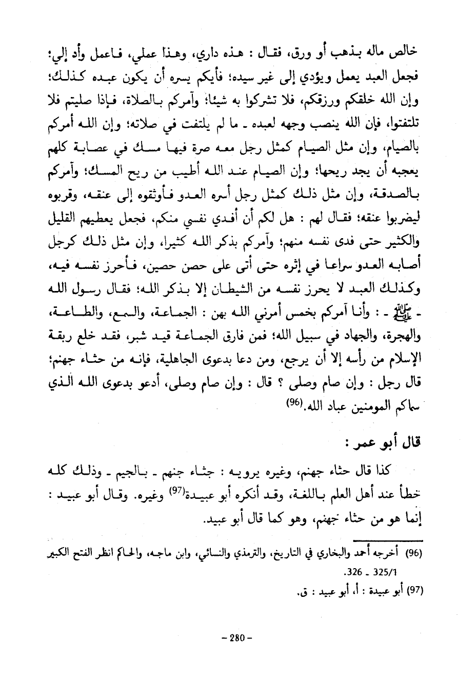 خَالِصِ مَالِهِ بِذَهَبٍ أَوْ وَرِقٍ فَقَالَ هَذِهِ دَارِي وَهَذَا عَمَلِي فَاعْمَلْ وَأَدِّ إِلَيَّ فَجَعَلَ الْعَبْدُ يَعْمَلُ وَيُؤَدِّي إِلَى غَيْرِ سَيِّدِهِ فَأَيُّكُمْ يَسُرُّهُ أَنْ يَكُونَ عَبْدُهُ كَذَلِكَ وَإِنَّ اللَّهَ خَلْقَكُمْ وَرَزَقَكُمْ فَلَا تُشْرِكُوا بِهِ شَيْئًا وَآمُرُكُمْ بِالصَّلَاةِ فَإِذَا صَلَّيْتُمْ فَلَا تَلْتَفِتُوا فَإِنَّ اللَّهَ يَنْصِبُ وَجْهَهُ لِعَبْدِهِ مَا لَمْ يَلْتَفِتْ فِي صَلَاتِهِ وَإِنَّ اللَّهَ أَمَرَكُمْ بِالصِّيَامِ وَإِنَّ مَثَلَ الصِّيَامِ كَمَثَلِ رَجُلٍ مَعَهُ صُرَّةٌ فِيهَا مِسْكٌ فِي عِصَابَةٍ كُلُّهُمْ يُعْجِبُهُ أَنْ يَجِدَ رِيحَهَا وَإِنَّ الصِّيَامَ عِنْدَ اللَّهِ أَطْيَبُ مِنْ رِيحِ الْمِسْكِ وَآمُرُكُمْ بِالصَّدَقَةِ وَإِنَّ مِثْلَ ذَلِكَ كَمَثَلِ رَجُلٍ أَسَرَهُ الْعَدُوُّ فَأَوْثَقُوهُ إِلَى عُنُقِهِ وَقَرَّبُوهُ لِيَضْرِبُوا عُنُقَهُ فَقَالَ لَهُمْ هَلْ لَكَمَ أَنْ أَفْدِيَ نَفْسِي مِنْكُمْ فَجَعَلَ يُعْطِيهِمُ الْقَلِيلَ وَالْكَثِيرَ حَتَّى فَدَى نَفْسَهُ مِنْهُمْ وَآمُرُكُمْ بِذِكْرِ اللَّهِ كَثِيرًا وَإِنَّ مِثْلَ ذَلِكَ كَرَجُلٍ أَصَابَهُ الْعَدُوُّ سِرَاعًا فِي إِثْرِهِ حَتَّى أَتَى عَلَى حِصْنٍ حَصِينٍ فَأَحْرَزَ نَفْسَهُ فِيهِ وَكَذَلِكَ الْعَبْدُ لَا يُحْرِزُ نَفْسَهُ مِنَ الشَّيْطَانِ إِلَّا بِذِكْرِ اللَّهِ فَقَالَ رَسُولُ اللَّهِ صَلَّى اللَّهُ عَلَيْهِ وَسَلَّمَ وَأَنَا آمُرُكُمْ بِخَمْسٍ أَمَرَنِي اللَّهُ بِهِنَّ الْجَمَاعَةُ وَالسَّمْعُ وَالطَّاعَةُ وَالْهِجْرَةُ وَالْجِهَادُ فِي سَبِيلِ اللَّهِ فَمَنْ فَارَقَ الْجَمَاعَةَ قِيدَ شِبْرٍ فَقَدْ خَلَعَ رِبْقَةَ الْإِسْلَامِ مِنْ رَأَسِهِ إِلَّا أَنْ يَرْجِعَ وَمَنْ دَعَا بِدَعْوَى الْجَاهِلِيَّةِ فَإِنَّهُ مِنْ حِثَاءِ جَهَنَّمَ قَالَ رَجُلٌ وَإِنْ صَامَ وَصَلَّى قَالَ وإن صام وصلى أدعو بِدَعْوَى اللَّهِ الَّذِي سِمَاكُمُ الْمُؤْمِنِينَ عِبَادَ اللَّهِ قَالَ أَبُو عُمَرَ كَذَا قَالَ حِثَاءُ جَهَنَّمَ وَغَيْرُهُ يَرْوِيهِ جُثَاءُ جَهَنَّمَ بِالْجِيمِ وَذَلِكَ كُلُّهُ خَطَأٌ عِنْدَ أَهْلِ الْعِلْمِ بِاللُّغَةِ وَقَدْ أَنْكَرَهُ أبو عبيدة وغيره ز وَقَالَ أَبُو عُبَيْدٍ إِنَّمَا هُوَ مِنْ حِثَاءِ جَهَنَّمَ وَهُوَ كَمَا قَالَ أَبُو عُبَيْدٍ