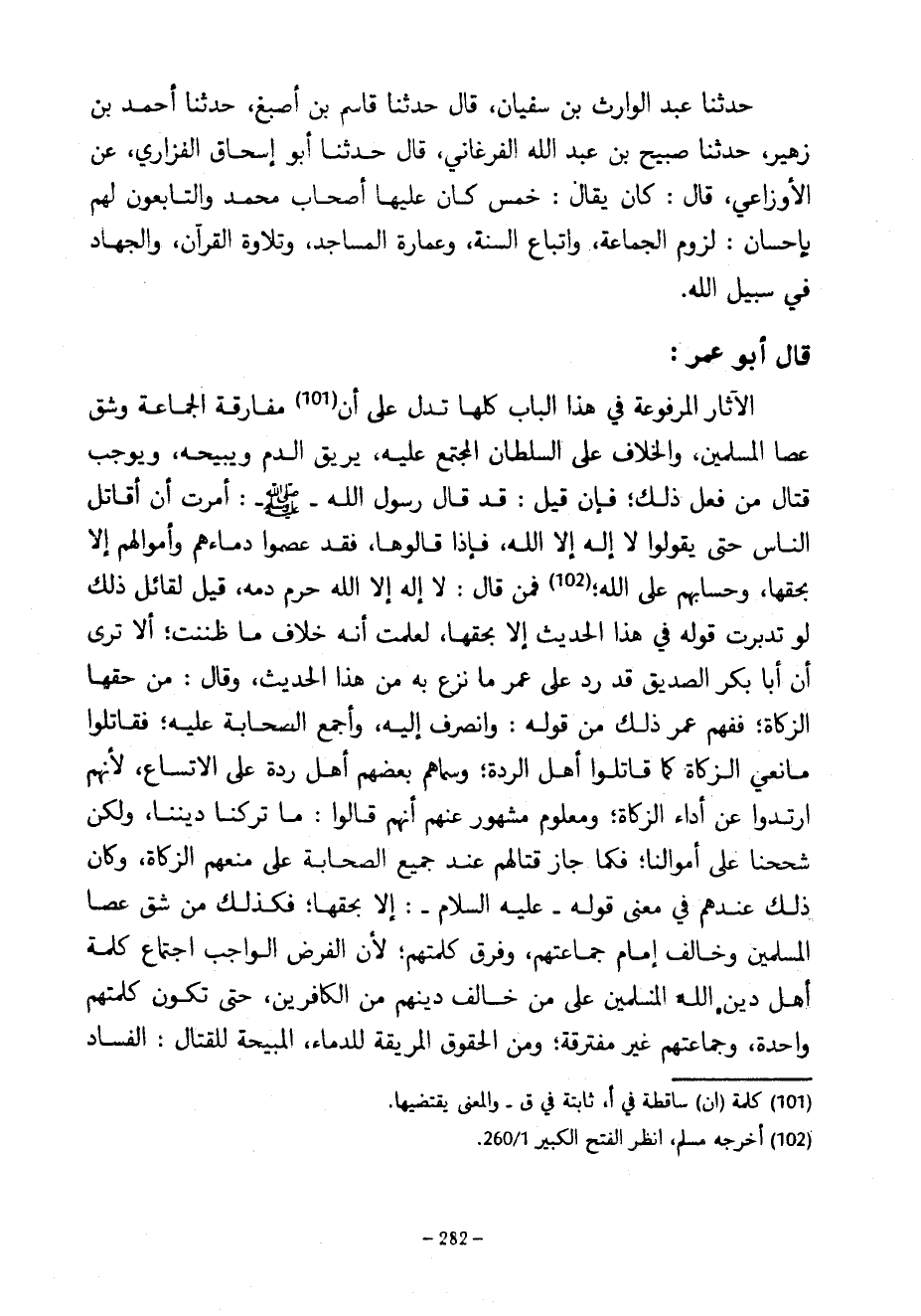 حَدَّثَنَا عَبْدُ الْوَارِثِ بْنُ سُفْيَانَ قَالَ حَدَّثَنَا قَاسِمُ بْنُ أَصْبَغَ حَدَّثَنَا أَحْمَدُ بْنُ زُهَيْرٍ حَدَّثَنَا صُبَيْحُ بْنُ عَبْدِ اللَّهِ الْفَرْغَانِيُّ قَالَ حَدَّثَنَا أَبُو إِسْحَاقَ الْفَزَارِيُّ عَنِ الْأَوْزَاعِيِّ قَالَ كَانَ يُقَالُ خَمْسٌ كَانَ عَلَيْهَا أَصْحَابُ مُحَمَّدٍ وَالتَّابِعُونَ لَهُمْ بِإِحْسَانٍ لُزُومُ الْجَمَاعَةِ وَاتِّبَاعُ السُّنَّةِ وَعِمَارَةُ الْمَسَاجِدِ وَتِلَاوَةُ الْقُرْآنِ وَالْجِهَادُ فِي سَبِيلِ اللَّهِ قَالَ أَبُو عُمَرَ الْآثَارُ الْمَرْفُوعَةُ فِي هَذَا الْبَابِ كُلُّهَا تَدُلُّ عَلَى أَنَّ مُفَارَقَةَ الْجَمَاعَةِ وَشَقَّ عَصَا الْمُسْلِمِينَ وَالْخِلَافَ عَلَى السُّلْطَانِ المجتمع عليه ويريق الدَّمَ وَيُبِيحُهُ وَيُوجِبُ قِتَالَ مَنْ فَعَلَ ذَلِكَ فَإِنْ قِيلَ قَدْ قَالَ رَسُولُ اللَّهِ صَلَّى اللَّهُ عَلَيْهِ وَسَلَّمَ أُمِرْتُ أَنْ أُقَاتِلَ النَّاسَ حَتَّى يَقُولُوا لَا إِلَهَ إِلَّا اللَّهُ فَإِذَا قَالُوهَا فَقَدْ عَصَمُوا دِمَاءَهُمْ وَأَمْوَالَهُمْ إِلَّا بِحَقِّهَا وَحِسَابُهُمْ عَلَى اللَّهِ فَمَنْ قَالَ لَا إِلَهَ إِلَّا اللَّهُ حُرِّمَ دَمُهُ قِيلَ لِقَائِلِ ذَلِكَ لَوْ تَدَبَّرْتَ قَوْلَهُ فِي هَذَا الْحَدِيثِ إِلَّا بِحَقِّهَا لَعَلِمْتَ أَنَّهُ خِلَافُ مَا ظَنَنْتَ أَلَا تَرَى أَنَّ أَبَا بَكْرٍ الصِّدِّيقَ قَدْ رَدَّ عَلَى عُمَرَ مَا نَزَعَ بِهِ مِنْ هَذَا الْحَدِيثِ وَقَالَ مِنْ حَقِّهَا الزَّكَاةُ فَفَهِمَ عُمَرُ ذَلِكَ مِنْ قَوْلِهِ وَانْصَرَفَ إِلَيْهِ وَأَجْمَعَ الصَّحَابَةُ عَلَيْهِ فَقَاتَلُوا مَانِعِي الزَّكَاةِ كَمَا قَاتَلُوا أَهْلَ الرِّدَّةِ وَسَمَّاهُمْ بَعْضُهُمْ أَهْلَ رِدَّةٍ عَلَى الِاتِّسَاعِ لِأَنَّهُمُ ارْتَدُّوا عَنْ أَدَاءِ الزَّكَاةِ وَمَعْلُومٌ مَشْهُورٌ عَنْهُمْ أَنَّهُمْ قَالُوا مَا تَرَكْنَا دِينَنَا وَلَكِنَّ شَحَحْنَا عَلَى أَمْوَالِنَا فَكَمَا جَازَ قِتَالُهُمْ عِنْدَ جَمِيعِ الصَّحَابَةِ عَلَى مَنْعِهِمُ الزَّكَاةَ وَكَانَ ذَلِكَ عِنْدَهُمْ فِي مَعْنَى قَوْلِهِ عَلَيْهِ السَّلَامُ إِلَّا بِحَقِّهَا فَكَذَلِكَ مَنْ شَقَّ عَصَا الْمُسْلِمِينَ وَخَالَفَ إِمَامَ جَمَاعَتِهِمْ وَفَرَّقَ كَلِمَتِهِمْ لِأَنَّ الْفَرْضَ الْوَاجِبَ اجْتِمَاعُ كَلِمَةِ أَهْلِ دِينِ اللَّهِ الْمُسْلِمِينَ عَلَى مَنْ خَالَفَ دِينَهُمْ مِنَ الْكَافِرِينَ حَتَّى تَكُونَ كَلِمَتُهُمْ وَاحِدَةً وَجَمَاعَتُهُمْ غَيْرَ مُفْتَرِقَةٍ وَمِنَ الْحُقُوقِ الْمُرِيقَةِ لِلدِّمَاءِ الْمُبِيحَةِ لِلْقِتَالِ الْفَسَادُ