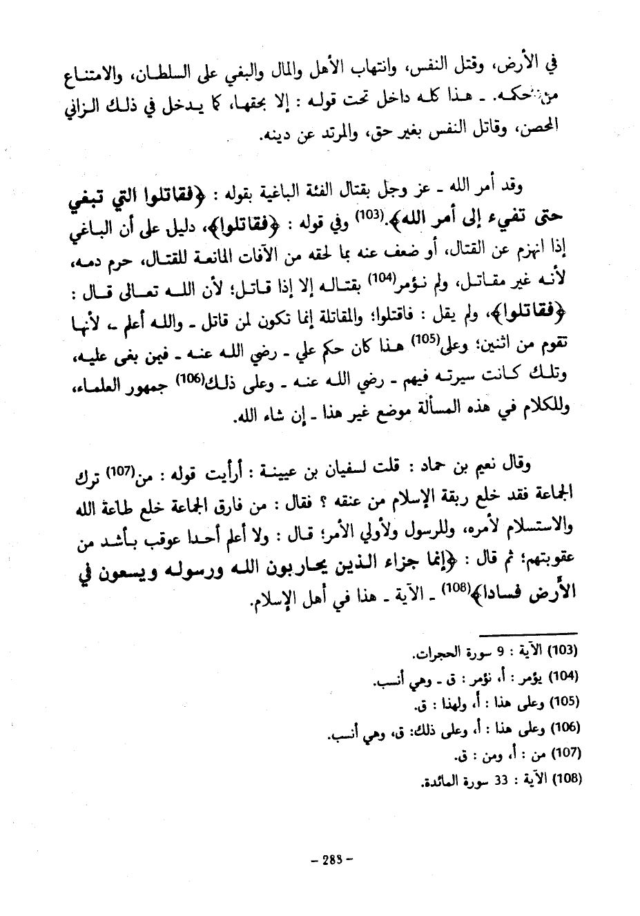 فِي الْأَرْضِ وَقَتْلُ النَّفْسِ وَانْتِهَابُ الْأَهْلِ وَالْمَالِ وَالْبَغْيُ عَلَى السُّلْطَانِ وَالِامْتِنَاعُ مِنْ حُكْمِهِ هَذَا كُلُّهُ دَاخِلٌ تَحْتَ قَوْلِهِ إِلَّا بِحَقِّهَا كَمَا يَدْخُلُ فِي ذَلِكَ الزَّانِي الْمُحْصَنُ وَقَاتَلُ النَّفْسِ بِغَيْرِ حَقٍّ وَالْمُرْتَدُّ عَنْ دِينِهِ وَقَدْ أَمَرَ اللَّهُ عَزَّ وَجَلَّ بِقِتَالِ الْفِئَةِ الْبَاغِيَةِ بِقَوْلِهِ فَقَاتِلُوا الَّتِي تَبْغِي حَتَّى تَفِيءَ إِلَى أَمْرِ اللَّهِ وَفِي قَوْلِهِ فَقَاتِلُوا دَلِيلٌ عَلَى أَنَّ الْبَاغِيَ إِذَا انْهَزَمَ عَنِ الْقِتَالِ أَوْ ضَعُفَ عَنْهُ بِمَا لَحِقَهُ مِنَ الْآفَاتِ الْمَانِعَةِ لِلْقِتَالِ حُرِّمَ دَمُهُ لِأَنَّهُ غَيْرُ مُقَاتِلٍ وَلَمْ نُؤْمَرْ بِقِتَالِهِ إِلَّا إِذَا قَاتَلَ لِأَنَّ اللَّهَ تَعَالَى قَالَ فَقَاتِلُوا وَلَمْ يَقُلْ فَاقْتُلُوا وَالْمُقَاتَلَةُ إِنَّمَا تَكُونُ لِمَنْ قَاتَلَ وَاللَّهُ أَعْلَمُ لِأَنَّهَا تَقُومُ مِنَ اثْنَيْنِ وَعَلَى هَذَا كَانَ حُكْمُ عَلِيٍّ رَضِيَ اللَّهُ عَنْهُ فِيمَنْ بَغَى عَلَيْهِ وَتِلْكَ كَانَتْ سِيرَتُهُ فِيهِمْ رَضِيَ اللَّهُ عَنْهُ وَعَلَى ذَلِكَ جُمْهُورُ الْعُلَمَاءِ وَلِلْكَلَامِ فِي هَذِهِ الْمَسْأَلَةِ مَوْضِعٌ غَيْرُ هَذَا إِنْ شَاءَ اللَّهُ وَقَالَ نُعَيْمُ بْنُ حَمَّادٍ قُلْتُ لِسُفْيَانَ بْنِ عُيَيْنَةَ أَرَأَيْتَ قَوْلَهُ مَنْ تَرَكَ الْجَمَاعَةَ فَقَدْ خَلَعَ رِبْقَةَ الْإِسْلَامِ مِنْ عُنُقِهِ فَقَالَ مَنْ فَارَقَ الْجَمَاعَةَ خَلَعَ طَاعَةَ اللَّهِ وَالِاسْتِسْلَامَ لِأَمْرِهِ وَلِلرَّسُولِ وَلِأُولِي الْأَمْرِ قَالَ وَلَا أَعْلَمُ أَحَدًا عُوقِبَ بِأَشَدِّ مِنْ عُقُوبَتِهِمْ ثُمَّ قَالَ إِنَّمَا جَزَاءُ الَّذِينَ يُحَارِبُونَ اللَّهَ وَرَسُولَهُ وَيَسْعَوْنَ فِي الْأَرْضِ فَسَادًا الْآيَةَ هَذَا فِي أَهْلِ الْإِسْلَامِ