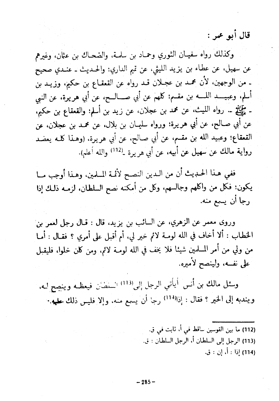 قَالَ أَبُو عُمَرَ وَكَذَلِكَ رَوَاهُ سُفْيَانُ الثَّوْرِيُّ وَحَمَّادُ بْنُ سَلَمَةَ وَالضَّحَّاكُ بْنُ عُثْمَانَ وَغَيْرُهُمْ عَنْ سُهَيْلٍ عَنْ عَطَاءِ بْنِ يَزِيدَ اللَّيْثِيِّ عَنْ تَمِيمٍ الدَّارِيِّ وَالْحَدِيثُ عِنْدِي صَحِيحٌ مِنَ الْوَجْهَيْنِ لِأَنَّ مُحَمَّدَ بْنَ عَجْلَانَ قَدْ رَوَاهُ عَنِ الْقَعْقَاعِ بْنِ حَكِيمٍ وَزَيْدِ بْنِ أَسْلَمَ وَعُبَيْدِ اللَّهِ بْنِ مِقْسَمٍ كُلُّهُمْ عَنْ أَبِي صَالِحٍ عَنْ أَبِي هُرَيْرَةَ عَنِ النَّبِيِّ صَلَّى اللَّهُ عَلَيْهِ وَسَلَّمَ رَوَاهُ اللَّيْثُ عَنْ مُحَمَّدُ بْنُ عَجْلَانَ عَنْ زَيْدِ بْنِ أَسْلَمَ وَالْقَعْقَاعِ بْنِ حَكِيمٍ عَنْ أَبِي صَالِحٍ عَنْ أَبِي هُرَيْرَةَ وَرَوَاهُ سُلَيْمَانَ بْنِ بِلَالٍ عَنْ مُحَمَّدِ بْنِ عَجْلَانَ عَنِ الْقَعْقَاعِ وَعُبَيْدِ اللَّهِ بْنِ مِقْسَمٍ عَنْ أَبِي صَالِحٍ عَنْ أَبِي هُرَيْرَةَ (وَهَذَا كُلُّهُ يُعَضِّدُ رِوَايَةَ مَالِكٍ عَنْ سُهَيْلٍ عَنْ أَبِيهِ عَنْ أَبِي هُرَيْرَةَ (112) وَاللَّهُ أَعْلَمُ) فَفِي هَذَا الْحَدِيثِ أَنَّ مِنَ الدِّينِ النُّصْحَ لِأَئِمَّةِ الْمُسْلِمِينَ وَهَذَا أَوْجَبَ مَا يَكُونُ فَكُلُّ مَنْ وَاكَلَهُمْ وَجَالَسَهُمْ وَكُلُّ مَنْ أَمْكَنَهُ نُصْحَ السُّلْطَانِ لَزِمَهُ ذَلِكَ إِذَا رَجَا أَنْ يُسْمَعَ مِنْهُ وَرَوَى مَعْمَرٌ عَنِ الزُّهْرِيِّ عَنِ السَّائِبِ بْنِ يَزِيدَ قَالَ قَالَ رَجُلٌ لِعُمَرَ بْنِ الْخَطَّابِ أَلَّا أَخَافُ فِي اللَّهِ لَوْمَةَ لَائِمٍ خَيْرٌ لِي أَمْ أُقْبِلُ عَلَى أَمْرِي فَقَالَ أَمَّا مَنْ وَلِيَ مِنْ أَمْرِ الْمُسْلِمِينَ شَيْئًا فَلَا يَخْفَ فِي اللَّهِ لَوْمَةَ لَائِمٍ وَمَنْ كَانَ خِلْوًا فَلْيُقْبِلْ عَلَى نَفْسِهِ وَلِيَنْصَحْ لِأَمِيرِهِ وَسُئِلَ مَالِكُ بْنُ أَنَسٍ أَيَأْتِي الرَّجُلُ إِلَى السُّلْطَانِ فَيَعِظُهُ وَيَنْصَحُ لَهُ وَيَنْدُبُهُ إِلَى الْخَيْرِ فَقَالَ إِذَا رَجَا أَنْ يَسْمَعَ مِنْهُ وَإِلَّا فَلَيْسَ ذَلِكَ عَلَيْهِ