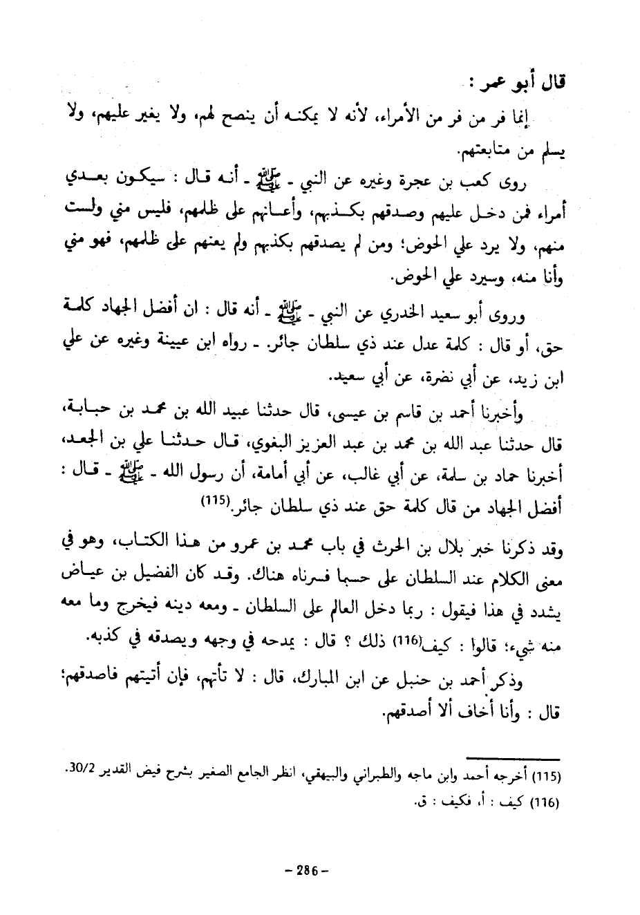 قَالَ أَبُو عُمَرَ إِنَّمَا فَرَّ مَنْ فَرَّ مِنَ الْأُمَرَاءِ لِأَنَّهُ لَا يُمْكِنُهُ أَنْ يَنْصَحَ لَهُمْ وَلَا يُغَيِّرَ عَلَيْهِمْ وَلَا يَسْلَمَ مِنْ مُتَابَعَتِهِمْ رَوَى كَعْبُ بْنُ عُجْرَةَ وَغَيْرُهُ عَنِ النَّبِيِّ صَلَّى اللَّهُ عَلَيْهِ وَسَلَّمَ أَنَّهُ قَالَ سَيَكُونُ بَعْدِي أُمَرَاءُ فَمَنْ دَخَلَ عَلَيْهِمْ وَصَدَّقَهُمْ بِكَذِبِهِمْ وَأَعَانَهُمْ عَلَى ظُلْمِهِمْ فَلَيْسَ مِنِّي وَلَسْتُ مِنْهُمْ وَلَا يَرِدُ عَلَى الْحَوْضِ وَمَنْ لَمْ يُصَدِّقْهُمْ بِكَذِبِهِمْ وَلَمْ يُعِنْهُمْ عَلَى ظُلْمِهِمْ فَهُوَ مِنِّي وَأَنَا مِنْهُ وَسَيَرِدُ عَلَيَّ الْحَوْضَ وَرَوَى أَبُو سَعِيدٍ الْخُدْرِيُّ عَنِ النَّبِيِّ صَلَّى اللَّهُ عَلَيْهِ وَسَلَّمَ أَنَّهُ قَالَ إِنَّ أَفْضَلَ الْجِهَادِ كَلِمَةُ حَقٍّ أَوْ قَالَ كَلِمَةُ عَدْلٍ عِنْدَ ذِي سُلْطَانٍ جَائِرٍ رَوَاهُ ابْنُ عُيَيْنَةَ وَغَيْرُهُ عن علي ابن زَيْدٍ عَنْ أَبِي نَضْرَةَ عَنْ أَبِي سَعِيدٍ وَأَخْبَرَنَا أَحْمَدُ بْنُ قَاسِمِ بْنِ عِيسَى قَالَ حَدَّثَنَا عُبَيْدُ اللَّهِ بْنُ مُحَمَّدِ بْنِ حَبَابَةَ قَالَ حَدَّثَنَا عَبْدُ اللَّهِ بْنُ مُحَمَّدِ بْنِ عَبْدِ الْعَزِيزِ الْبَغَوِيُّ قَالَ حَدَّثَنَا عَلِيُّ بْنُ الْجَعْدِ أَخْبَرَنَا حَمَّادُ بْنُ سَلَمَةَ عَنْ أَبِي غَالِبٍ عَنْ أَبِي أُمَامَةَ أَنَّ رَسُولَ اللَّهِ صَلَّى اللَّهُ عَلَيْهِ وَسَلَّمَ قَالَ أَفْضَلُ الْجِهَادِ مَنْ قَالَ كَلِمَةَ حَقٍّ عِنْدَ ذِي سُلْطَانٍ جائز وقد ذكرنا خبر بلال بن الحرث فِي بَابِ مُحَمَّدِ بْنِ عَمْرٍو مِنْ هَذَا الْكِتَابِ وَهُوَ فِي مَعْنَى الْكَلَامِ عِنْدَ السُّلْطَانِ عَلَى حَسْبَمَا فَسَّرْنَاهُ هُنَاكَ وَقَدْ كَانَ الْفُضَيْلُ بْنُ عِيَاضٍ يُشَدِّدُ فِي هَذَا فَيَقُولُ رُبَّمَا دَخَلَ الْعَالَمُ عَلَى السُّلْطَانِ وَمَعَهُ دِينُهُ فَيَخْرُجُ وَمَا مَعَهُ مِنْهُ شَيْءٌ قَالُوا كَيْفَ ذَلِكَ قَالَ يَمْدَحُهُ فِي وَجْهِهِ وَيُصَدِّقُهُ فِي كَذِبِهِ وَذَكَرَ أَحْمَدُ بْنُ حَنْبَلٍ عَنِ ابْنِ الْمُبَارَكِ قَالَ لَا تَأْتِهِمْ فَإِنْ أَتَيْتَهُمْ فَاصْدُقْهُمْ قَالَ وَأَنَا أَخَافُ أَلَّا أَصْدُقَهُمْ