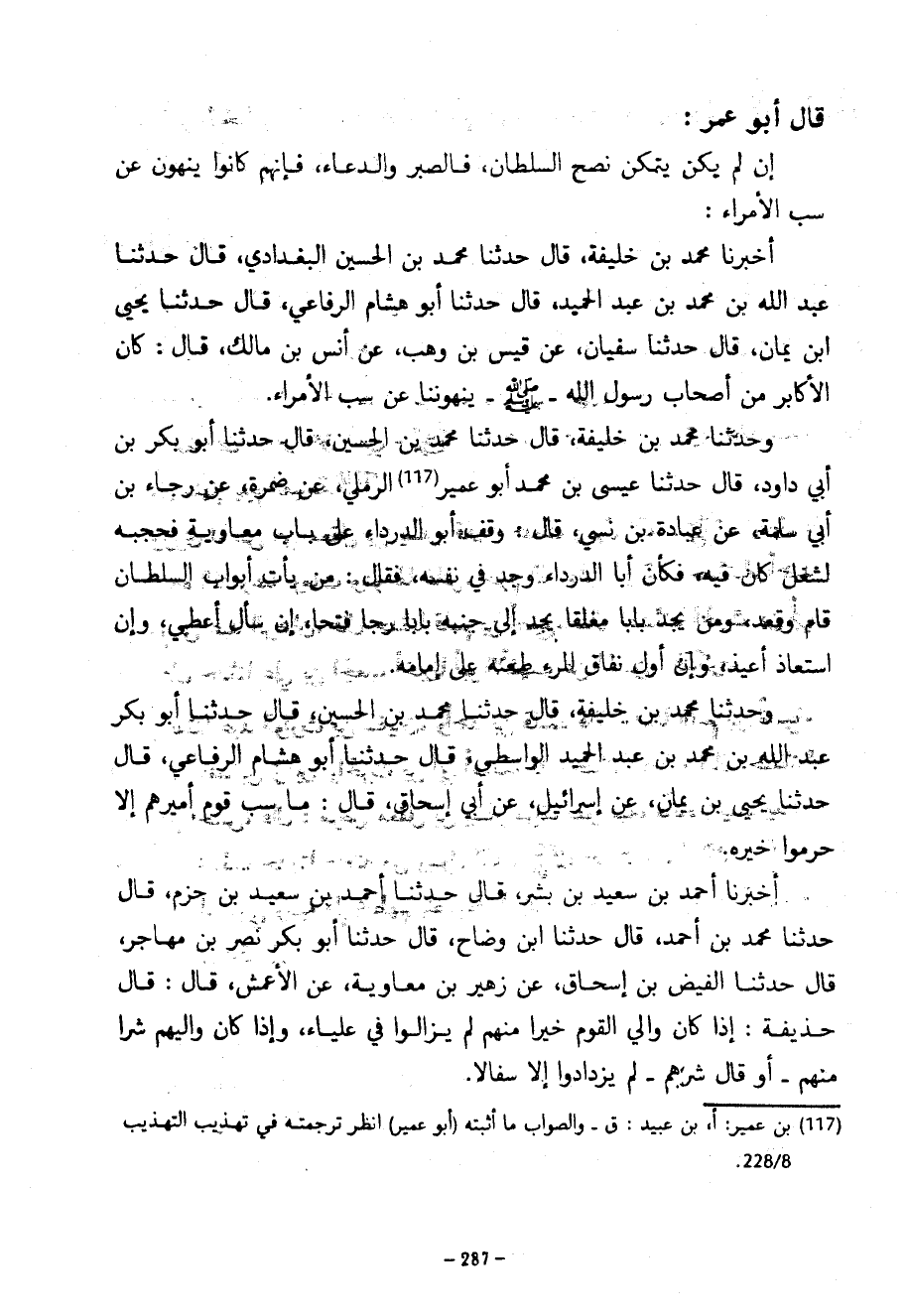 قَالَ أَبُو عُمَرَ إِنْ لَمْ يَكُنْ يَتَمَكَّنُ نُصْحَ السُّلْطَانِ فَالصَّبْرُ وَالدُّعَاءُ فَإِنَّهُمْ كَانُوا يَنْهَوْنَ عَنْ سَبِّ الْأُمَرَاءِ أَخْبَرَنَا مُحَمَّدُ بْنُ خَلِيفَةَ قَالَ حَدَّثَنَا مُحَمَّدُ بْنُ الْحُسَيْنِ الْبَغْدَادِيُّ قَالَ حَدَّثَنَا عَبْدُ اللَّهِ بْنُ مُحَمَّدِ بْنِ عَبْدِ الْحَمِيدِ قَالَ حَدَّثَنَا أَبُو هِشَامٍ الرِّفَاعِيُّ قَالَ حدثنا يحيى ابن يَمَانٍ قَالَ حَدَّثَنَا سُفْيَانُ عَنْ قَيْسِ بْنِ وَهْبٍ عَنْ أَنَسِ بْنِ مَالِكٍ قَالَ كَانَ الْأَكَابِرُ مِنْ أَصْحَابِ رَسُولِ اللَّهِ صَلَّى اللَّهُ عَلَيْهِ وَسَلَّمَ يَنْهَوْنَنَا عَنْ سَبِّ الْأُمَرَاءِ وَحَدَّثَنَا مُحَمَّدُ بْنُ خَلِيفَةَ قَالَ حَدَّثَنَا مُحَمَّدُ بْنُ الْحُسَيْنِ قَالَ حَدَّثَنَا أَبُو بَكْرِ بْنُ أَبِي دَاوُدَ قَالَ حَدَّثَنَا عِيسَى بْنُ مُحَمَّدٍ أَبُو عُمَيْرٍ الرَّمْلِيُّ عَنْ ضَمْرَةَ عَنْ رَجَاءِ بْنِ أَبِي سَلَمَةَ عَنْ عُبَادَةَ بْنِ نُسَيٍّ قَالَ وَقَفَ أَبُو الدَّرْدَاءِ عَلَى بَابِ مُعَاوِيَةَ فَحَجَبَهُ لِشُغْلٍ كَانَ فِيهِ فَكَأَنَّ أَبَا الدَّرْدَاءِ وَجَدَ فِي نَفْسِهِ فَقَالَ مَنْ يَأْتِ أَبْوَابَ السُّلْطَانِ قَامَ وَقَعَدَ وَمَنْ يَجِدْ بَابًا مُغْلَقًا يَجِدْ إِلَى جَنْبِهِ بَابًا رَجَا فَتْحًا إِنْ سَأَلَ أُعْطِيَ وَإِنِ اسْتَعَاذَ أُعِيذَ وَإِنَّ أَوَّلَ نِفَاقِ الْمَرْءِ طَعْنُهُ عَلَى إِمَامِهِ وَحَدَّثَنَا مُحَمَّدُ بْنُ خَلِيفَةَ قَالَ حَدَّثَنَا مُحَمَّدُ بْنُ الْحُسَيْنِ قَالَ حَدَّثَنَا أَبُو بَكْرٍ عَبْدُ اللَّهِ بْنُ مُحَمَّدِ بْنِ عَبْدِ الْحَمِيدِ الْوَاسِطِيُّ قَالَ حَدَّثَنَا أَبُو هِشَامٍ الرِّفَاعِيُّ قَالَ حَدَّثَنَا يَحْيَى بْنُ يَمَانٍ عَنْ إِسْرَائِيلَ عَنْ أَبِي إِسْحَاقَ قَالَ مَا سَبَّ قَوْمٌ أَمِيرَهُمْ إِلَّا حُرِمُوا خَيْرَهُ أَخْبَرَنَا أَحْمَدُ بْنُ سَعِيدِ بْنِ بِشْرٍ قَالَ حَدَّثَنَا أَحْمَدُ بْنُ سَعِيدِ بْنِ حَزْمٍ قَالَ حَدَّثَنَا مُحَمَّدُ بْنُ أَحْمَدَ قَالَ حَدَّثَنَا ابْنُ وَضَّاحٍ قَالَ حَدَّثَنَا أَبُو بَكْرٍ نَصْرُ بْنُ مُهَاجِرٍ قَالَ حَدَّثَنَا الْفَيْضُ بْنُ إِسْحَاقَ عَنْ زُهَيْرِ بْنِ مُعَاوِيَةَ عَنِ الْأَعْمَشِ قَالَ قَالَ حُذَيْفَةُ إِذَا كَانَ وَالِي الْقَوْمِ خَيْرًا مِنْهُمْ لَمْ يَزَالُوا فِي عَلْيَاءَ وَإِذَا كَانَ وَالِيهُمْ شَرًّا مِنْهُمْ أَوْ قَالَ شَرُّهُمْ لَمْ يَزْدَادُوا إِلَّا سفالا