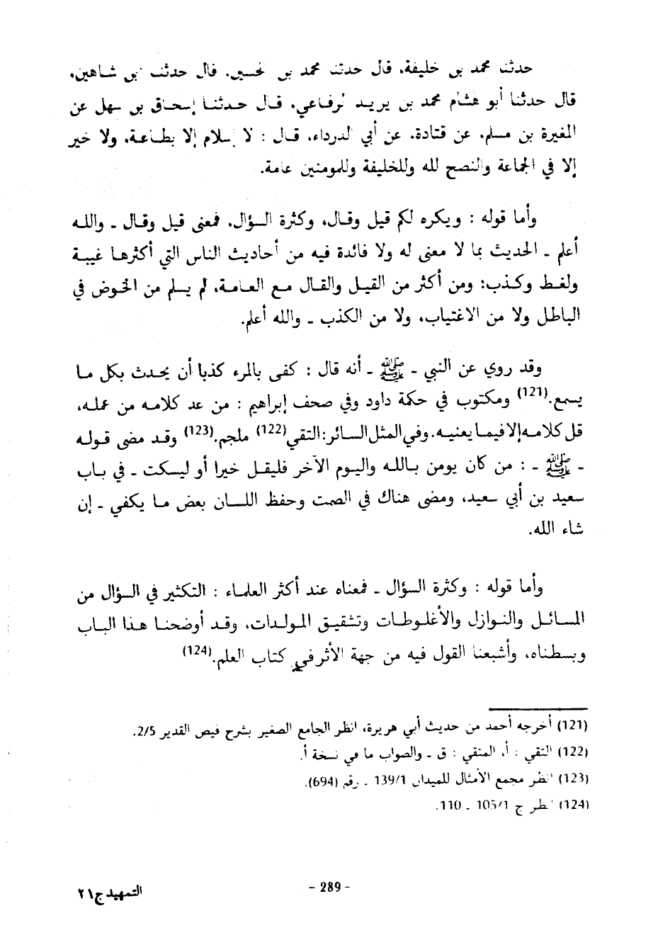 حَدَّثَنَا مُحَمَّدُ بْنُ خَلِيفَةَ قَالَ حَدَّثَنَا مُحَمَّدُ بْنُ الْحُسَيْنِ قَالَ حَدَّثَنَا ابْنُ شَاهِينَ قَالَ حَدَّثَنَا أَبُو هِشَامٍ مُحَمَّدُ بْنُ يَزِيدَ الرِّفَاعِيُّ قَالَ حَدَّثَنَا إِسْحَاقُ بْنُ سَهْلٍ عَنِ الْمُغِيرَةِ بْنِ مُسْلِمٍ عَنْ قَتَادَةَ عَنْ أَبِي الدَّرْدَاءِ قَالَ لَا إِسْلَامَ إِلَّا بِطَاعَةٍ وَلَا خَيْرَ إِلَّا فِي الْجَمَاعَةِ وَالنُّصْحِ لِلَّهِ وَلِلْخَلِيفَةِ وَلِلْمُؤْمِنِينَ عَامَّةً وَأَمَّا قَوْلُهُ وَيَكْرَهُ لَكُمْ قِيلَ وَقَالَ وَكَثْرَةَ السُّؤَالِ فَمَعْنَى قِيلَ وَقَالَ وَاللَّهُ اعلم الحديث بما لا معنى لا وَلَا فَائِدَةَ فِيهِ مِنْ أَحَادِيثِ النَّاسِ الَّتِي أَكْثَرُهَا غِيبَةٌ وَلَغَطٌ وَكَذِبٌ وَمَنْ أَكْثَرَ مِنَ الْقِيلِ وَالْقَالِ مَعَ الْعَامَّةِ لَمْ يَسْلَمْ مِنَ الْخَوْضِ فِي الْبَاطِلِ وَلَا مِنَ الِاغْتِيَابِ وَلَا مِنَ الْكَذِبِ وَاللَّهُ أَعْلَمُ وَقَدْ رُوِيَ عَنِ النَّبِيِّ صَلَّى اللَّهُ عَلَيْهِ وَسَلَّمَ أَنَّهُ قَالَ كَفَى بِالْمَرْءِ كَذِبًا أَنْ يُحَدِّثَ بِكُلِّ مَا يَسْمَعُ وَمَكْتُوبٌ فِي حِكْمَةِ دَاوُدَ وَفِي صُحُفِ إِبْرَاهِيمَ مَنْ عَدَّ كَلَامَهُ مِنْ عَمَلِهِ قَلَّ كَلَامُهُ إِلَّا فِيمَا يَعْنِيهِ وَفِي الْمَثَلِ السَّائِرِ التَّقِيُّ مُلْجَمٌ وَقَدْ مَضَى قَوْلُهُ صَلَّى اللَّهُ عَلَيْهِ وَسَلَّمَ مَنْ كَانَ يُؤْمِنُ بِاللَّهِ وَالْيَوْمِ الْآخِرِ فَلْيَقُلْ خَيْرًا أَوْ لِيَسْكُتْ فِي بَابِ سَعِيدِ بْنِ أَبِي سَعِيدٍ وَمَضَى هُنَاكَ فِي الصَّمْتِ وَحِفْظِ اللِّسَانِ بَعْضُ مَا يَكْفِي إِنْ شَاءَ اللَّهُ وَأَمَّا قَوْلُهُ وَكَثْرَةَ السُّؤَالِ فَمَعْنَاهُ عِنْدَ أَكْثَرِ الْعُلَمَاءِ التَّكْثِيرُ فِي السُّؤَالِ مِنَ الْمَسَائِلِ وَالنَّوَازِلِ وَالْأُغْلُوطَاتِ وَتَشْقِيقِ الْمُوَلَّدَاتِ وَقَدْ أَوْضَحْنَا هَذَا الْبَابَ وَبَسَطْنَاهُ وَأَشْبَعْنَا الْقَوْلَ فِيهِ مِنْ جِهَةِ الْأَثَرِ فِي كِتَابِ الْعِلْمِ