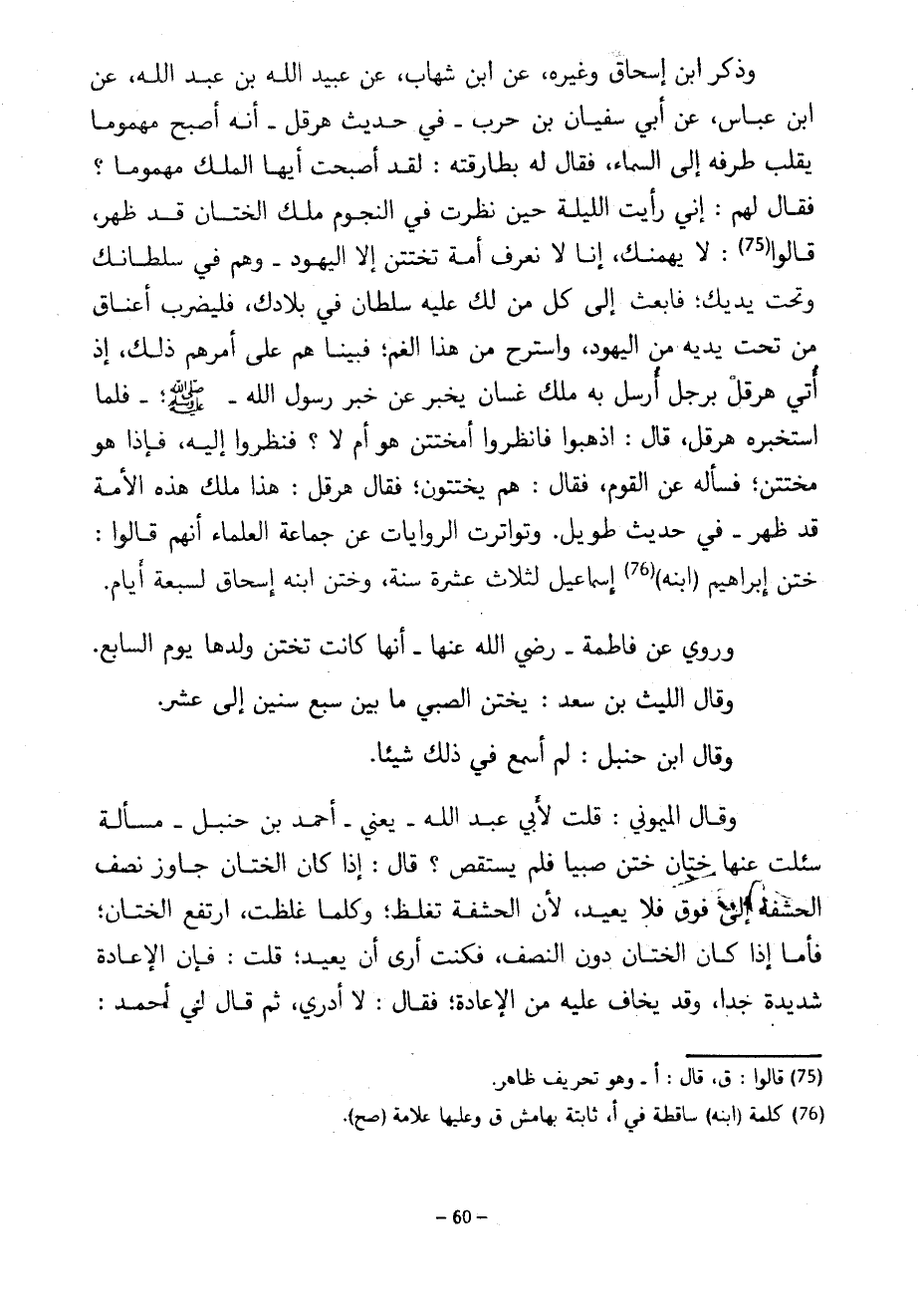 وَذَكَرَ ابْنُ إِسْحَاقَ وَغَيْرُهُ عَنِ ابْنِ شِهَابٍ عَنْ عُبَيْدِ اللَّهِ بْنِ عَبْدِ الله عن ابْنِ عَبَّاسٍ عَنْ أَبِي سُفْيَانَ بْنِ حَرْبٍ فِي حَدِيثِ هِرَقْلَ أَنَّهُ أَصْبَحَ مَهْمُومًا يُقَلِّبُ طَرَفَهُ إِلَى السَّمَاءِ فَقَالَ لَهُ بَطَارِقَتُهُ لَقَدْ أَصْبَحْتَ أَيُّهَا الْمَلِكُ مَهْمُومًا فَقَالَ لَهُمْ إِنِّي رَأَيْتُ اللَّيْلَةَ حِينَ نَظَرْتُ فِي النُّجُومِ مَلِكَ الْخِتَانِ قَدْ ظَهَرَ قَالُوا لَا يُهِمَّنَّكَ إِنَّا لَا نَعْرِفُ أُمَّةً تَخْتَتِنُ إِلَّا الْيَهُودُ وَهُمْ فِي سُلْطَانِكَ وَتَحْتَ يَدَيْكَ فَابْعَثْ إِلَى كُلِّ مَنْ لَكَ عَلَيْهِ سُلْطَانٌ فِي بِلَادِكَ فَلْيَضْرِبْ أَعْنَاقَ مَنْ تَحْتَ يَدَيْهِ مِنَ الْيَهُودِ وَاسْتَرِحْ من هذا الغم فبينا هم عَلَى أَمْرِهِمْ ذَلِكَ إِذْ أُتِيَ هِرَقْلُ بِرَجُلٍ أَرْسَلَ بِهِ مَلِكُ غَسَّانَ يُخْبِرُ عَنْ خَبَرِ رَسُولُ اللَّهِ صَلَّى اللَّهُ عَلَيْهِ وَسَلَّمَ فَلَمَّا اسْتَخْبَرَهُ هِرَقْلُ قَالَ اذْهَبُوا فَانْظُرُوا أَمُخْتَتِنٌ هُوَ أَمْ لَا فَنَظَرُوا إِلَيْهِ فَإِذَا هُوَ مُخْتَتِنٌ فسأله عن القوم فقال هم يختتون فَقَالَ هِرَقْلُ هَذَا مَلِكُ هَذِهِ الْأُمَّةِ قَدْ ظَهَرَ فِي حَدِيثٍ طَوِيلٍ وَتَوَاتَرَتِ الرِّوَايَاتُ عَنْ جَمَاعَةِ الْعُلَمَاءِ أَنَّهُمْ قَالُوا خَتَنَ إِبْرَاهِيمُ (ابْنَهُ) إِسْمَاعِيلَ لِثَلَاثَ عَشْرَةَ سَنَةً وَخَتَنَ ابْنَهُ إِسْحَاقَ لِسَبْعَةِ أَيَّامٍ وَرُوِيَ عَنْ فَاطِمَةَ رَضِيَ اللَّهُ عَنْهَا أَنَّهَا كَانَتْ تَخْتِنُ وَلَدَهَا يَوْمَ السَّابِعِ وَقَالَ اللَّيْثُ بْنُ سَعْدٍ يُخْتَنُ الصَّبِيُّ مَا بَيْنَ سَبْعِ سِنِينَ إِلَى عَشْرٍ وَقَالَ ابْنُ حَنْبَلٍ لَمْ أَسْمَعْ فِي ذَلِكَ شَيْئًا وَقَالَ الْمَيْمُونِيُّ قُلْتُ لِأَبِي عَبْدِ اللَّهِ يَعْنِي أَحْمَدَ بْنَ حَنْبَلٍ مَسْأَلَةً سُئِلْتُ عَنْهَا خَتَّانٌ خَتَنَ صَبِيًّا فَلَمْ يَسْتَقْصِ قَالَ إِذَا كَانَ الْخِتَانُ جَاوَزَ نِصْفَ الْحَشَفَةِ إِلَى فَوْقٍ فَلَا يُعِيدُ لِأَنَّ الْحَشَفَةَ تَغْلُظُ وَكُلَّمَا غَلُظَتِ ارْتَفَعَ الْخِتَانُ فَأَمَّا إِذَا كَانَ الْخِتَانُ دُونَ النِّصْفِ فَكُنْتُ أَرَى أَنْ يُعِيدَ قُلْتُ فَإِنَّ الْإِعَادَةَ شَدِيدَةٌ جِدًّا وَقَدْ يُخَافُ عَلَيْهِ مِنَ الْإِعَادَةِ فَقَالَ لَا أَدْرِي ثُمَّ قَالَ لِي أَحْمَدُ