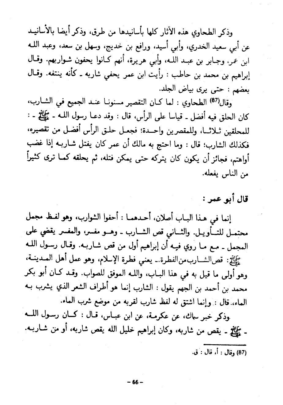 وَذَكَرَ الطَّحَاوِيُّ هَذِهِ الْآثَارَ كُلَّهَا بِأَسَانِيدِهَا مِنْ طُرُقٍ وَذَكَرَ أَيْضًا بِالْأَسَانِيدِ عَنْ أَبِي سَعِيدٍ الْخُدْرِيِّ وَأَبِي أُسَيْدٍ وَرَافِعِ بْنِ خَدِيجٍ وَسَهْلِ بن سعد وعبد الله ابن عُمَرَ وَجَابِرِ بْنِ عَبْدِ اللَّهِ وَأَبِي هُرَيْرَةَ أَنَّهُمْ كَانُوا يَحِفُّونَ شَوَارِبَهُمْ وَقَالَ إِبْرَاهِيمُ بْنُ مُحَمَّدِ بْنِ حَاطِبٍ رَأَيْتُ ابْنَ عُمَرَ يُحْفِي شَارِبَهُ كَأَنَّهُ يَنْتِفُهُ وَقَالَ بَعْضُهُمْ حَتَّى يَرَى بَيَاضَ الْجِلْدِ وَقَالَ الطَّحَاوِيُّ لَمَّا كَانَ التَّقْصِيرُ مَسْنُونًا عِنْدَ الْجَمِيعِ فِي الشَّارِبِ كَانَ الْحَلْقُ فِيهِ أَفْضَلَ قِيَاسًا عَلَى الرَّأْسِ قَالَ وَقَدْ دَعَا رَسُولَ اللَّهِ صَلَّى اللَّهُ عَلَيْهِ وَسَلَّمَ لِلْمُحَلِّقِينَ ثَلَاثًا وَلِلْمُقَصِّرِينَ وَاحِدَةً فَجَعَلَ حَلْقَ الرَّأْسِ أَفْضَلَ مِنْ تَقْصِيرِهِ فَكَذَلِكَ الشَّارِبُ قَالَ وَمَا احْتَجَّ بِهِ مَالِكٌ أَنَّ عُمَرَ كَانَ يَفْتِلُ شَارِبَهُ إِذَا غَضِبَ أَوِ اهْتَمَّ فَجَائِزٌ أَنْ يَكُونَ كَانَ يَتْرُكُهُ حَتَّى يُمْكِنَ فَتْلُهُ ثُمَّ يَحْلِقُهُ كَمَا تَرَى كَثِيرًا مِنَ النَّاسِ يَفْعَلُهُ قَالَ أَبُو عُمَرَ إِنَّمَا فِي هَذَا الْبَابِ أَصْلَانِ أَحَدُهُمَا أَحْفُوا الشَّوَارِبَ وَهُوَ لَفْظٌ مُجْمَلٌ مُحْتَمِلٌ لِلتَّأْوِيلِ وَالثَّانِي قَصُّ الشَّارِبِ وَهُوَ مُفَسِّرٌ وَالْمُفَسِّرُ يَقْضِي عَلَى الْمُجْمَلِ مَعَ مَا رُوِيَ فِيهِ أَنَّ إِبْرَاهِيمَ أَوَّلُ مَنْ قَصَّ شَارِبَهُ وَقَالَ رَسُولُ اللَّهِ صَلَّى اللَّهُ عَلَيْهِ وَسَلَّمَ قَصُّ الشَّارِبِ مِنَ الْفِطْرَةِ يَعْنِي فِطْرَةَ الْإِسْلَامِ وَهُوَ عَمَلُ أَهْلِ الْمَدِينَةِ وَهُوَ أَوْلَى مَا قِيلَ بِهِ فِي هَذَا الْبَابِ وَاللَّهُ الْمُوَفِّقُ لِلصَّوَابِ وَقَدْ كَانَ أَبُو بَكْرٍ مُحَمَّدُ بْنُ أَحْمَدَ بْنِ الْجَهْمِ يَقُولُ الشَّارِبُ إِنَّمَا هُوَ أَطْرَافُ الشَّعْرِ الَّذِي يَشْرَبُ بِهِ الْمَاءَ قَالَ وَإِنَّمَا اشْتُقَّ لَهُ لَفْظُ شَارِبٍ لِقُرْبِهِ مِنْ مَوْضِعِ شُرْبِ الْمَاءِ وَذُكِرَ خَبَرُ سَمَّاكٌ عَنْ عِكْرِمَةَ عَنِ ابْنِ عَبَّاسٍ قَالَ كَانَ رَسُولُ اللَّهِ صَلَّى اللَّهُ عَلَيْهِ وَسَلَّمَ يَقُصُّ مِنْ شَارِبِهِ وَكَانَ إِبْرَاهِيمُ خَلِيلُ اللَّهِ يَقُصُّ شَارِبَهُ أَوْ مِنْ شَارِبِهِ
