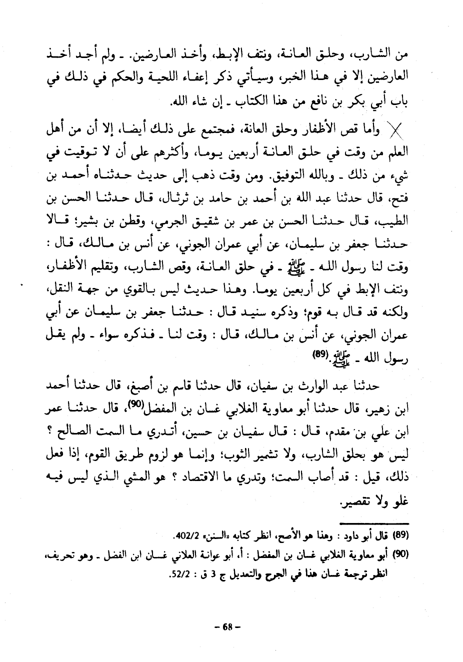 مِنَ الشَّارِبِ وَحَلْقُ الْعَانَةِ وَنَتْفُ الْإِبِطِ وَأَخْذُ الْعَارِضَيْنِ وَلَمْ أَجِدْ أَخْذَ الْعَارِضَيْنِ إِلَّا فِي هَذَا الْخَبَرِ وَسَيَأْتِي ذِكْرُ إِعْفَاءِ اللِّحْيَةِ وَالْحُكْمِ فِي ذَلِكَ فِي بَابِ أَبِي بَكْرِ بْنِ نَافِعٍ مِنْ هَذَا الْكِتَابِ إِنْ شَاءَ اللَّهُ وَأَمَّا قَصُّ الْأَظْفَارِ وَحَلْقُ الْعَانَةِ فَمُجْتَمَعٌ عَلَى ذَلِكَ أَيْضًا إِلَّا أَنَّ مِنْ أَهْلِ الْعِلْمِ مَنْ وَقَّتَ فِي حَلْقِ الْعَانَةِ أَرْبَعِينَ يَوْمًا وَأَكْثَرُهُمْ عَلَى أَنْ لَا تَوْقِيتَ فِي شَيْءٍ مِنْ ذَلِكَ وَبِاللَّهِ التَّوْفِيقُ وَمَنْ وَقَّتَ ذَهَبَ إِلَى حَدِيثٌ حَدَّثَنَاهُ أَحْمَدُ بْنُ فَتْحٍ قَالَ حَدَّثَنَا عَبْدُ اللَّهِ بْنُ أَحْمَدَ بْنِ حَامِدِ بْنِ ثَرْثَالٍ قَالَ حَدَّثَنَا الْحَسَنُ بْنُ الطَّيِّبِ قَالَ حَدَّثَنَا الْحَسَنُ بْنُ عُمَرَ بْنِ شَقِيقٍ الْجَرْمِيُّ وَقَطَنُ بْنُ بَشِيرٍ قَالَا حَدَّثَنَا جَعْفَرُ بْنُ سُلَيْمَانَ عَنْ أَبِي عِمْرَانَ الْجَوْنِيِّ عَنْ أَنَسِ بْنِ مَالِكٍ قَالَ وَقَّتَ لَنَا رَسُولُ اللَّهِ صَلَّى اللَّهُ عَلَيْهِ وَسَلَّمَ فِي حَلْقِ الْعَانَةِ وَقَصِّ الشَّارِبِ وَتَقْلِيمِ الْأَظْفَارِ وَنَتْفِ الْإِبِطِ فِي كُلِّ أَرْبَعِينَ يَوْمًا وَهَذَا حَدِيثٌ لَيْسَ بِالْقَوِيِّ مِنْ جِهَةِ النَّقْلِ وَلَكِنَّهُ قَدْ قَالَ بِهِ قَوْمٌ وَذَكَرَهُ سُنَيْدٌ قَالَ حَدَّثَنَا جَعْفَرُ بْنُ سُلَيْمَانَ عَنْ أَبِي عِمْرَانَ الْجَوْنِيِّ عَنْ أَنَسِ بْنِ مَالِكٍ قَالَ وَقَّتَ لَنَا فَذَكَرَهُ سَوَاءً وَلَمْ يَقُلْ رَسُولِ اللَّهِ صَلَّى اللَّهُ عَلَيْهِ وَسَلَّمَ حَدَّثَنَا عَبْدُ الْوَارِثِ بْنُ سُفْيَانَ قَالَ حَدَّثَنَا قَاسِمُ بْنُ أَصْبَغَ قَالَ حَدَّثَنَا أحمد ابن زُهَيْرٍ قَالَ حَدَّثَنَا أَبُو مُعَاوِيَةَ الْغَلَابِيُّ غَسَّانُ بن المفضل قال حدثنا عمر ابن عَلِيِّ بْنِ مُقَدَّمٍ قَالَ قَالَ سُفْيَانُ بْنُ حُسَيْنٍ أَتَدْرِي مَا السَّمْتُ الصَّالِحُ لَيْسَ هُوَ بِحَلْقِ الشَّارِبِ وَلَا تَشْمِيرِ الثَّوْبِ وَإِنَّمَا هُوَ لُزُومُ طَرِيقِ الْقَوْمِ إِذَا فَعَلَ ذَلِكَ قِيلَ قَدْ أَصَابَ السَّمْتَ وَتَدْرِي مَا الِاقْتِصَادُ هُوَ الْمَشْيُ الَّذِي لَيْسَ فِيهِ غُلُوٌّ وَلَا تَقْصِيرٌ