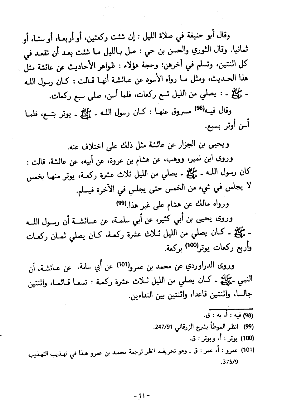 وَقَالَ أَبُو حَنِيفَةَ فِي صَلَاةِ اللَّيْلِ إِنْ شِئْتَ رَكْعَتَيْنِ أَوْ أَرْبَعًا أَوْ سِتًّا أَوْ ثَمَانِيًا وَقَالَ الثَّوْرِيُّ وَالْحَسَنُ بْنُ حَيٍّ صَلِّ بِاللَّيْلِ مَا شِئْتَ بَعْدَ أَنْ تَقْعُدَ فِي كُلِّ اثْنَتَيْنِ وَتُسَلِّمَ فِي آخِرِهِنَّ وَحُجَّةُ هَؤُلَاءِ ظَوَاهِرُ الْأَحَادِيثِ عَنْ عَائِشَةَ مِثْلُ هَذَا الْحَدِيثِ وَمِثْلُ مَا رَوَاهُ الْأَسْوَدُ عَنْ عَائِشَةَ أَنَّهَا قَالَتْ كَانَ رَسُولُ اللَّهِ صَلَّى اللَّهُ عَلَيْهِ وَسَلَّمَ يُصَلِّي مِنَ اللَّيْلِ تِسْعَ رَكَعَاتٍ فَلَمَّا أَسَنَّ صَلَّى سَبْعَ رَكَعَاتٍ وَقَالَ فِيهِ مَسْرُوقٌ عَنْهَا كَانَ رَسُولُ اللَّهِ صَلَّى اللَّهُ عَلَيْهِ وَسَلَّمَ يُوتِرُ بِتِسْعٍ فَلَمَّا أَسَنَّ أَوْتَرَ بِسَبْعٍ وَيَحْيَى بْنُ الْجَزَّارِ عَنْ عَائِشَةَ مِثْلُ ذَلِكَ عَلَى اخْتِلَافٍ عَنْهُ وَرَوَى ابْنُ نُمَيْرٍ وَوَهْبٌ عَنْ هِشَامِ بْنِ عُرْوَةَ عَنْ أَبِيهِ عَنْ عَائِشَةَ قَالَتْ كَانَ رَسُولُ اللَّهِ صَلَّى اللَّهُ عَلَيْهِ وَسَلَّمَ يُصَلِّي مِنَ اللَّيْلِ ثَلَاثَ عَشْرَةَ رَكْعَةً يُوتِرُ مِنْهَا بِخَمْسٍ لَا يَجْلِسُ فِي شَيْءٍ مِنَ الْخَمْسِ حَتَّى يَجْلِسَ فِي الْآخِرَةِ فَيُسَلِّمَ وَرَوَاهُ مَالِكٌ عَنْ هِشَامٍ عَلَى غَيْرِ هَذَا وَرَوَى يَحْيَى بْنُ أَبِي كَثِيرٍ عَنْ أَبِي سَلَمَةَ عَنْ عَائِشَةَ أَنَّ رَسُولَ اللَّهِ صَلَّى اللَّهُ عَلَيْهِ وَسَلَّمَ كَانَ يُصَلِّي مِنَ اللَّيْلِ ثَلَاثَ عَشْرَةَ رَكْعَةً كَانَ يُصَلِّي ثَمَانَ رَكَعَاتٍ وَأَرْبَعَ رَكَعَاتٍ يُوتِرُ بِرَكْعَةٍ وَرَوَى الدَّرَاوَرْدِيُّ عَنْ مُحَمَّدِ بْنِ عَمْرٍو عَنْ أَبِي سَلَمَةَ عَنْ عَائِشَةَ أَنَّ النَّبِيَّ صَلَّى اللَّهُ عَلَيْهِ وَسَلَّمَ كَانَ يُصَلِّي مِنَ اللَّيْلِ ثَلَاثَ عَشْرَةَ رَكْعَةً تِسْعًا قَائِمًا وَاثْنَتَيْنِ جَالِسًا وَاثْنَتَيْنِ قَاعِدًا وَاثْنَتَيْنِ بَيْنَ النِّدَاءَيْنِ
