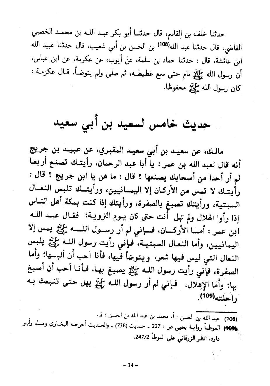 حَدِيثٌ خَامِسٌ لِسَعِيدِ بْنِ أَبِي سَعِيدٍ مَالِكٍ عَنْ سَعِيدِ بْنِ أَبِي سَعِيدٍ الْمَقْبُرِيِّ عَنْ عُبَيْدِ بْنِ جُرَيْجٍ أَنَّهُ قَالَ لِعَبْدِ اللَّهِ بْنِ عُمَرَ يَا أَبَا عبد الرحمان رَأَيْتُكَ تَصْنَعُ أَرْبَعًا لَمْ أَرَ أَحَدًا مِنْ أَصْحَابِكَ يَصْنَعُهَا قَالَ مَا هُنَّ يَا ابْنَ جُرَيْجٍ قَالَ رَأَيْتُكَ لَا تَمَسُّ مِنَ الْأَرْكَانِ إِلَّا الْيَمَانِيَيْنِ وَرَأَيْتُكَ تَلْبَسُ النِّعَالَ السِّبْتِيَّةَ وَرَأَيْتُكَ تَصْبُغُ بِالصُّفْرَةِ وَرَأَيْتُكَ إِذَا كُنْتَ بِمَكَّةَ أَهَلَّ النَّاسُ إِذَا رَأَوُا الْهِلَالَ وَلَمْ تُهِلَّ أَنْتَ حَتَّى كَانَ يَوْمُ التَّرْوِيَةِ فَقَالَ عَبْدُ اللَّهِ ابن عُمَرَ أَمَّا الْأَرْكَانُ فَإِنِّي لَمْ أَرَ رَسُولَ اللَّهِ صَلَّى اللَّهُ عَلَيْهِ وَسَلَّمَ يَمَسُّ إِلَّا الْيَمَانِيَيْنِ وَأَمَّا النِّعَالُ السِّبْتِيَّةُ فَإِنِّي رَأَيْتُ رَسُولَ اللَّهِ صَلَّى اللَّهُ عَلَيْهِ وَسَلَّمَ يَلْبَسُ النِّعَالَ الَّتِي لَيْسَ فِيهَا شَعْرٌ وَيَتَوَضَّأُ فِيهَا فَأَنَا أُحِبُّ أَنْ أَلْبَسَهَا وَأَمَّا الصُّفْرَةُ فَإِنِّي رَأَيْتُ رَسُولَ اللَّهِ صَلَّى اللَّهُ عَلَيْهِ وَسَلَّمَ يصبغ بِهَا فَأَنَا أُحِبُّ أَنْ أَصْبُغَ بِهَا وَأَمَّا الْإِهْلَالُ فَإِنِّي لَمْ أَرَ رَسُولَ اللَّهِ صَلَّى اللَّهُ عَلَيْهِ وَسَلَّمَ يُهِلُّ حَتَّى تَنْبَعِثَ بِهِ راحلته