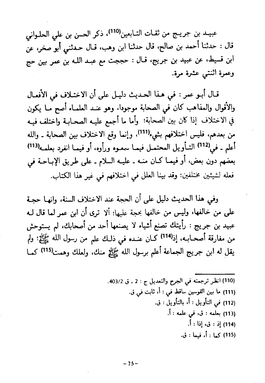 عُبَيْدُ بْنُ جُرَيْجٍ مِنْ ثِقَاتِ التَّابِعِينَ ذَكَرُ الْحَسَنُ بْنُ عَلِيٍّ الْحُلْوَانِيُّ قَالَ حَدَّثَنَا أَحْمَدُ بْنُ صَالِحٍ قَالَ حَدَّثَنَا ابْنُ وَهْبٍ قَالَ حَدَّثَنِي أَبُو صَخْرٍ عَنِ ابْنِ قُسَيْطٍ عَنْ عُبَيْدِ بْنِ جُرَيْجٍ قَالَ حَجَجْتُ مَعَ عَبْدِ اللَّهِ بْنِ عُمَرَ بَيْنَ حَجٍّ وَعُمْرَةٍ اثْنَتَيْ عَشْرَةَ مَرَّةً قَالَ أَبُو عُمَرَ فِي هَذَا الْحَدِيثِ دَلِيلٌ عَلَى أَنَّ الِاخْتِلَافَ فِي الْأَفْعَالِ وَالْأَقْوَالِ وَالْمَذَاهِبِ كَانَ فِي الصَّحَابَةِ مَوْجُودًا وَهُوَ عِنْدَ الْعُلَمَاءِ أَصَحُّ مَا يَكُونُ فِي الِاخْتِلَافِ إِذَا كَانَ بَيْنَ الصَّحَابَةِ وَأَمَّا مَا أَجْمَعَ عَلَيْهِ الصَّحَابَةُ وَاخْتَلَفَ فِيهِ مَنْ بَعْدَهُمْ فَلَيْسَ اخْتِلَافُهُمْ بِشَيْءٍ وَإِنَّمَا وَقَعَ الِاخْتِلَافُ بَيْنَ الصَّحَابَةِ وَاللَّهُ أَعْلَمُ فِي التَّأْوِيلِ الْمُحْتَمَلِ فِيمَا سَمِعُوهُ وَرَأَوْهُ أَوْ فِيمَا انْفَرَدَ بِعِلْمِهِ بَعْضُهُمْ دُونَ بَعْضٍ أَوْ فِيمَا كَانَ مِنْهُ عَلَيْهِ السَّلَامُ عَلَى طَرِيقِ الْإِبَاحَةِ فِي فِعْلِهِ لِشَيْئَيْنِ مُخْتَلِفَيْنِ وقد بينا العدل فِي اخْتِلَافِهِمْ فِي غَيْرِ هَذَا الْكِتَابِ وَفِي هَذَا الْحَدِيثِ دَلِيلٌ عَلَى أَنَّ الْحُجَّةَ عِنْدَ الِاخْتِلَافِ السُّنَّةُ وَأَنَّهَا حُجَّةٌ عَلَى مَنْ خَالَفَهَا وَلَيْسَ مَنْ خَالَفَهَا بِحُجَّةٍ عَلَيْهَا أَلَا تَرَى أَنَّ ابْنَ عُمَرَ لَمَّا قَالَ لَهُ عُبَيْدُ بْنُ جُرَيْجٍ رَأَيْتُكَ تَصْنَعُ أَشْيَاءَ لَا يَصْنَعُهَا أَحَدٌ مِنْ أَصْحَابِكَ لَمْ يَسْتَوْحِشْ مِنْ مُفَارَقَةِ أَصْحَابِهِ إِذْ كَانَ عِنْدَهُ فِي ذَلِكَ عِلْمٌ مِنْ رَسُولِ اللَّهِ صَلَّى اللَّهُ عَلَيْهِ وَسَلَّمَ وَلَمْ يَقُلْ لَهُ ابْنُ جُرَيْجٍ الْجَمَاعَةُ أَعْلَمُ بِرَسُولِ اللَّهِ صَلَّى اللَّهُ عَلَيْهِ وَسَلَّمَ مِنْكَ وَلَعَلَّكَ وَهِمْتَ كَمَا