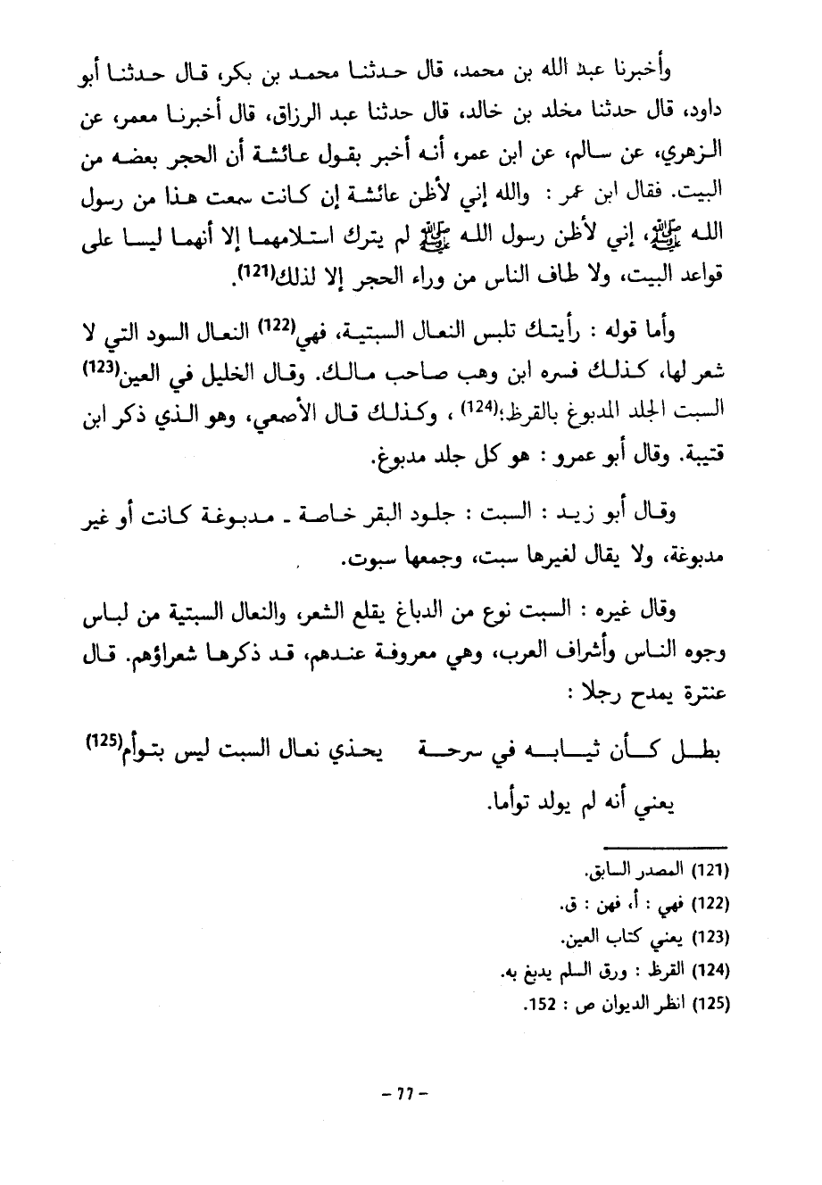 وَأَخْبَرَنَا عَبْدُ اللَّهِ بْنُ مُحَمَّدٍ قَالَ حَدَّثَنَا مُحَمَّدُ بْنُ بَكْرٍ قَالَ حَدَّثَنَا أَبُو دَاوُدَ قَالَ حَدَّثَنَا مَخْلَدُ بْنُ خَالِدٍ قَالَ حَدَّثَنَا عَبْدُ الرَّزَّاقِ قَالَ أَخْبَرَنَا مَعْمَرٌ عَنِ الزُّهْرِيِّ عَنْ سَالِمٍ عَنِ ابْنِ عُمَرَ أَنَّهُ أَخْبَرَ بِقَوْلِ عَائِشَةَ إِنَّ الْحِجْرَ بَعْضُهُ مِنَ الْبَيْتِ فقال ابن عمر والله إني لظن عَائِشَةَ إِنَّ كَانَتْ سَمِعَتْ هَذَا مِنْ رَسُولِ اللَّهِ صَلَّى اللَّهُ عَلَيْهِ وَسَلَّمَ إِنِّي لَأَظُنُّ رَسُولَ اللَّهِ صَلَّى اللَّهُ عَلَيْهِ وَسَلَّمَ لَمْ يَتْرُكِ اسْتِلَامَهُمَا إِلَّا أَنَّهُمَا لَيْسَا عَلَى قَوَاعِدِ الْبَيْتِ وَلَا طَافَ النَّاسُ مِنْ وَرَاءِ الْحِجْرِ إِلَّا لِذَلِكَ وَأَمَّا قَوْلُهُ رَأَيْتُكَ تَلْبَسُ النِّعَالَ السِّبْتِيَّةَ فَهِيَ النِّعَالُ السُّودُ الَّتِي لَا شَعْرَ لَهَا كَذَلِكَ فَسَّرَهُ ابْنُ وَهْبٍ صَاحِبُ مَالِكٍ وَقَالَ الْخَلِيلُ فِي الْعَيْنِ السِّبْتُ الْجِلْدُ الْمَدْبُوغُ بِالْقَرَظِ وَكَذَلِكَ قَالَ الْأَصْمَعِيُّ وَهُوَ الَّذِي ذَكَرَ ابْنُ قُتَيْبَةَ وَقَالَ أَبُو عَمْرٍو هُوَ كُلُّ جِلْدٍ مَدْبُوغٍ وَقَالَ أَبُو زَيْدٍ السِّبْتُ جُلُودُ الْبَقَرِ خَاصَّةً مَدْبُوغَةً كَانَتْ أَوْ غَيْرَ مَدْبُوغَةٍ وَلَا يُقَالُ لِغَيْرِهَا سِبْتٌ وَجَمْعُهَا سِبُوتٌ وَقَالَ غَيْرُهُ السِّبْتَ نَوْعٌ مِنَ الدِّبَاغِ يَقْلَعُ الشَّعْرَ وَالنِّعَالُ السِّبْتِيَّةُ مِنْ لِبَاسِ وُجُوهِ النَّاسِ وَأَشْرَافِ الْعَرَبِ وَهِيَ مَعْرُوفَةٌ عِنْدَهُمْ قَدْ ذَكَرَهَا شُعَرَاؤُهُمْ قَالَ عَنْتَرَةُ يَمْدَحُ رَجُلًا ... بَطَلٍ كَأَنَّ ثِيَابَهُ فِي سَرْحَةٍ ... ... يُحْذَى نِعَالَ السِّبْتِ لَيْسَ بِتَوْأَمٍ ... يَعْنِي أَنَّهُ لَمْ يُولَدْ تَوْأَمًا