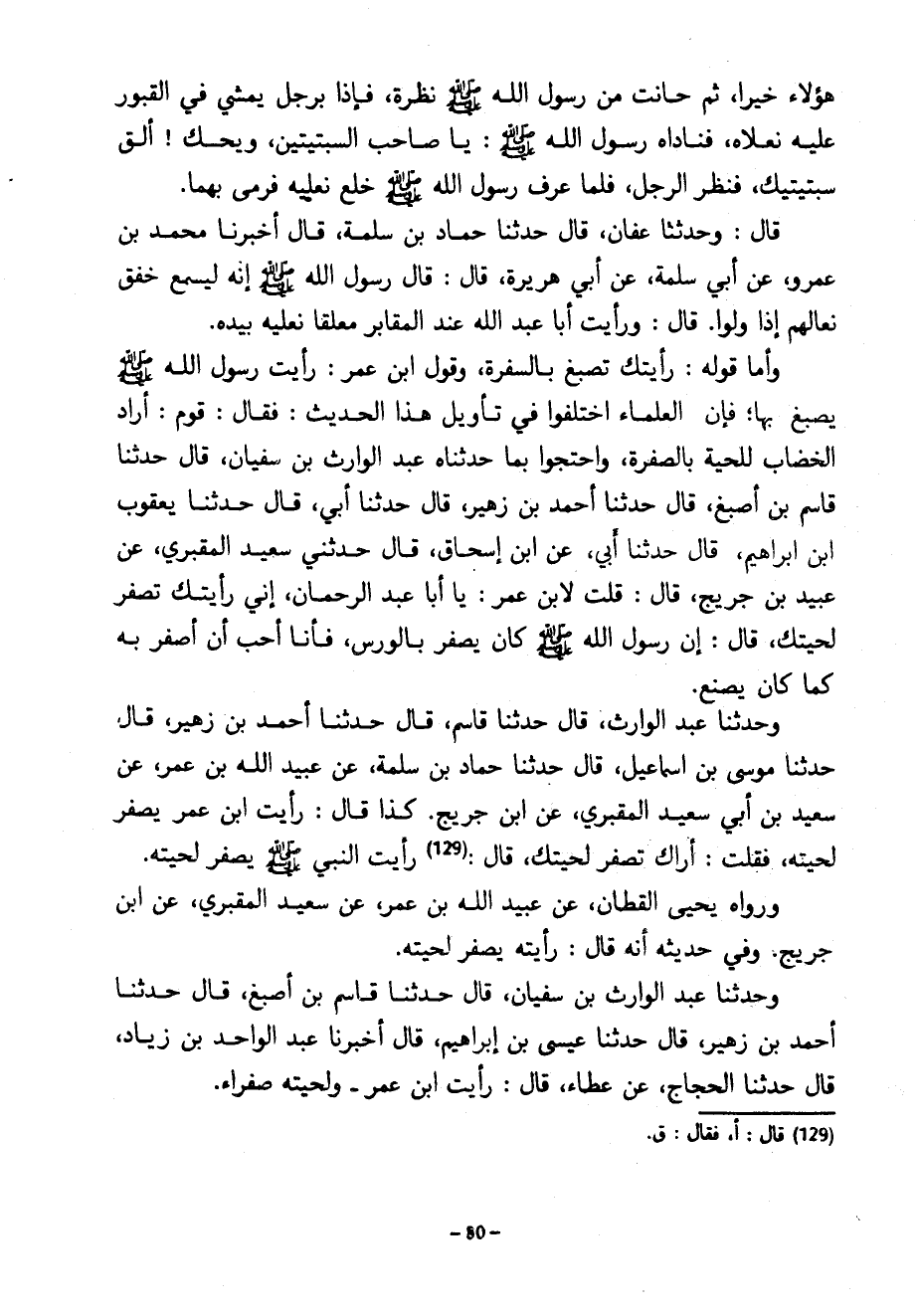 هَؤُلَاءِ خَيْرًا ثُمَّ حَانَتْ مِنْ رَسُولِ اللَّهِ صَلَّى اللَّهُ عَلَيْهِ وَسَلَّمَ نَظْرَةٌ فَإِذَا بِرَجُلٍ يَمْشِي فِي الْقُبُورِ عَلَيْهِ نَعْلَاهُ فَنَادَاهُ رَسُولُ اللَّهِ صَلَّى اللَّهُ عَلَيْهِ وَسَلَّمَ يَا صَاحِبَ السِّبْتِيَّتَيْنِ وَيْحَكَ أَلْقِ سِبْتِيَّتَيْكَ فَنَظَرَ الرَّجُلُ فَلَمَّا عَرَفَ رَسُولَ اللَّهِ صَلَّى اللَّهُ عَلَيْهِ وَسَلَّمَ خَلَعَ نَعْلَيْهِ فَرَمَى بِهِمَا قَالَ وَحَدَّثَنَا عَفَّانُ قَالَ حَدَّثَنَا حَمَّادُ بْنُ سَلَمَةَ قَالَ أَخْبَرَنَا مُحَمَّدُ بْنُ عَمْرٍو عَنْ أَبِي سَلَمَةَ عَنْ أَبِي هُرَيْرَةَ قَالَ قَالَ رَسُولُ اللَّهِ صَلَّى اللَّهُ عَلَيْهِ وَسَلَّمَ إِنَّهُ لَيَسْمَعُ خَفْقَ نِعَالِهِمْ إِذَا وَلَّوْا قَالَ وَرَأَيْتُ أَبَا عَبْدِ اللَّهِ عِنْدَ الْمَقَابِرِ مُعَلِّقًا نَعْلَيْهِ بِيَدِهِ وَأَمَّا قَوْلُهُ رأيتك تصبغ بالسفرة وَقَوْلُ ابْنُ عُمَرَ رَأَيْتُ رَسُولَ اللَّهِ صَلَّى اللَّهُ عَلَيْهِ وَسَلَّمَ يَصْبُغُ بِهَا فَإِنَّ الْعُلَمَاءَ اخْتَلَفُوا فِي تَأْوِيلِ هَذَا الْحَدِيثِ فَقَالَ قَوْمٌ أَرَادَ الْخِضَابَ لِلِّحْيَةِ بِالصُّفْرَةِ وَاحْتَجُّوا بِمَا حَدَّثَنَاهُ عَبْدُ الْوَارِثِ بْنُ سُفْيَانَ قَالَ حَدَّثَنَا قاسم ابن أَصْبَغَ قَالَ حَدَّثَنَا أَحْمَدُ بْنُ زُهَيْرٍ قَالَ حدثنا أبي قال حدثنا يعقوب ابن إِبْرَاهِيمَ قَالَ حَدَّثَنَا أَبِي عَنِ ابْنِ إِسْحَاقَ قَالَ حَدَّثَنِي سَعِيدٌ الْمَقْبُرِيُّ عَنْ عُبَيْدِ بْنِ جُرَيْجٍ قَالَ قُلْتُ لِابْنِ عُمَرَ يَا أَبَا عبد الرحمان إِنِّي رَأَيْتُكَ تُصَفِّرُ لِحْيَتَكَ قَالَ إِنَّ رَسُولَ اللَّهِ صَلَّى اللَّهُ عَلَيْهِ وَسَلَّمَ كَانَ يُصَفِّرُ بِالْوَرْسِ فَأَنَا أُحِبُّ أَنْ أُصَفِّرَ بِهِ كَمَا كَانَ يَصْنَعُ وَحَدَّثَنَا عَبْدُ الْوَارِثِ قَالَ حَدَّثَنَا قَاسِمٌ قَالَ حَدَّثَنَا أَحْمَدُ بْنُ زُهَيْرٍ قَالَ حَدَّثَنَا مُوسَى بْنُ إِسْمَاعِيلَ قَالَ حَدَّثَنَا حَمَّادُ بْنُ سَلَمَةَ عَنْ عُبَيْدِ اللَّهِ بْنِ عُمَرَ عَنْ سَعِيدِ بْنِ أَبِي سَعِيدٍ الْمَقْبُرِيِّ عَنْ ابْنِ جُرَيْجٍ كَذَا قَالَ رَأَيْتُ ابْنَ عُمَرَ يُصَفِّرُ لِحْيَتَهُ فَقُلْتُ أَرَاكَ تُصَفِّرُ لِحْيَتَكَ قَالَ رَأَيْتُ النَّبِيَّ صَلَّى اللَّهُ عَلَيْهِ وَسَلَّمَ يُصَفِّرُ لِحْيَتَهُ وَرَوَاهُ يَحْيَى الْقَطَّانُ عَنْ عُبَيْدِ اللَّهِ بْنِ عُمَرَ عَنْ سَعِيدِ الْمَقْبُرِيِّ عَنِ ابْنِ جُرَيْجٍ وَفِي حَدِيثِهِ أَنَّهُ قَالَ رَأَيْتُهُ يُصَفِّرُ لِحْيَتَهُ وَحَدَّثَنَا عَبْدُ الْوَارِثِ بْنُ سُفْيَانَ قَالَ حَدَّثَنَا قَاسِمُ بْنُ أَصْبَغَ قَالَ حَدَّثَنَا أَحْمَدُ بْنُ زُهَيْرٍ قَالَ حَدَّثَنَا عِيسَى بْنُ إِبْرَاهِيمَ قَالَ أَخْبَرَنَا عَبْدُ الْوَاحِدِ بْنُ زِيَادٍ قَالَ حَدَّثَنَا الْحَجَّاجُ عَنْ عَطَاءٍ قَالَ رَأَيْتُ ابْنَ عُمَرَ وَلِحْيَتُهُ صَفْرَاءُ