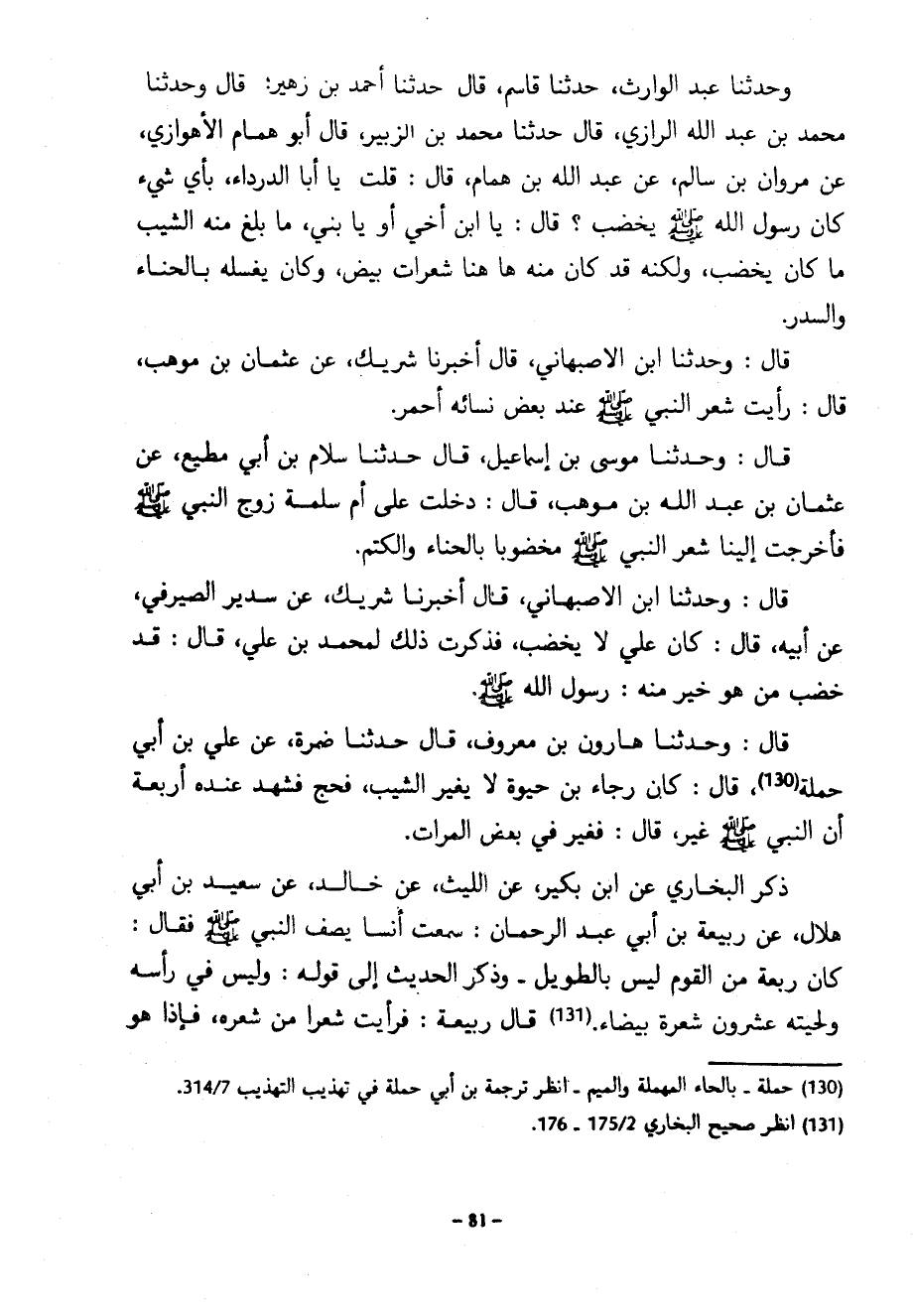 وَحَدَّثَنَا عَبْدُ الْوَارِثِ حَدَّثَنَا قَاسِمٌ قَالَ حَدَّثَنَا أَحْمَدُ بْنُ زُهَيْرٍ قَالَ وَحَدَّثَنَا مُحَمَّدُ بْنُ عَبْدِ اللَّهِ الرَّازِيُّ قَالَ حَدَّثَنَا مُحَمَّدُ بْنُ الزُّبَيْرِ قَالَ أَبُو هَمَّامٍ الْأَهْوَازِيُّ عَنْ مَرْوَانَ بْنِ سَالِمٍ عَنْ عَبْدِ اللَّهِ بْنِ هَمَّامٍ قَالَ قُلْتُ يَا أَبَا الدَّرْدَاءِ بِأَيِّ شَيْءٍ كَانَ رَسُولُ اللَّهِ صَلَّى اللَّهُ عَلَيْهِ وَسَلَّمَ يُخَضِّبُ قَالَ يَا ابْنَ أَخِي أَوْ يَا بُنَيَّ مَا بَلَغَ مِنْهُ الشَّيْبُ مَا كَانَ يخضب ولكنه قد كان منه ها هنا شَعْرَاتٌ بِيضٌ وَكَانَ يَغْسِلُهُ بِالْحِنَّاءِ وَالسِّدْرِ قَالَ وَحَدَّثَنَا ابْنُ الْأَصْبَهَانِيِّ قَالَ أَخْبَرَنَا شَرِيكٌ عَنْ عُثْمَانَ بْنِ مَوْهَبٍ قَالَ رَأَيْتُ شَعْرَ النَّبِيِّ صَلَّى اللَّهُ عَلَيْهِ وَسَلَّمَ عِنْدَ بَعْضِ نِسَائِهِ أَحْمَرَ قَالَ وَحَدَّثَنَا مُوسَى بْنُ إِسْمَاعِيلَ قَالَ حَدَّثَنَا سَلَّامُ بْنُ أَبِي مُطِيعٍ عَنْ عُثْمَانَ بْنِ عَبْدِ اللَّهِ بْنِ مَوْهَبٍ قَالَ دَخَلْتُ عَلَى أُمِّ سَلَمَةَ زَوْجِ النَّبِيِّ صَلَّى اللَّهُ عَلَيْهِ وَسَلَّمَ فَأَخْرَجَتْ إِلَيْنَا شَعْرَ النَّبِيِّ صَلَّى اللَّهُ عَلَيْهِ وَسَلَّمَ مَخْضُوبًا بِالْحِنَّاءِ وَالْكَتَمِ قَالَ وَحَدَّثَنَا ابْنُ الْأَصْبَهَانِيِّ قَالَ أَخْبَرَنَا شَرِيكٌ عَنْ سَدِيرٍ الصَّيْرَفِيِّ عَنْ أَبِيهِ قَالَ كَانَ عَلِيٌّ لَا يَخْضِبُ فَذَكَرْتُ ذَلِكَ لِمُحَمَّدِ بْنِ عَلِيٍّ قَالَ قَدْ خَضَبَ مَنْ هُوَ خَيْرٌ مِنْهُ رَسُولَ اللَّهِ صَلَّى اللَّهُ عَلَيْهِ وَسَلَّمَ قال وَحَدَّثَنَا هَارُونُ بْنُ مَعْرُوفٍ قَالَ حَدَّثَنَا ضَمْرَةُ عَنْ عَلِيِّ بْنِ أَبِي حَمَلَةَ قَالَ كَانَ رَجَاءُ بْنُ حَيْوَةَ لَا يُغَيِّرُ الشَّيْبَ فَحَجَّ فَشَهِدَ عِنْدَهُ أَرْبَعَةٌ أَنَّ النَّبِيَّ صَلَّى اللَّهُ عَلَيْهِ وَسَلَّمَ غَيَّرَ قَالَ فَغَيَّرَ فِي بَعْضِ الْمَرَّاتِ ذَكَرَ الْبُخَارِيُّ عَنِ ابْنِ بُكَيْرٍ عَنِ اللَّيْثِ عَنْ خَالِدٍ عَنْ سَعِيدِ بْنِ أَبِي هلال عن ربيعة بن أبي عبد الرحمان سَمِعْتُ أَنَسًا يَصِفُ النَّبِيِّ صَلَّى اللَّهُ عَلَيْهِ وَسَلَّمَ فَقَالَ كَانَ رَبْعَةً مِنَ الْقَوْمِ لَيْسَ بِالطَّوِيلِ وَذَكَرَ الْحَدِيثَ إِلَى قَوْلِهِ وَلَيْسَ فِي رَأْسِهِ وَلِحْيَتِهِ عِشْرُونَ شَعْرَةً بَيْضَاءَ قَالَ رَبِيعَةُ فَرَأَيْتُ شَعْرًا مِنْ شَعْرِهِ فَإِذَا هُوَ