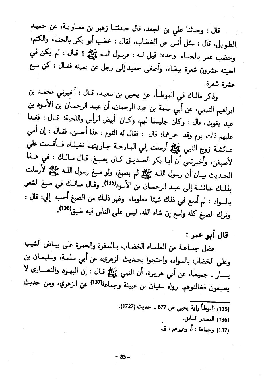قَالَ وَحَدَّثَنَا عَلِيُّ بْنُ الْجَعْدِ قَالَ حَدَّثَنَا زُهَيْرُ بْنُ مُعَاوِيَةَ عَنْ حُمَيْدٍ الطَّوِيلِ قَالَ سُئِلَ أَنَسٌ عَنِ الْخِضَابِ فَقَالَ خَضَبَ أَبُو بَكْرٍ بِالْحِنَّاءِ وَالْكَتَمِ وَخَضَبَ عُمَرُ بِالْحِنَّاءِ وَحْدَهُ قِيلَ لَهُ فَرَسُولُ اللَّهِ صَلَّى اللَّهُ عَلَيْهِ وَسَلَّمَ قَالَ لَمْ يَكُنْ فِي لِحْيَتِهِ عِشْرُونَ شَعْرَةً بَيْضَاءَ وَأَصْغَى حُمَيْدٌ إِلَى رَجُلٍ عَنْ يَمِينِهِ فَقَالَ كُنَّ سَبْعَ عَشْرَةَ شَعْرَةً وَذَكَرَ مَالِكٌ فِي الْمُوَطَّأِ عَنْ يَحْيَى بْنِ سَعِيدٍ قَالَ أَخْبَرَنِي مُحَمَّدُ بْنُ إِبْرَاهِيمَ التَّيْمِيُّ عَنْ أبي سلمة بن عبد الرحمان أَنَّ عَبْدَ الرَّحْمَنِ بْنَ الْأَسْوَدِ بْنِ عَبْدِ يَغُوثَ قَالَ وَكَانَ جَلِيسًا لَهُمْ وَكَانَ أَبْيَضَ الرَّأْسِ وَاللِّحْيَةِ قَالَ فَغَدَا عَلَيْهِمْ ذَاتَ يَوْمٍ وَقَدْ حَمَّرَهُمَا قَالَ فَقَالَ لَهُ الْقَوْمُ هَذَا أَحْسَنُ فَقَالَ إِنَّ أُمِّي عَائِشَةَ زَوْجَ النَّبِيِّ صَلَّى اللَّهُ عَلَيْهِ وَسَلَّمَ أَرْسَلَتْ إِلَيَّ الْبَارِحَةَ جَارِيَتَهَا نُخَيْلَةَ فَأَقْسَمَتْ عَلَيَّ لَأَصْبُغَنَّ وَأَخْبَرَتْنِي أَنَّ أَبَا بَكْرٍ الصِّدِّيقَ كَانَ يَصْبُغُ قَالَ مَالِكٌ فِي هَذَا الْحَدِيثِ بَيَانُ أَنَّ رَسُولَ اللَّهِ صَلَّى اللَّهُ عَلَيْهِ وَسَلَّمَ لَمْ يَصْبُغْ وَلَوْ صَبَغَ رَسُولُ اللَّهِ صَلَّى اللَّهُ عَلَيْهِ وَسَلَّمَ لأرسلت بذلك عائشة إلى عبد الرحمان بْنِ الْأَسْوَدِ وَقَالَ مَالِكٌ فِي صَبْغِ الشَّعْرِ بِالسَّوَادِ لَمْ أَسْمَعْ فِي ذَلِكَ شَيْئًا مَعْلُومًا وَغَيْرَ ذَلِكَ مِنَ الصَّبْغِ أَحَبُّ إِلَيَّ قَالَ وترك الصبغ كله واسع إِنْ شَاءَ اللَّهُ لَيْسَ عَلَى النَّاسِ فِيهِ ضِيقٌ قَالَ أَبُو عُمَرَ فَضَّلَ جَمَاعَةٌ مِنَ الْعُلَمَاءِ الْخِضَابَ بِالصُّفْرَةِ وَالْحُمْرَةِ عَلَى بَيَاضِ الشَّيْبِ وَعَلَى الْخِضَابِ بِالسَّوَادِ وَاحْتَجُّوا بِحَدِيثِ الزُّهْرِيِّ عَنْ أَبِي سَلَمَةَ وَسُلَيْمَانَ بْنِ يَسَارٍ جَمِيعًا عَنْ أَبِي هُرَيْرَةَ أَنَّ النَّبِيَّ صَلَّى اللَّهُ عَلَيْهِ وسلم قال إن اليهود والنصارى لَا يَصْبُغُونَ فَخَالِفُوهُمْ رَوَاهُ سُفْيَانُ بْنُ عُيَيْنَةَ وَجَمَاعَةٌ عَنِ الزُّهْرِيِّ وَمِنْ حَدِيثِ