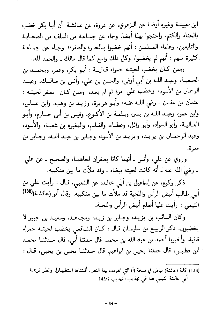 ابْنِ عُيَيْنَةَ وَغَيْرِهِ أَيْضًا عَنِ الزُّهْرِيِّ عَنْ عُرْوَةَ عَنْ عَائِشَةَ أَنَّ أَبَا بَكْرٍ خَضَبَ بالحنا وَالْكَتَمِ وَاحْتَجُّوا بِهَذَا أَيْضًا وَجَاءَ عَنْ جَمَاعَةٍ مِنَ السَّلَفِ مِنَ الصَّحَابَةِ وَالتَّابِعِينَ وَعُلَمَاءِ الْمُسْلِمِينَ أَنَّهُمْ خَضَبُوا بِالْحُمْرَةِ وَالصُّفْرَةِ وَجَاءَ عَنْ جَمَاعَةٍ كَثِيرَةٍ مِنْهُمْ أَنَّهُمْ لَمْ يَخْضِبُوا وَكُلُّ ذَلِكَ وَاسِعٌ كَمَا قَالَ مَالِكٌ وَالْحَمْدُ لِلَّهِ وَمِمَّنْ كَانَ يَخْضِبُ لِحْيَتَهُ حَمْرَاءَ قَانِيَةً أَبُو بَكْرٍ وَعُمَرُ وَمُحَمَّدُ بْنُ الْحَنَفِيَّةِ وَعَبْدُ اللَّهِ بْنُ أَبِي أَوْفَى وَالْحَسَنُ بْنُ عَلِيٍّ وَأَنَسُ بْنُ مالك وعبد الرحمان بْنُ الْأَسْوَدِ وَخَضَبَ عَلِيٌّ مَرَّةً ثُمَّ لَمْ يَعُدْ وَمِمَّنْ كَانَ يُصَفِّرُ لِحْيَتَهُ عُثْمَانُ بْنُ عَفَّانَ رَضِيَ اللَّهُ عَنْهُ وَأَبُو هُرَيْرَةَ وَزَيْدُ بْنُ وَهْبٍ وَابْنُ عَبَّاسٍ وَابْنُ عُمَرَ وَعَبْدُ اللَّهِ بْنُ بُسْرٍ وَسَلَمَةُ بْنُ الْأَكْوَعِ وَقَيْسُ بْنُ أَبِي حَازِمٍ وَأَبُو الْعَالِيَةِ وَأَبُو السَّوَادِ وَأَبُو وَائِلٍ وَعَطَاءٌ وَالْقَاسِمُ وَالْمُغِيرَةُ بْنُ شُعْبَةَ والأسود وعبد الرحمان بْنُ يَزِيدَ وَيَزِيدُ بْنُ الْأَسْوَدِ وَجَابِرُ بْنُ عَبْدِ اللَّهِ وَجَابِرُ بْنُ سَمُرَةَ وَرُوِيَ عَنْ عَلِيٍّ وَأَنَسٍ أَنَّهُمَا كَانَا يُصَفِرَّانِ لِحَاهُمَا وَالصَّحِيحُ عَنْ عَلِيٍّ رَضِيَ اللَّهُ عَنْهُ أَنَّهُ كَانَتْ لِحْيَتُهُ بَيْضَاءَ وَقَدْ مَلَأَتْ مَا بَيْنَ مَنْكِبَيْهِ ذَكَرَ وَكِيعٌ عَنْ إِسْمَاعِيلَ بْنِ أَبِي خَالِدٍ عَنِ الشَّعْبِيِّ قَالَ رَأَيْتُ عَلِيَّ بْنَ أَبِي طَالِبٍ أَبْيَضَ الرَّأْسِ وَاللِّحْيَةِ قَدْ مَلَأَتْ مَا بَيْنَ مَنْكِبَيْهِ وَقَالَ أَبُو (عَائِشَةَ) التَّيْمِيُّ رَأَيْتُ عَلِيًّا أَصْلَعَ أَبْيَضَ الرَّأْسِ وَاللِّحْيَةِ وَكَانَ السَّائِبُ بْنُ يَزِيدَ وَجَابِرُ بْنُ زَيْدٍ وَمُجَاهِدٌ وَسَعِيدُ بْنُ جُبَيْرٍ لَا يَخْضِبُونَ ذَكَرَ الرَّبِيعُ بْنُ سُلَيْمَانَ قَالَ كَانَ الشَّافِعِيُّ يَخْضِبُ لِحْيَتَهُ حَمْرَاءَ قَانِيَةً وَأَخْبَرَنَا أَحْمَدُ بْنُ عَبْدِ اللَّهِ بْنِ مُحَمَّدِ قَالَ حَدَّثَنَا أَبِي قَالَ حَدَّثَنَا مُحَمَّدُ ابن فُطَيْسٍ قَالَ حَدَّثَنَا يَحْيَى بْنُ إِبْرَاهِيمَ قَالَ حَدَّثَنَا يَحْيَى بْنُ يَحْيَى قَالَ