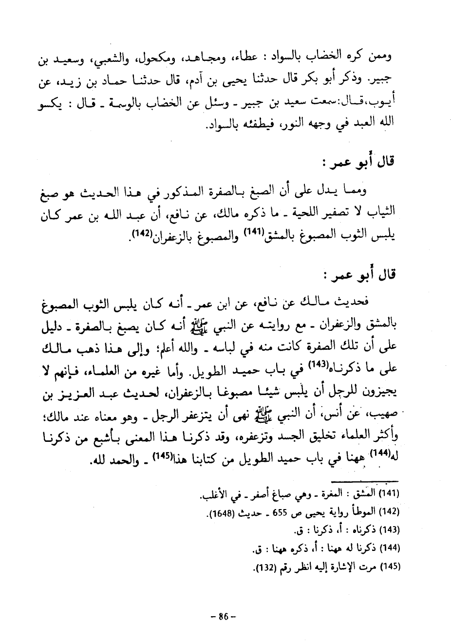 وَمِمَّنْ كَرِهَ الْخِضَابَ بِالسَّوَادِ عَطَاءٌ وَمُجَاهِدٌ وَمَكْحُولٌ وَالشَّعْبِيُّ وَسَعِيدُ بْنُ جُبَيْرٍ وَذَكَرَ أَبُو بَكْرٍ قَالَ حَدَّثَنَا يَحْيَى بْنُ آدَمَ قَالَ حَدَّثَنَا حَمَّادُ بْنُ زَيْدٍ عَنْ أَيُّوبَ قَالَ سَمِعْتُ سَعِيدَ بْنَ جُبَيْرٍ وَسُئِلَ عَنِ الْخِضَابِ بِالْوَسْمَةِ قَالَ يَكْسُو اللَّهُ الْعَبْدَ فِي وَجْهِهِ النُّورَ فَيُطْفِئُهُ بِالسَّوَادِ قَالَ أَبُو عُمَرَ وَمِمَّا يَدُلُّ عَلَى أَنَّ الصَّبْغَ بِالصُّفْرَةِ الْمَذْكُورَ فِي هَذَا الْحَدِيثِ هُوَ صَبْغُ الثِّيَابِ لَا تَصْفِيرُ اللِّحْيَةِ مَا ذَكَرَهُ مَالِكٌ عَنْ نَافِعٍ أَنَّ عَبْدَ اللَّهِ بْنَ عُمَرَ كَانَ يَلْبَسُ الثَّوْبَ الْمَصْبُوغَ بِالْمَشْقِ وَالْمَصْبُوغَ بِالزَّعْفَرَانِ قَالَ أَبُو عُمَرَ فَحَدِيثُ مَالِكٌ عَنْ نَافِعٍ عَنِ ابْنِ عُمَرَ أَنَّهُ كَانَ يَلْبَسُ الثَّوْبَ الْمَصْبُوغَ بِالْمِشْقِ وَالزَّعْفَرَانِ مَعَ رِوَايَتِهِ عَنِ النَّبِيِّ صَلَّى اللَّهُ عَلَيْهِ وَسَلَّمَ أَنَّهُ كَانَ يَصْبُغُ بِالصُّفْرَةِ دَلِيلٌ عَلَى أَنَّ تِلْكَ الصُّفْرَةَ كَانَتْ مِنْهُ فِي لِبَاسِهِ وَاللَّهُ أَعْلَمُ وَإِلَى هَذَا ذَهَبَ مَالِكٌ عَلَى مَا ذَكَرْنَاهُ فِي بَابِ حُمَيْدٍ الطَّوِيلِ وَأَمَّا غَيْرُهُ مِنَ الْعُلَمَاءِ فَإِنَّهُمْ لَا يُجِيزُونَ لِلرَّجُلِ أَنْ يَلْبَسَ شَيْئًا مَصْبُوغًا بِالزَّعْفَرَانِ لِحَدِيثِ عَبْدِ الْعَزِيزِ بْنِ صُهَيْبٍ عَنْ أَنَسٍ أَنَّ النَّبِيَّ صَلَّى اللَّهُ عَلَيْهِ وَسَلَّمَ نَهَى أَنْ يَتَزَعْفَرَ الرَّجُلُ وَهُوَ مَعْنَاهُ عِنْدَ مَالِكٍ وَأَكْثَرُ الْعُلَمَاءِ تَخْلِيقُ الْجَسَدِ وَتَزَعْفُرُهُ وَقَدْ ذَكَرْنَا هَذَا الْمَعْنَى بِأَشْبَعَ من ذكرنا له ههنا فِي بَابِ حُمَيْدٍ الطَّوِيلِ مِنْ كِتَابِنَا هَذَا والحمد لله