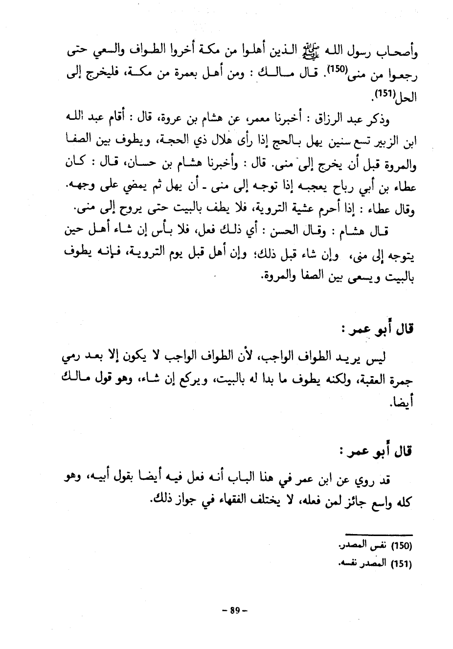وَأَصْحَابُ رَسُولُ اللَّهِ صَلَّى اللَّهُ عَلَيْهِ وَسَلَّمَ الَّذِينَ أَهَلُّوا مِنْ مَكَّةَ أَخَّرُوا الطَّوَافَ وَالسَّعْيَ حَتَّى رَجَعُوا مِنْ مِنًى قَالَ مَالِكٌ وَمَنْ أَهَلَّ بِعُمْرَةٍ مِنْ مَكَّةَ فَلْيَخْرُجْ إِلَى الْحَلِّ وَذَكَرَ عَبْدُ الرَّزَّاقِ أَخْبَرَنَا مَعْمَرٌ عَنْ هِشَامٍ بْنِ عُرْوَةَ قَالَ أَقَامَ عَبْدُ اللَّهِ بْنُ الزُّبَيْرِ تِسْعَ سِنِينَ يُهِلُّ بِالْحَجِّ إِذَا رَأَى هِلَالَ ذِي الْحِجَّةِ وَيَطُوفُ بَيْنَ الصَّفَا وَالْمَرْوَةِ قَبْلَ أَنْ يَخْرُجَ إِلَى مِنًى قَالَ وَأَخْبَرَنَا هِشَامُ بْنُ حَسَّانٍ قَالَ كَانَ عَطَاءُ بْنُ أَبِي رَبَاحٍ يُعْجِبُهُ إِذَا تَوَجَّهَ إِلَى مِنًى أَنْ يُهِلَّ ثُمَّ يَمْضِي عَلَى وَجْهِهِ وَقَالَ عَطَاءٌ إِذَا أَحْرَمَ عَشِيَّةَ التَّرْوِيَةِ فَلَا يَطُفْ بِالْبَيْتِ حَتَّى يَرُوحَ إِلَى مِنًى قَالَ هِشَامٌ وَقَالَ الْحَسَنُ أَيُّ ذَلِكَ فَعَلَ فَلَا بَأْسَ إِنْ شَاءَ أَهَلَّ حِينَ يَتَوَجَّهُ إِلَى مِنًى وَإِنْ شَاءَ قَبْلَ ذَلِكَ وَإِنَّ أَهَلَّ قَبْلَ يوم التروية فإنه يطوف باليت ويسعى بن الصَّفَا وَالْمَرْوَةِ قَالَ أَبُو عُمَرَ لَيْسَ يُرِيدُ الطَّوَافَ الْوَاجِبَ لِأَنَّ الطَّوَافَ الْوَاجِبَ لَا يَكُونُ إِلَّا بَعْدَ رَمْيِ جَمْرَةِ الْعَقَبَةِ وَلَكِنَّهُ يَطُوفُ مَا بَدَا لَهُ بِالْبَيْتِ وَيَرْكَعُ إِنْ شَاءَ وَهُوَ قَوْلُ مَالِكٍ أَيْضًا قَالَ أَبُو عُمَرَ قَدْ رُوِيَ عَنِ ابْنِ عُمَرَ فِي هَذَا الْبَابِ أَنَّهُ فَعَلَ فِيهِ أَيْضًا بِقَوْلِ أَبِيهِ وهو كله واسع جَائِزٌ لِمَنْ فَعَلَهُ لَا يَخْتَلِفُ الْفُقَهَاءُ فِي جواز ذلك