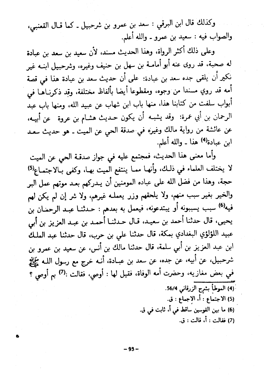 وَكَذَلِكَ قَالَ ابْنُ الْبَرْقِيِّ سَعْدُ بْنُ عَمْرِو بن شرحبيل كا قَالَ الْقَعْنَبِيُّ وَالصَّوَابُ فِيهِ سَعِيدُ بْنُ عَمْرٍو وَاللَّهُ أَعْلَمُ وَعَلَى ذَلِكَ أَكْثَرُ الرُّوَاةِ وَهَذَا الْحَدِيثُ مُسْنَدٌ لِأَنَّ سَعِيدَ بْنَ سَعْدِ بْنِ عُبَادَةَ لَهُ صُحْبَةٌ قَدْ رَوَى عَنْهُ أَبُو أُمَامَةَ بْنُ سَهْلِ بْنِ حُنَيْفٍ وَغَيْرُهُ وَشُرَحْبِيلُ ابْنُهُ غَيْرُ نَكِيرٍ أَنْ يَلْقَى جَدَّهُ سَعْدَ بْنَ عُبَادَةَ عَلَى أَنَّ حَدِيثَ سَعْدِ بْنِ عُبَادَةَ هَذَا فِي قِصَّةِ أُمِّهِ قَدْ رُوِيَ مُسْنَدًا مِنْ وُجُوهٍ وَمَقْطُوعًا أَيْضًا بِأَلْفَاظٍ مُخْتَلِفَةٍ وَقَدْ ذَكَرْنَاهَا فِي أَبْوَابٍ سَلَفَتْ مِنْ كِتَابِنَا هَذَا مِنْهَا بَابُ ابْنِ شِهَابٍ عَنْ عُبَيْدِ الله ومنها باب عبد الرحمان بْنِ أَبِي عُمْرَةَ وَقَدْ يُشْبِهُ أَنْ يَكُونَ حَدِيثَ هِشَامِ بْنِ عُرْوَةَ عَنْ أَبِيهِ عَنْ عَائِشَةَ مِنْ رِوَايَةِ مَالِكٍ وَغَيْرِهِ فِي صَدَقَةِ الحي عن الميت هو حديث سعد ابن عُبَادَةَ هَذَا وَاللَّهُ أَعْلَمُ وَأَمَّا مَعْنَى هَذَا الْحَدِيثِ فَمُجْتَمَعٌ عَلَيْهِ فِي جَوَازِ صَدَقَةِ الْحَيِّ عَنِ الْمَيِّتِ لَا يَخْتَلِفُ الْعُلَمَاءُ فِي ذَلِكَ وَأَنَّهَا مِمَّا يَنْتَفِعُ الْمَيِّتُ بِهَا وَكَفَى بِالِاجْتِمَاعِ حُجَّةً وَهَذَا مِنْ فَضْلِ اللَّهِ عَلَى عِبَادِهِ الْمُؤْمِنِينَ أَنْ يُدْرِكَهُمْ بَعْدَ مَوْتِهِمْ عَمَلُ الْبِرِّ وَالْخَيْرِ بِغَيْرِ سَبَبٍ مِنْهُمْ وَلَا يَلْحَقُهُمْ وِزْرٌ يَعْمَلُهُ غَيْرُهُمْ وَلَا شَرٌّ إِنْ لَمْ يَكُنْ لَهُمْ فِيهِ سَبَبٌ يُسَبِّبُونَهُ أَوْ يَبْتَدِعُونَهُ فَيُعْمَلُ به بعدهم حدثنا عبد الرحمان بْنُ يَحْيَى قَالَ حَدَّثَنَا أَحْمَدُ بْنُ سَعِيدٍ قَالَ حَدَّثَنَا أَحْمَدُ بْنُ عَبْدِ الْعَزِيزِ بْنِ أَبِي عُبَيْدٍ اللُّؤْلُؤِيُّ الْبَغْدَادِيُّ بِمَكَّةَ قَالَ حَدَّثَنَا عَلِيُّ بْنُ حَرْبٍ قَالَ حَدَّثَنَا عَبْدُ الْمَلِكِ ابن عَبْدُ الْعَزِيزِ بْنُ أَبِي سَلَمَةَ قَالَ حَدَّثَنَا مَالِكُ بْنُ أَنَسٍ عَنْ سَعِيدِ بْنِ عَمْرِو بْنِ شُرَحْبِيلَ عَنْ أَبِيهِ عَنْ جَدِّهِ عَنْ سَعْدِ بْنِ عُبَادَةَ أَنَّهُ خَرَجَ مَعَ رَسُولِ اللَّهِ صَلَّى اللَّهُ عَلَيْهِ وَسَلَّمَ فِي بَعْضِ مغازيه وحضرت أمه الوفاة فقيل لها أوصي فَقَالَتْ بِمَ أُوصِي