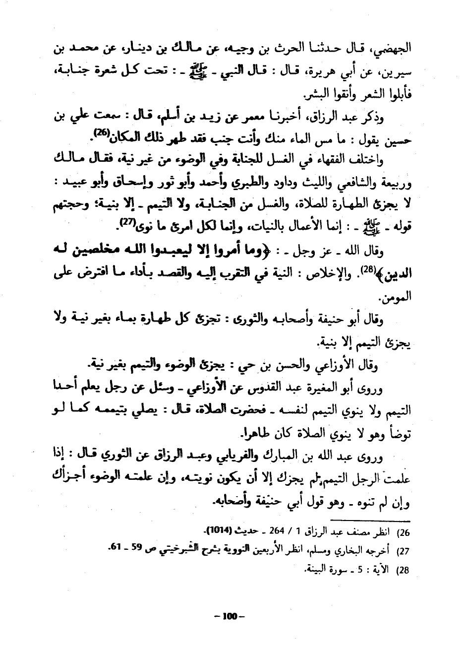 الجهضمي قال حدثنا الحرث بْنُ وَجِيهٍ عَنْ مَالِكِ بْنِ دِينَارٍ عَنْ مُحَمَّدِ بْنِ سِيرِينَ عَنْ أَبِي هُرَيْرَةَ قَالَ قَالَ النَّبِيُّ صَلَّى اللَّهُ عَلَيْهِ وَسَلَّمَ تَحْتَ كُلِّ شَعْرَةٍ جَنَابَةٌ فَأَبِلُّوا الشَّعْرَ وَأَنْقُوا الْبَشَرَ وَذَكَرَ عَبْدُ الرَّزَّاقِ أَخْبَرَنَا مَعْمَرٌ عَنْ زَيْدِ بْنِ أَسْلَمَ قَالَ سَمِعْتُ عَلِيَّ بْنَ حُسَيْنٍ يَقُولُ مَا مَسَّ الْمَاءُ مِنْكَ وَأَنْتَ جُنُبٌ فَقَدْ طَهُرَ ذَلِكَ الْمَكَانُ وَاخْتَلَفَ الْفُقَهَاءُ فِي الْغُسْلِ لِلْجَنَابَةِ وَفِي الْوُضُوءِ مِنْ غَيْرِ نِيَّةٍ فقال مالك وربيعة والشافعي والليث وَدَاوُدُ وَالطَّبَرِيُّ وَأَحْمَدُ وَأَبُو ثَوْرٍ وَإِسْحَاقُ وَأَبُو عُبَيْدٍ لَا يُجْزِئُ الطِّهَارَةُ لِلصَّلَاةِ وَالْغُسْلُ مِنَ الْجَنَابَةِ وَلَا التَّيَمُّمُ إِلَّا بِنِيَّةٍ وَحُجَّتُهُمْ قَوْلُهُ صَلَّى اللَّهُ عَلَيْهِ وَسَلَّمَ إِنَّمَا الْأَعْمَالُ بِالنِّيَّاتِ وَإِنَّمَا لِكُلِّ امْرِئٍ مَا نَوَى وَقَالَ اللَّهُ عَزَّ وَجَلَّ وَمَا أُمِرُوا إِلَّا لِيَعْبُدُوا اللَّهَ مُخْلِصِينَ لَهُ الدِّينَ وَالْإِخْلَاصُ النِّيَّةُ فِي التَّقَرُّبِ إِلَيْهِ وَالْقَصْدُ بِأَدَاءِ مَا افْتُرِضَ عَلَى الْمُؤْمِنِ وَقَالَ أَبُو حَنِيفَةَ وَأَصْحَابُهُ وَالثَّوْرِيُّ تُجْزِئُ كُلُّ طَهَارَةٍ بِمَاءٍ بِغَيْرِ نِيَّةٍ وَلَا يُجْزِئُ التَّيَمُّمُ إِلَّا بِنِيَّةٍ وَقَالَ الْأَوْزَاعِيُّ وَالْحَسَنُ بْنُ حَيٍّ يُجْزِئُ الْوُضُوءُ وَالتَّيَمُّمُ بِغَيْرِ نِيَّةٍ وَرَوَى أَبُو الْمُغِيرَةِ عَبْدُ الْقُدُّوسِ عَنِ الْأَوْزَاعِيِّ وَسُئِلَ عَنْ رَجُلٍ يُعَلِّمُ أَحَدًا التَّيَمُّمَ وَلَا يَنْوِي التَّيَمُّمَ لِنَفْسِهِ فَحَضَرَتِ الصَّلَاةُ قَالَ يُصَلِّي بِتَيَمُّمِهِ كَمَا لَوْ تَوَضَّأَ وَهُوَ لَا يَنْوِي الصَّلَاةَ كَانَ طَاهِرًا وَرَوَى عَبْدُ اللَّهِ بْنُ الْمُبَارَكِ وَالْفِرْيَابِيُّ وَعَبْدُ الرَّزَّاقِ عَنِ الثَّوْرِيِّ قَالَ إِذَا عَلَّمْتَ الرَّجُلَ التَّيَمُّمَ لَمْ يُجْزِكَ إِلَّا أَنْ يَكُونَ نَوَيْتَهُ وَإِنْ عَلَّمْتَهُ الْوُضُوءَ أَجْزَأَكَ وَإِنْ لَمْ تَنْوِهِ وَهُوَ قَوْلُ أَبِي حَنِيفَةَ وَأَصْحَابِهِ