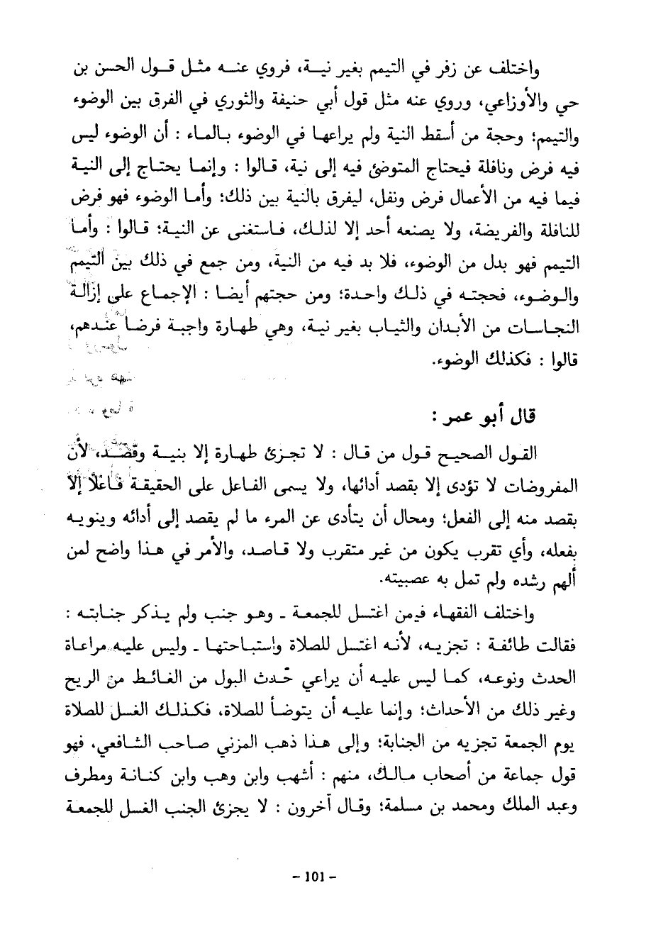وَاخْتُلِفَ عَنْ زُفَرَ فِي التَّيَمُّمِ بِغَيْرِ نِيَّةٍ فَرُوِيَ عَنْهُ مِثْلُ قَوْلِ الْحَسَنِ بْنِ حَيٍّ وَالْأَوْزَاعِيِّ وَرُوِيَ عَنْهُ مِثْلُ قَوْلِ أَبِي حَنِيفَةَ وَالثَّوْرِيِّ فِي الْفَرْقِ بَيْنَ الْوُضُوءِ وَالتَّيَمُّمِ وَحَجَّةُ مَنْ أَسْقَطَ النِّيَّةَ وَلَمْ يُرَاعِهَا فِي الْوُضُوءِ بِالْمَاءِ أَنَّ الْوُضُوءَ لَيْسَ فِيهِ فَرْضٌ وَنَافِلَةٌ فَيَحْتَاجُ الْمُتَوَضِّئُ فِيهِ إِلَى نِيَّةٍ قَالُوا وَإِنَّمَا يَحْتَاجُ إِلَى النِّيَّةِ فِيمَا فِيهِ مِنَ الْأَعْمَالِ فَرْضٌ وَنَفْلٌ لِيُفَرِّقَ بِالنِّيَّةِ بَيْنَ ذَلِكَ وَأَمَّا الْوُضُوءُ فَهُوَ فَرْضٌ لِلنَّافِلَةِ وَالْفَرِيضَةِ وَلَا يَصْنَعُهُ أَحَدٌ إِلَّا لِذَلِكَ فَاسْتَغْنَى عَنِ النِّيَّةِ قَالُوا وَأَمَّا التَّيَمُّمُ فَهُوَ بَدَلٌ مِنَ الْوُضُوءِ فَلَا بُدَّ فِيهِ مِنَ النِّيَّةِ وَمَنْ جَمَعَ فِي ذَلِكَ بَيْنَ التَّيَمُّمِ وَالْوُضُوءِ فَحُجَّتُهُ فِي ذَلِكَ وَاحِدَةٌ وَمِنْ حُجَّتِهِمْ أَيْضًا الْإِجْمَاعُ عَلَى إِزَالَةِ النَّجَاسَاتِ مِنَ الْأَبْدَانِ وَالثِّيَابِ بِغَيْرِ نِيَّةٍ وَهِيَ طَهَارَةٌ وَاجِبَةٌ فَرْضًا عِنْدَهُمْ قَالُوا فَكَذَلِكَ الْوُضُوءُ قَالَ أَبُو عُمَرَ الْقَوْلُ الصَّحِيحُ قَوْلُ مَنْ قال لاتجزئ طَهَارَةٌ إِلَّا بِنِيَّةٍ وَقَصْدٍ لِأَنَّ الْمَفْرُوضَاتِ لَا تُؤَدَّى إِلَّا بِقَصْدِ أَدَائِهَا وَلَا يُسَمَّى الْفَاعِلُ عَلَى الْحَقِيقَةِ فَاعِلًا إِلَّا بِقَصْدٍ مِنْهُ إِلَى الْفِعْلِ وَمُحَالٌ أَنْ يَتَأَدَّى عَنِ الْمَرْءِ مَا لم يقصد إلى أدائه وينويه بِفِعْلِهِ وَأَيُّ تَقَرُّبٍ يَكُونُ مِنْ غَيْرِ مُتَقَرِّبٍ وَلَا قَاصِدٍ وَالْأَمْرُ فِي هَذَا وَاضِحٌ لِمَنْ أُلْهِمَ رُشْدَهُ وَلَمْ تَمِلْ بِهِ عَصَبِيَّتُهُ وَاخْتَلَفَ الْفُقَهَاءُ فِيمَنِ اغْتَسَلَ لِلْجُمُعَةِ وَهُوَ جُنُبٌ وَلَمْ يَذْكُرْ جَنَابَتُهُ فَقَالَتْ طَائِفَةٌ تُجْزِيهِ لِأَنَّهُ اغْتَسَلَ لِلصَّلَاةِ وَاسْتَبَاحَتِهَا وَلَيْسَ عَلَيْهِ مُرَاعَاةُ الْحَدَثِ وَنَوْعِهِ كَمَا لَيْسَ عَلَيْهِ أَنْ يُرَاعِيَ حَدَثَ الْبَوْلِ مِنَ الْغَائِطِ مِنَ الرِّيحِ وَغَيْرَ ذَلِكَ مِنَ الْأَحْدَاثِ وَإِنَّمَا عَلَيْهِ أَنْ يَتَوَضَّأَ لِلصَّلَاةِ فَكَذَلِكَ الْغُسْلُ لِلصَّلَاةِ يَوْمَ الْجُمُعَةِ تُجْزِيهِ مِنَ الْجَنَابَةِ وإلى هذا ذهب المزني صاحب السافعي فَهُوَ قَوْلُ جَمَاعَةٍ مِنْ أَصْحَابِ مَالِكٍ مِنْهُمْ أَشْهَبُ وَابْنُ وَهْبٍ وَابْنُ كِنَانَةَ وَمُطَرِّفٌ وَعَبْدُ الْمَلِكِ وَمُحَمَّدُ بْنُ مَسْلَمَةَ وَقَالَ آخَرُونَ لَا يُجْزِئُ الْجُنُبَ الْغُسْلُ لِلْجُمُعَةِ