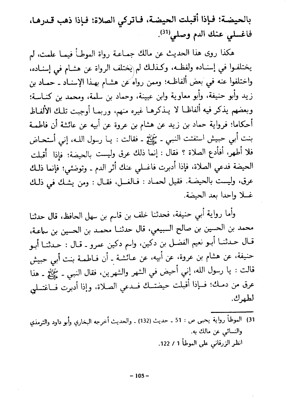 بِالْحَيْضَةِ فَإِذَا أَقْبَلَتِ الْحَيْضَةُ فَاتْرُكِي الصَّلَاةَ فَإِذَا ذَهَبَ قَدْرُهَا فَاغْسِلِي عَنْكِ الدَّمَ وَصَلِّي هَكَذَا رَوَى هَذَا الْحَدِيثَ عَنْ مَالِكٍ جَمَاعَةُ رُوَاةِ الْمُوَطَّأِ فِيمَا عَلِمْتُ لَمْ يَخْتَلِفُوا فِي إِسْنَادِهِ وَلَفْظِهِ وَكَذَلِكَ لَمْ يَخْتَلِفِ الرُّوَاةُ عَنْ هِشَامٍ فِي إِسْنَادِهِ وَاخْتَلَفُوا عَنْهُ فِي بَعْضِ أَلْفَاظِهِ وَمِمَّنْ رَوَاهُ عَنْ هِشَامٍ بِهَذَا الْإِسْنَادِ حَمَّادُ بْنُ زَيْدٍ وَأَبُو حَنِيفَةَ وَأَبُو مُعَاوِيَةَ وَابْنُ عُيَيْنَةَ وَحَمَّادُ بْنُ سَلَمَةَ وَمُحَمَّدُ بْنُ كُنَاسَةَ وَبَعْضُهُمْ يَذْكُرُ فِيهِ أَلْفَاظًا لَا يَذْكُرُهَا غَيْرُهُ مِنْهُمْ وَرُبَّمَا أَوْجَبَتْ تِلْكَ الْأَلْفَاظُ أَحْكَامًا فَرِوَايَةُ حَمَّادُ بْنُ زَيْدٍ عَنْ هِشَامِ بْنِ عُرْوَةَ عَنْ أَبِيهِ عَنْ عَائِشَةَ أَنَّ فَاطِمَةَ بِنْتَ أَبِي حُبَيْشٍ اسْتَفْتَتِ النَّبِيِّ صَلَّى اللَّهُ عَلَيْهِ وَسَلَّمَ فَقَالَتْ يَا رَسُولَ اللَّهِ إِنِّي أُسْتَحَاضُ فَلَا أَطْهُرُ أَفَأَدَعُ الصَّلَاةَ فَقَالَ إِنَّمَا ذَلِكَ عِرْقٌ وَلَيْسَتْ بِالْحَيْضَةِ فَإِذَا أَقْبَلَتِ الْحَيْضَةُ فَدَعِي الصَّلَاةَ فَإِذَا أَدْبَرَتْ فَاغْسِلِي عَنْكِ أَثَرَ الدَّمِ وَتَوَضَّئِي فَإِنَّمَا ذَلِكَ عِرْقٌ وَلَيْسَتْ بِالْحَيْضَةِ فَقِيلَ لِحَمَّادٍ فَالْغُسْلُ فَقَالَ وَمَنْ يَشُكُّ فِي ذَلِكَ غُسْلًا وَاحِدًا بَعْدَ الْحَيْضَةِ وَأَمَّا رِوَايَةُ أَبِي حَنِيفَةَ فَحَدَّثَنَا خَلَفُ بْنُ قَاسِمِ بْنِ سَهْلٍ الْحَافِظُ قَالَ حَدَّثَنَا مُحَمَّدُ بْنُ الْحُسَيْنِ بْنِ صَالِحٍ السَّبِيعِيُّ قَالَ حَدَّثَنَا مُحَمَّدُ بْنُ الْحُسَيْنِ بْنِ سَمَاعَةَ قَالَ حَدَّثَنَا أَبُو نُعَيْمٍ الْفَضْلُ بْنُ دُكَيْنٍ وَاسْمُ دُكَيْنٍ عَمْرٌو قَالَ حَدَّثَنَا أَبُو حَنِيفَةَ عَنْ هِشَامِ بْنِ عُرْوَةَ عَنْ أَبِيهِ عَنْ عَائِشَةَ أَنَّ فَاطِمَةَ بِنْتَ أَبِي حُبَيْشٍ قَالَتْ يَا رَسُولَ اللَّهِ إِنِّي أَحِيضُ فِي الشَّهْرِ وَالشَّهْرَيْنِ فَقَالَ النَّبِيُّ صَلَّى اللَّهُ عَلَيْهِ وَسَلَّمَ هَذَا عِرْقٌ مِنْ دَمِكَ فَإِذَا أَقْبَلَتْ حَيْضَتُكِ فَدَعِي الصَّلَاةَ وَإِذَا أَدْبَرَتْ فَاغْتَسِلِي لطهرك