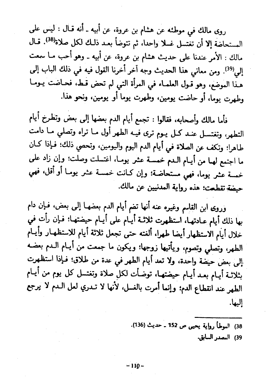رَوَى مَالِكٌ فِي مُوَطَّئِهِ عَنْ هِشَامِ بْنِ عُرْوَةَ عَنْ أَبِيهِ أَنَّهُ قَالَ لَيْسَ عَلَى المستحاضة إلا أن تغتسل غسلا واحد ثُمَّ تَتَوَضَّأَ بَعْدَ ذَلِكَ لِكُلِّ صَلَاةٍ قَالَ مَالِكٌ الْأَمْرُ عِنْدَنَا عَلَى حَدِيثِ هِشَامِ بْنِ عُرْوَةَ عَنْ أَبِيهِ وَهُوَ أَحَبُّ مَا سَمِعْتُ إِلَيَّ وَمِنْ مَعَانِي هَذَا الْحَدِيثِ وَجْهٌ آخَرُ أَخَّرْنَا الْقَوْلَ فِيهِ فِي ذَلِكَ الْبَابِ إِلَى هَذَا الْمَوْضِعِ وَهُوَ قَوْلُ الْعُلَمَاءِ فِي الْمَرْأَةِ الَّتِي لَمْ تَحِضْ قَطُّ فَحَاضَتْ يَوْمًا وَطَهُرَتْ يَوْمًا أَوْ حَاضَتْ يَوْمَيْنِ وَطَهُرَتْ يَوْمًا أَوْ يَوْمَيْنِ وَنَحْوَ هَذَا فَأَمَّا مَالِكٌ وَأَصْحَابُهُ فَقَالُوا تَجْمَعُ أَيَّامَ الدَّمِ بَعْضَهَا إِلَى بَعْضٍ وَتَطْرَحُ أَيَّامَ التَّطَهُّرِ وَتَغْتَسِلُ عِنْدَ كُلِّ يَوْمٍ تَرَى فِيهِ الطُّهْرَ أَوَّلَ مَا تَرَاهُ وَتُصَلِّي مَا دَامَتْ طَاهِرًا وَتَكُفُّ عَنِ الصَّلَاةِ فِي أَيَّامِ الدَّمِ الْيَوْمَ وَالْيَوْمَيْنِ وَتُحْصِي ذَلِكَ فَإِذَا كَانَ مَا اجْتَمَعَ لَهَا مِنْ أَيَّامِ الدَّمِ خَمْسَةَ عَشَرَ يَوْمًا اغْتَسَلَتْ وَصَلَّتْ وَإِنْ زَادَ عَلَى خَمْسَةَ عَشَرَ يَوْمًا فَهِيَ مُسْتَحَاضَةٌ وَإِنْ كَانَتْ خمسة عشر يوما أو أقل فهي حيضة تَقَطَّعَتْ هَذِهِ رِوَايَةُ الْمَدَنِيِّينَ عَنْ مَالِكٍ وَرَوَى ابْنُ الْقَاسِمِ وَغَيْرُهُ عَنْهُ أَنَّهَا تَضُمُّ أَيَّامَ الدَّمِ بَعْضَهَا إِلَى بَعْضٍ فَإِنْ دَامَ بِهَا ذَلِكَ أَيَّامَ عَادَتِهَا اسْتَظْهَرَتْ ثَلَاثَةَ أَيَّامٍ عَلَى أَيَّامِ حَيْضَتِهَا فَإِنْ رَأَتْ فِي خِلَالِ أَيَّامِ الِاسْتِظْهَارِ أَيْضًا طُهْرًا أَلْغَتْهُ حَتَّى تَجْعَلَ ثَلَاثَةَ أَيَّامٍ لِلِاسْتِظْهَارِ وَأَيَّامِ الطُّهْرِ وَتُصَلِّي وَتَصُومُ وَيَأْتِيهَا زَوْجُهَا وَيَكُونُ مَا جَمَعَتْ مِنْ أَيَّامِ الدَّمِ بَعْضِهِ إِلَى بَعْضٍ حَيْضَةً وَاحِدَةً وَلَا تَعُدُّ أَيَّامَ الطُّهْرِ فِي عِدَّةٍ مِنْ طَلَاقٍ فَإِذَا اسْتَظْهَرَتْ بِثَلَاثَةِ أَيَّامٍ بَعْدَ أَيَّامِ حَيْضَتِهَا تَوَضَّأَتْ لِكُلِّ صَلَاةٍ وَتَغْتَسِلُ كُلَّ يَوْمٍ مِنْ أَيَّامِ الطُّهْرِ عِنْدَ انْقِطَاعِ الدَّمِ وَإِنَّمَا أُمِرَتْ بِالْغُسْلِ لِأَنَّهَا لَا تَدْرِي لَعَلَّ الدَّمَ لَا يَرْجِعُ إليها