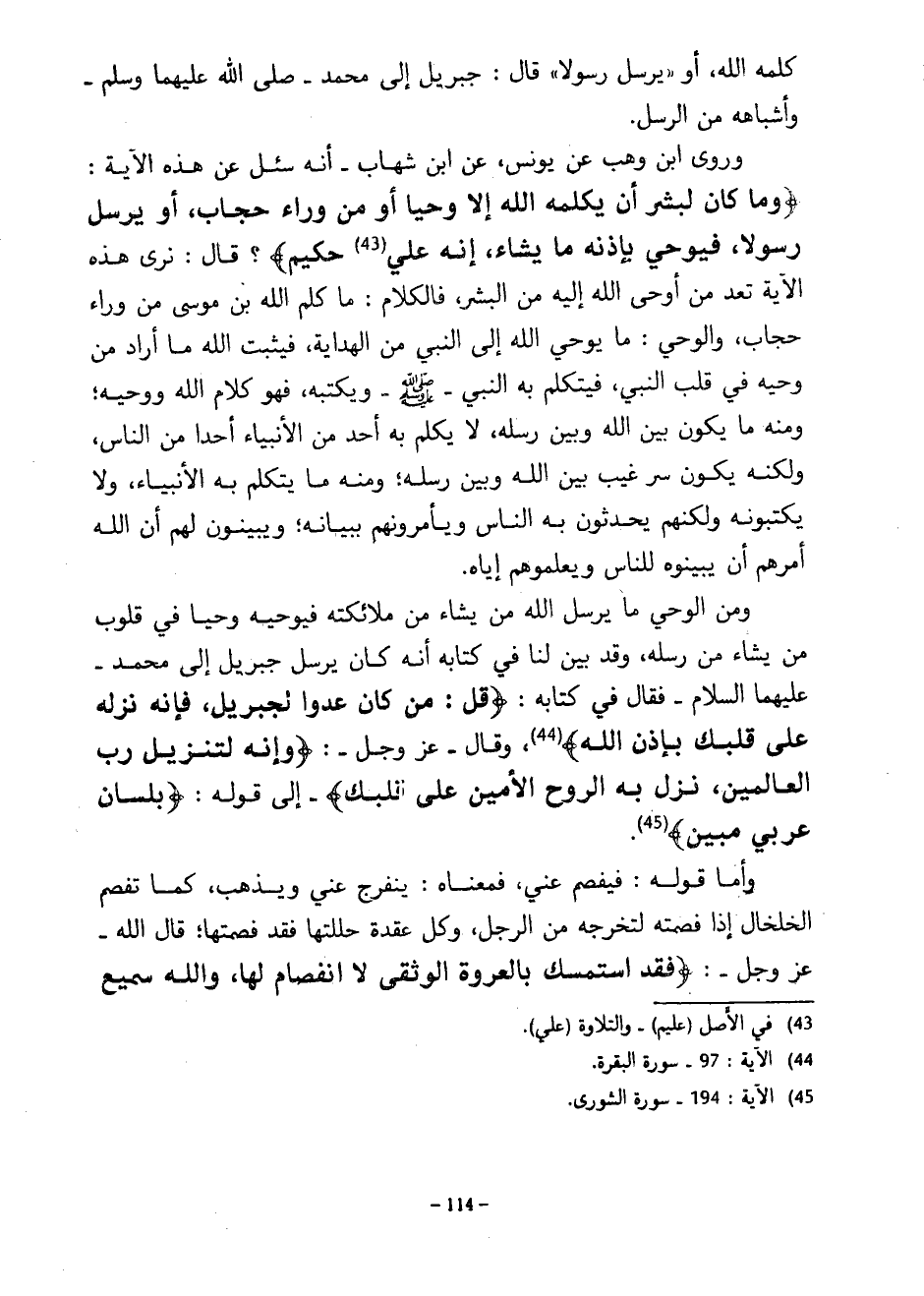 كَلَّمَهُ اللَّهُ أَوْ يُرْسِلَ رَسُولًا قَالَ جِبْرِيلُ إِلَى مُحَمَّدٍ صَلَّى اللَّهُ عَلَيْهِمَا وَسَلَّمَ وَأَشْبَاهِهِ مِنَ الرُّسُلِ وَرَوَى ابْنُ وَهْبٍ عَنْ يُونُسَ عَنِ ابْنِ شِهَابٍ أَنَّهُ سُئِلَ عَنْ هَذِهِ الْآيَةِ وَمَا كَانَ لِبَشَرٍ أَنْ يُكَلِّمَهُ اللَّهُ إِلَّا وَحْيًا أَوْ مِنْ وَرَاءِ حِجَابٍ أَوْ يُرْسِلَ رَسُولًا فَيُوحِيَ بِإِذْنِهِ مَا يَشَاءُ إِنَّهُ عَلِيٌّ حَكِيمٌ قَالَ نَرَى هَذِهِ الْآيَةَ تَعُدُّ مَنْ أَوْحَى اللَّهُ إِلَيْهِ مِنَ الْبَشَرِ فَالْكَلَامُ ما كلم الله بن مُوسَى مِنْ وَرَاءِ حِجَابٍ وَالْوَحْيُ مَا يُوحِي اللَّهُ إِلَى النَّبِيِّ مِنِ الْهِدَايَةِ فَيُثَبِّتُ اللَّهُ مَا أَرَادَ مِنْ وَحْيِهِ فِي قَلْبِ النَّبِيِّ فَيَتَكَلَّمُ بِهِ النَّبِيُّ صَلَّى اللَّهُ عَلَيْهِ وَسَلَّمَ وَيَكْتُبُهُ فَهُوَ كَلَامُ اللَّهِ وَوَحْيُهُ وَمِنْهُ مَا يكون بين الله وبين رسله ومنه لَا يُكَلِّمُ بِهِ أَحَدٌ مِنَ الْأَنْبِيَاءِ أَحَدًا مِنَ النَّاسِ وَلَكِنَّهُ يَكُونُ سِرٌّ غَيْبٌ بَيْنَ اللَّهِ وَبَيْنَ رُسُلِهِ وَمِنْهُ مَا يَتَكَلَّمُ بِهِ الْأَنْبِيَاءُ وَلَا يَكْتُبُونَهُ وَلَكِنَّهُمْ يُحَدِّثُونَ بِهِ النَّاسَ وَيَأْمُرُونَهُمْ بِبَيَانِهِ وَيُبَيِّنُونَ لَهُمْ أَنَّ اللَّهَ أَمَرَهُمْ أَنْ يُبَيِّنُوهُ لِلنَّاسِ وَيُعْلِمُوهُمْ إِيَّاهُ وَمِنَ الْوَحْيِ مَا يُرْسِلُ اللَّهُ مَنْ يَشَاءُ مِنْ مَلَائِكَتِهِ فَيُوحِيهِ وَحْيًا فِي قُلُوبِ مَنْ يَشَاءُ مِنْ رُسُلِهِ وَقَدْ بَيَّنَ لَنَا فِي كِتَابِهِ أَنَّهُ كَانَ يُرْسِلُ جِبْرِيلَ إِلَى مُحَمَّدٍ عَلَيْهِمَا السَّلَامُ فَقَالَ فِي كِتَابِهِ قُلْ مَنْ كَانَ عَدُوًّا لِجِبْرِيلَ فَإِنَّهُ نَزَّلَهُ عَلَى قَلْبِكَ بِإِذْنِ اللَّهِ وَقَالَ عَزَّ وَجَلَّ وَإِنَّهُ لَتَنْزِيلُ رَبِّ الْعَالَمِينَ نَزَلَ بِهِ الرُّوحُ الْأَمِينُ عَلَى قَلْبِكَ إِلَى قَوْلِهِ بِلِسَانٍ عَرَبِيٍّ مُبِينٍ وَأَمَّا قَوْلُهُ فَيَفْصِمُ عَنِّي فَمَعْنَاهُ يَنْفَرِجُ عَنِّي وَيَذْهَبُ كَمَا تَفْصِمُ الْخَلْخَالَ إِذَا فَصَمْتَهُ لِتُخْرِجَهُ مِنَ الرِّجْلِ وَكُلُّ عُقْدَةٍ حَلَلْتَهَا فَقَدْ فَصَمْتَهَا قَالَ اللَّهُ عَزَّ وَجَلَّ فَقَدِ اسْتَمْسَكَ بِالْعُرْوَةِ الْوُثْقَى لَا انْفِصَامَ لَهَا وَاللَّهُ سَمِيعٌ
