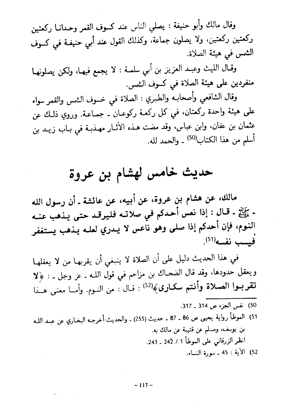 حَدِيثٌ خَامِسٌ لِهِشَامِ بْنِ عُرْوَةَ مَالِكٍ عَنْ هِشَامِ بْنِ عُرْوَةَ عَنْ أَبِيهِ عَنْ عَائِشَةَ أَنَّ رَسُولَ اللَّهِ صَلَّى اللَّهُ عَلَيْهِ وَسَلَّمَ قَالَ إِذَا نَعَسَ أَحَدُكُمْ فِي صَلَاتِهِ فَلْيَرْقُدْ حَتَّى يَذْهَبَ عَنْهُ النَّوْمُ فَإِنَّ أَحَدَكُمْ إِذَا صَلَّى وَهُوَ نَاعِسٌ لَا يَدْرِي لَعَلَّهُ يَذْهَبُ يَسْتَغْفِرُ فَيَسُبُّ نَفْسَهُ فِي هَذَا الْحَدِيثِ دَلَّلَ عَلَى أَنَّ الصَّلَاةَ لَا يَنْبَغِي أَنْ يَقْرَبَهَا مَنْ لَا يَعْقِلُهَا وَيَعْقِلُ حُدُودَهَا وَقَدْ قَالَ الضَّحَّاكُ بْنُ مُزَاحِمٍ فِي قَوْلِ اللَّهِ عَزَّ وَجَلَّ لَا تَقْرَبُوا الصَّلَاةَ وَأَنْتُمْ سُكَارَى قَالَ مِنَ النَّوْمِ وَأَمَّا معنى هذا