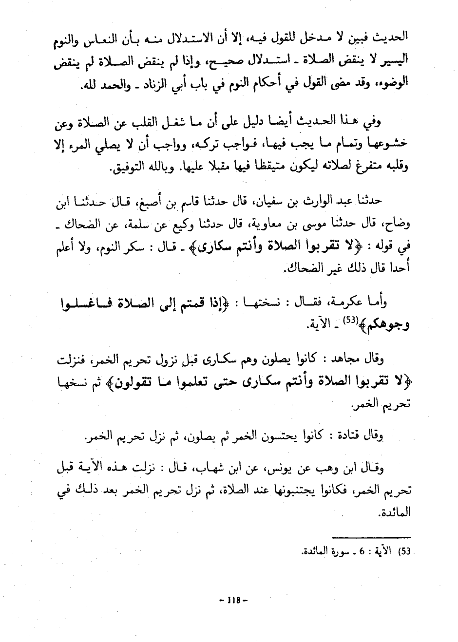 الْحَدِيثِ فَبَيِّنٌ لَا مَدْخَلَ لِلْقَوْلِ فِيهِ إِلَّا أَنَّ الِاسْتِدْلَالَ مِنْهُ بِأَنَّ النُّعَاسَ وَالنَّوْمَ الْيَسِيرَ لا ينقض الصلاة استدلال وصحيح إِذَا لَمْ يَنْقُضِ الصَّلَاةَ لَمْ يَنْقُضِ الْوُضُوءَ وَقَدْ مَضَى الْقَوْلُ فِي أَحْكَامِ النَّوْمِ فِي بَابِ أَبِي الزِّنَادِ وَالْحَمْدُ لِلَّهِ وَفِي هَذَا الْحَدِيثِ أَيْضًا دَلِيلٌ عَلَى أَنَّ مَا شَغَلَ الْقَلْبَ عَنِ الصَّلَاةِ وَعَنْ خُشُوعِهَا وَتَمَامِ مَا يَجِبُ فِيهَا فَوَاجِبٌ تَرْكُهُ وَوَاجِبٌ أَنْ لَا يُصَلِّيَ الْمَرْءُ إِلَّا وَقَلْبُهُ مُتَفَرِّغٌ لِصَلَاتِهِ لِيَكُونَ مُتَيَقِّظًا فِيهَا مُقْبِلًا عَلَيْهَا وَبِاللَّهِ التَّوْفِيقُ حَدَّثَنَا عَبْدُ الْوَارِثِ بْنُ سُفْيَانَ قَالَ حَدَّثَنَا قَاسِمُ بْنُ أَصْبَغَ قَالَ حَدَّثَنَا ابْنُ وَضَّاحٍ قَالَ حَدَّثَنَا مُوسَى بْنُ مُعَاوِيَةَ قَالَ حَدَّثَنَا وَكِيعٌ عَنْ سَلَمَةَ عَنِ الضَّحَّاكِ فِي قَوْلِهِ لَا تَقْرَبُوا الصَّلَاةَ وَأَنْتُمْ سُكَارَى قَالَ سُكْرُ النَّوْمِ وَلَا أَعْلَمُ أَحَدًا قَالَ ذَلِكَ غَيْرَ الضَّحَّاكِ وَأَمَّا عِكْرِمَةُ فَقَالَ نَسَخَتْهَا إِذَا قُمْتُمْ إِلَى الصَّلَاةِ فَاغْسِلُوا وُجُوهَكُمْ الْآيَةَ وَقَالَ مُجَاهِدٌ كَانُوا يُصَلُّونَ وَهُمْ سُكَارَى قَبْلَ نُزُولِ تَحْرِيمِ الْخَمْرِ فَنَزَلَتْ لَا تَقْرَبُوا الصَّلَاةَ وَأَنْتُمْ سُكَارَى حَتَّى تَعْلَمُوا مَا تَقُولُونَ ثُمَّ نَسَخَهَا تَحْرِيمُ الْخَمْرِ وَقَالَ قَتَادَةُ كَانُوا يَحْتَسُونَ الْخَمْرَ ثُمَّ يُصَلُّونَ ثُمَّ نَزَلَ تَحْرِيمُ الْخَمْرِ وَقَالَ ابْنُ وَهْبٍ عَنْ يُونُسَ عَنِ ابْنِ شِهَابٍ قَالَ نَزَلَتْ هَذِهِ الْآيَةُ قَبْلَ تَحْرِيمِ الْخَمْرِ فَكَانُوا يَجْتَنِبُونَهَا عِنْدَ الصَّلَاةِ ثُمَّ نَزَلَ تَحْرِيمُ الْخَمْرِ بَعْدَ ذَلِكَ فِي الْمَائِدَةِ