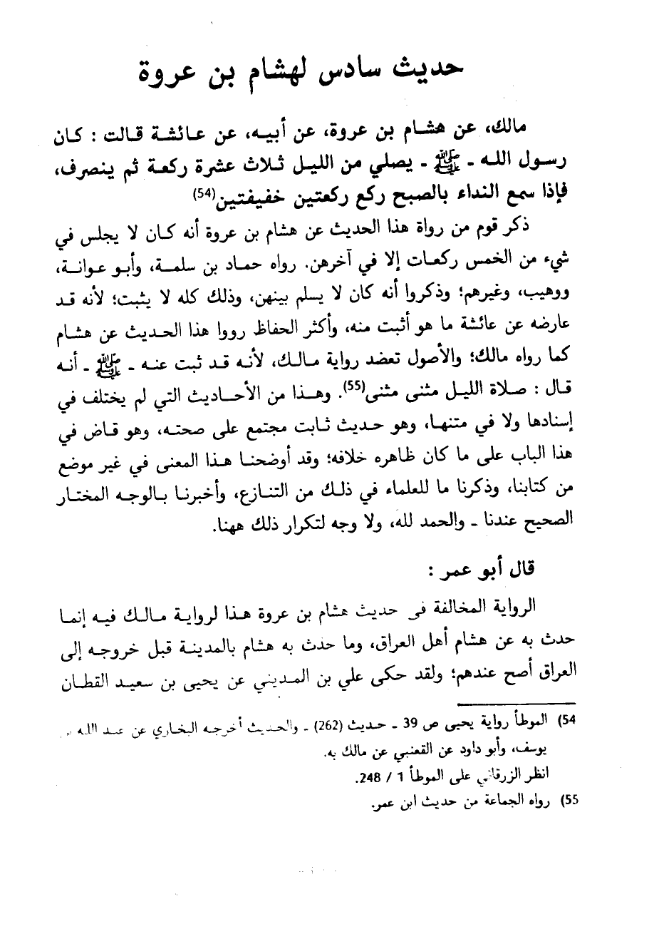 حَدِيثٌ سَادِسٌ لِهِشَامِ بْنِ عُرْوَةَ مَالِكٍ عَنْ هِشَامِ بْنِ عُرْوَةَ عَنْ أَبِيهِ عَنْ عَائِشَةَ قَالَتْ كَانَ رَسُولُ اللَّهِ صَلَّى اللَّهُ عَلَيْهِ وَسَلَّمَ يُصَلِّي مِنَ اللَّيْلِ ثَلَاثَ عَشْرَةَ رَكْعَةً ثُمَّ يَنْصَرِفُ فَإِذَا سَمِعَ النِّدَاءَ بِالصُّبْحِ رَكَعَ رَكْعَتَيْنِ خَفِيفَتَيْنِ ذَكَرَ قَوْمٌ مِنْ رُوَاةِ هَذَا الْحَدِيثِ عَنْ هِشَامِ بْنِ عُرْوَةَ أَنَّهُ كَانَ لَا يَجْلِسُ فِي شَيْءٍ مِنَ الْخَمْسِ رَكَعَاتٍ إِلَّا فِي آخِرِهِنَّ رَوَاهُ حَمَّادُ بْنُ سَلَمَةَ وَأَبُو عَوَانَةَ وَوُهَيْبٌ وَغَيْرُهُمْ وَذَكَرُوا أَنَّهُ كَانَ لَا يُسَلِّمُ بَيْنَهُنَّ وَذَلِكَ كُلُّهُ لَا يَثْبُتُ لِأَنَّهُ قَدْ عَارَضَهُ عَنْ عَائِشَةَ مَا هُوَ أَثْبَتُ مِنْهُ وَأَكْثَرُ الْحُفَّاظِ رَوَوْا هَذَا الْحَدِيثَ عَنْ هِشَامٍ كَمَا رَوَاهُ مَالِكٌ وَالْأُصُولُ تُعَضِّدُ رِوَايَةَ مَالِكٍ لِأَنَّهُ قَدْ ثَبَتَ عَنْهُ صَلَّى اللَّهُ عَلَيْهِ وَسَلَّمَ أَنَّهُ قَالَ صَلَاةُ اللَّيْلِ مَثْنَى مَثْنَى وَهَذَا مِنَ الْأَحَادِيثِ الَّتِي لَمْ يُخْتَلَفْ فِي إِسْنَادِهَا وَلَا فِي مَتْنِهَا وَهُوَ حَدِيثٌ ثَابِتٌ مُجْتَمَعٌ عَلَى صِحَّتِهِ وَهُوَ قَاضٍ فِي هَذَا الْبَابِ عَلَى مَا كَانَ ظَاهِرُهُ خِلَافَهُ وَقَدْ أَوْضَحْنَا هَذَا الْمَعْنَى فِي غَيْرِ مَوْضِعٍ مِنْ كِتَابِنَا وَذَكَرْنَا مَا لِلْعُلَمَاءِ فِي ذَلِكَ مِنَ التَّنَازُعِ وَأَخْبَرْنَا بِالْوَجْهِ الْمُخْتَارِ الصَّحِيحِ عِنْدَنَا وَالْحَمْدُ لِلَّهِ وَلَا وَجْهَ لِتَكْرَارِ ذَلِكَ ههنا قَالَ أَبُو عُمَرَ الرِّوَايَةُ الْمُخَالِفَةُ فِي حَدِيثِ هِشَامِ بْنِ عُرْوَةَ هَذَا لِرِوَايَةِ مَالِكٍ فِيهِ إِنَّمَا حَدَّثَ بِهِ عَنْ هِشَامٍ أَهْلُ الْعِرَاقِ وَمَا حَدَّثَ بِهِ هِشَامٌ بِالْمَدِينَةِ قَبْلَ خُرُوجِهِ إِلَى الْعِرَاقِ أَصَحُّ عِنْدَهُمْ وَلَقَدْ حَكَى عَلِيُّ بْنُ الْمَدِينِيِّ عَنْ يَحْيَى بْنِ سَعِيدٍ الْقَطَّانِ