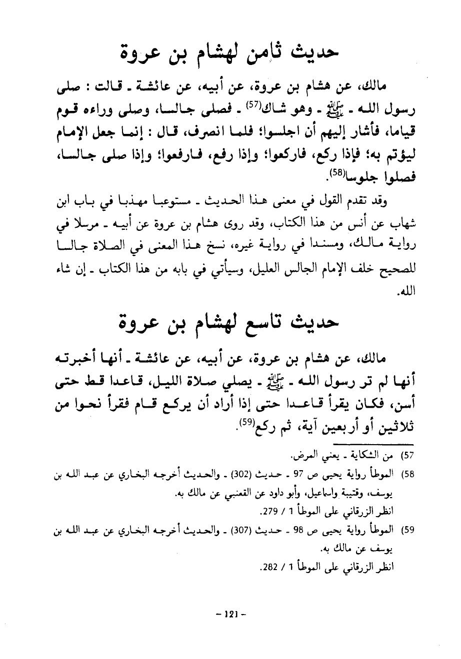 حَدِيثٌ ثَامِنٌ لِهِشَامِ بْنِ عُرْوَةَ مَالِكٍ عَنْ هِشَامِ بْنِ عُرْوَةَ عَنْ أَبِيهِ عَنْ عَائِشَةَ قَالَتْ صَلَّى رَسُولُ اللَّهِ صَلَّى اللَّهُ عَلَيْهِ وَسَلَّمَ وَهُوَ شَاكٍ فَصَلَّى جَالِسًا وَصَلَّى وَرَاءَهُ قَوْمٌ قِيَامًا فَأَشَارَ إِلَيْهِمْ أَنِ اجْلِسُوا فَلَمَّا انْصَرَفَ قَالَ إِنَّمَا جُعِلَ الْإِمَامُ لِيُؤْتَمَّ بِهِ فَإِذَا رَكَعَ فَارْكَعُوا وَإِذَا رَفَعَ فَارْفَعُوا وَإِذَا صَلَّى جَالِسًا فَصَلُّوا جُلُوسًا وَقَدْ تَقَدَّمَ الْقَوْلُ فِي مَعْنَى هَذَا الْحَدِيثِ مُسْتَوْعَبًا مُهَذَّبًا فِي بَابِ ابْنِ شِهَابٍ عَنْ أَنَسٍ مِنْ هَذَا الْكِتَابِ وَقَدْ رَوَى هِشَامُ بْنُ عُرْوَةَ عَنْ أَبِيهِ مُرْسَلًا فِي رِوَايَةِ مَالِكٍ وَمُسْنَدًا فِي رِوَايَةِ غَيْرِهِ نُسِخَ هَذَا الْمَعْنَى فِي الصَّلَاةِ جَالِسًا لِلصَّحِيحِ خَلْفَ الْإِمَامِ الْجَالِسِ الْعَلِيلِ وَسَيَأْتِي فِي بَابِهِ مِنْ هَذَا الْكِتَابِ إِنْ شَاءَ اللَّهُ