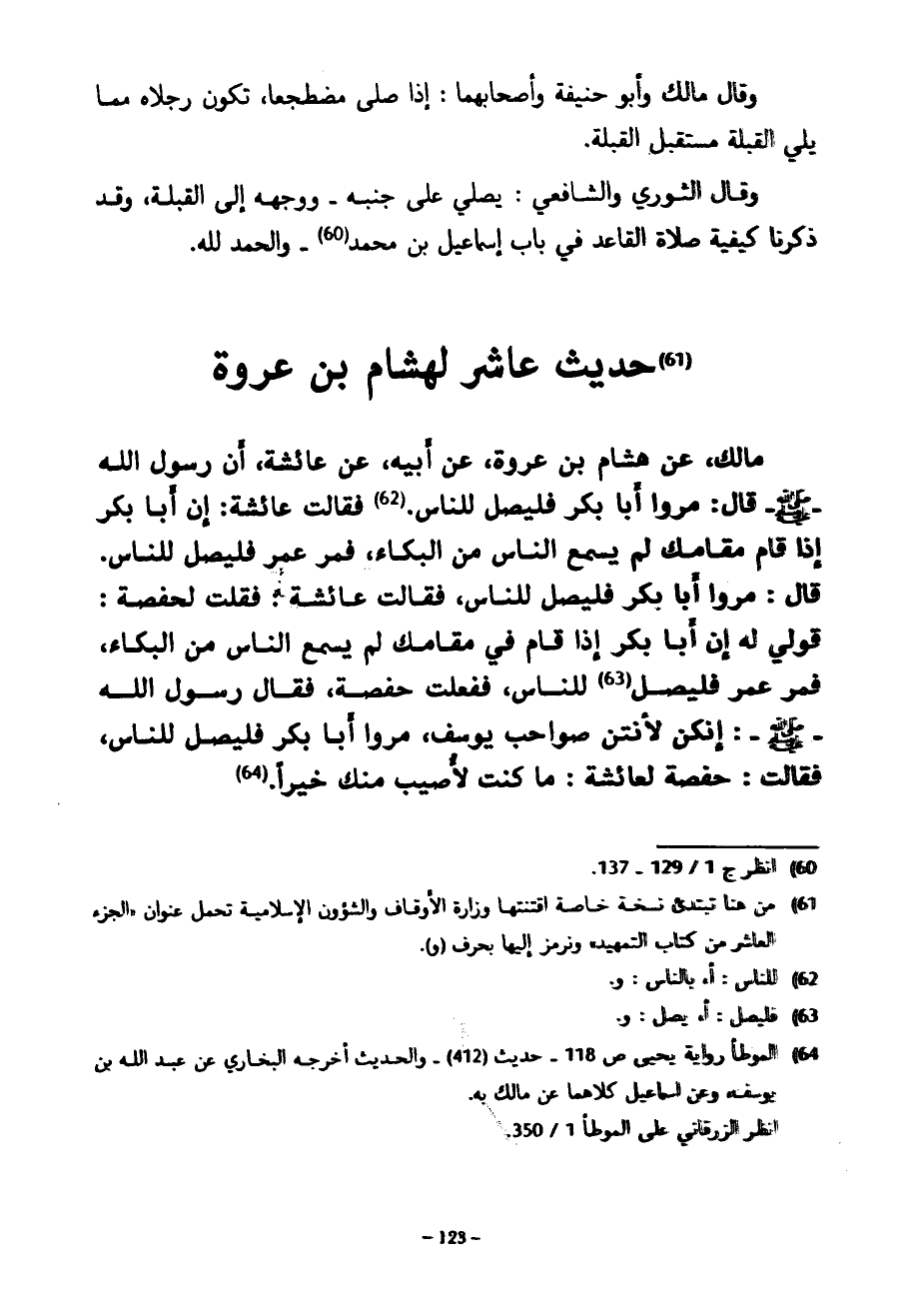 حَدِيثٌ عَاشِرٌ لِهِشَامِ بْنِ عُرْوَةَ مَالِكٍ عَنْ هِشَامِ بْنِ عُرْوَةَ عَنْ أَبِيهِ عَنْ عَائِشَةَ أَنَّ رَسُولَ اللَّهِ صَلَّى اللَّهُ عَلَيْهِ وَسَلَّمَ قَالَ مُرُوا أَبَا بَكْرٍ فَلْيُصَلِّ لِلنَّاسِ فَقَالَتْ عَائِشَةُ إِنَّ أَبَا بَكْرٍ إِذَا قَامَ مقامك لم يسمع الناس من البكاء فمر عُمَرَ فَلْيُصَلِّ لِلنَّاسِ قَالَ مُرُوا أَبَا بَكْرٍ فَلْيُصَلِّ لِلنَّاسِ فَقَالَتْ عَائِشَةُ فَقُلْتُ لِحَفْصَةَ قُولِي لَهُ إِنَّ أَبَا بَكْرٍ إِذَا قَامَ فِي مقامك لم يسمع الناس من البكاء فمر عُمَرَ فَلْيُصَلِّ لِلنَّاسِ فَفَعَلَتْ حَفْصَةُ فَقَالَ رَسُولُ اللَّهِ صَلَّى اللَّهُ عَلَيْهِ وَسَلَّمَ إِنَّكُنَّ لَأَنْتُنَّ صَوَاحِبُ يُوسُفَ مُرُوا أَبَا بَكْرٍ فَلْيُصَلِّ لِلنَّاسِ فَقَالَتْ حَفْصَةُ لِعَائِشَةَ مَا كُنْتُ لِأُصِيبَ مِنْكِ خيرا