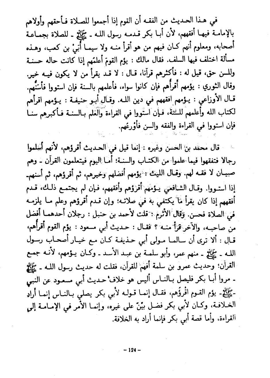 فِي هَذَا الْحَدِيثِ مِنَ الْفِقْهِ أَنَّ الْقَوْمَ إِذَا أَجْمَعُوا لِلصَّلَاةِ فَأَحَقُّهُمْ وَأَوْلَاهُمْ بِالْإِمَامَةِ فِيهَا أَفْقَهُهُمْ لِأَنَّ أَبَا بَكْرٍ قَدَّمَهُ رَسُولُ اللَّهِ صَلَّى اللَّهُ عَلَيْهِ وَسَلَّمَ لِلصَّلَاةِ بِجَمَاعَةِ أَصْحَابِهِ وَمَعْلُومٌ أَنَّهُمْ كَانَ فِيهِمْ مَنْ هُوَ أَقْرَأُ مِنْهُ وَلَا سِيَّمَا أُبَيُّ بْنُ كَعْبٍ وَهَذِهِ مَسْأَلَةٌ اخْتَلَفَ فِيهَا السَّلَفُ فَقَالَ مَالِكٌ يَؤُمُّ الْقَوْمَ أَعْلَمُهُمْ إِذَا كَانَتْ حَالُهُ حَسَنَةً وَلِلسِّنِّ حَقٌّ قِيلَ لَهُ فَأَكْثَرُهُمْ قُرْآنًا قَالَ لَا قَدْ يَقْرَأُ مَنْ لَا يَكُونُ فِيهِ خَيْرٌ وقال الثوري يؤمهم أقرأهم فَإِنْ كَانُوا سَوَاءً فَأَعْلَمُهُمْ بِالسُّنَّةِ فَإِنِ اسْتَوَوْا فَأَسَنُّهُمْ قَالَ الْأَوْزَاعِيُّ يَؤُمُّهُمْ أَفْقَهُهُمْ فِي دِينِ الله وقال أبو حنيفة يؤمهم أقرأهم لِكِتَابِ اللَّهِ وَأَعْلَمُهُمْ لِلسُّنَّةِ فَإِنِ اسْتَوَوْا فِي الْقِرَاءَةِ وَالْعِلْمِ بِالسُّنَّةِ فَأَكْبُرُهُمْ سِنًّا فَإِنِ اسْتَوَوْا فِي الْقِرَاءَةِ وَالْفِقْهِ وَالسِّنِّ فَأَوْرَعُهُمْ قَالَ مُحَمَّدُ بْنُ الْحَسَنِ وَغَيْرُهُ إِنَّمَا قِيلَ فِي الْحَدِيثِ أَقْرَؤُهُمْ لِأَنَّهُمْ أَسْلَمُوا رِجَالًا فَتَفَقَّهُوا فِيمَا عَلِمُوا مِنَ الْكِتَابِ وَالسُّنَّةِ أَمَّا الْيَوْمَ فَيَتَعَلَّمُونَ الْقُرْآنَ وَهُمْ صِبْيَانٌ لَا فِقْهَ لَهُمْ وَقَالَ اللَّيْثُ يَؤُمُّهُمْ أَفْضَلُهُمْ وَخَيْرُهُمْ ثُمَّ أَقْرَؤُهُمْ ثُمَّ أَسَنُّهُمْ إِذَا اسْتَوَوْا وَقَالَ الشَّافِعِيُّ يَؤُمُّهُمْ أَقْرَؤُهُمْ وَأَفْقَهُهُمْ فَإِنْ لَمْ يَجْتَمِعْ ذَلِكَ قَدَّمَ أَفْقَهَهُمْ إِذَا كَانَ يَقْرَأُ مَا يَكْتَفِي بِهِ فِي صِلَاتِهِ وَإِنْ قُدِّمَ أَقْرَؤُهُمْ وَعَلِمَ مَا يَلْزَمُهُ فِي الصَّلَاةِ فَحَسَنٌ وَقَالَ الْأَثْرَمُ قُلْتُ لِأَحْمَدَ بْنِ حَنْبَلٍ رَجُلَانِ أَحَدُهُمَا أَفْضَلُ مِنْ صَاحِبِهِ وَالْآخَرُ قرأ مِنْهُ فَقَالَ حَدِيثُ أَبِي مَسْعُودٍ يَؤُمُّ الْقَوْمَ أقرأهم قَالَ أَلَا تَرَى أَنَّ سَالِمًا مَوْلَى أَبِي حُذَيْفَةَ كَانَ مَعَ خِيَارِ أَصْحَابِ رَسُولِ اللَّهِ صَلَّى اللَّهُ عَلَيْهِ وَسَلَّمَ مِنْهُمْ عُمَرُ وَأَبُو سَلَمَةَ بْنُ عَبْدِ الْأَسَدِ وَكَانَ يَؤُمُّهُمْ لِأَنَّهُ جَمَعَ الْقُرْآنَ وَحَدِيثُ عَمْرِو بْنِ سَلَمَةَ أَفْهَمُ لِلْقُرْآنِ فَقُلْتُ لَهُ حَدِيثِ رَسُولِ اللَّهِ صَلَّى اللَّهُ عَلَيْهِ وَسَلَّمَ مُرُوا أَبَا بَكْرٍ فَلْيُصَلِّ بِالنَّاسِ أَلَيْسَ هُوَ خِلَافَ حَدِيثِ أَبِي مَسْعُودٍ عَنِ النَّبِيِّ صَلَّى اللَّهُ عَلَيْهِ وَسَلَّمَ يَؤُمُّ الْقَوْمَ أَقْرَؤُهُمْ فَقَالَ إِنَّمَا قَوْلُهُ لِأَبِي بَكْرٍ يُصَلِّي بِالنَّاسِ إِنَّمَا أَرَادَ الْخِلَافَةَ وَكَانَ لِأَبِي بَكْرٍ فَضْلٌ بَيِّنٌ عَلَى غَيْرِهِ وَإِنَّمَا الْأَمْرُ فِي الْإِمَامَةِ إِلَى الْقِرَاءَةِ وَأَمَّا قِصَّةُ أَبِي بَكْرٍ فَإِنَّمَا أَرَادَ بِهِ الْخِلَافَةَ