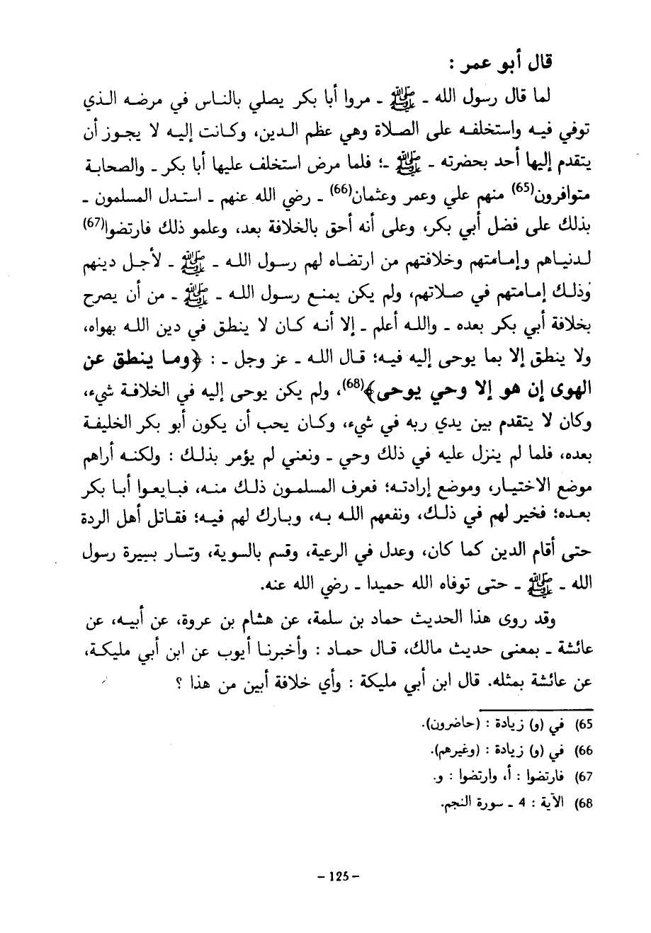 قَالَ أَبُو عُمَرَ لِمَا قَالَ رَسُولُ اللَّهِ صَلَّى اللَّهُ عَلَيْهِ وَسَلَّمَ مُرُوا أَبَا بَكْرٍ يُصَلِّي بِالنَّاسِ فِي مَرَضِهِ الَّذِي تُوُفِّيَ فِيهِ وَاسْتَخْلَفَهُ عَلَى الصَّلَاةِ وَهِيَ عِظَمُ الدِّينِ وَكَانَتْ إِلَيْهِ لَا يَجُوزُ أَنْ يَتَقَدَّمَ إِلَيْهَا أَحَدٌ بِحَضْرَتِهِ صَلَّى اللَّهُ عَلَيْهِ وَسَلَّمَ فَلَمَّا مَرِضَ اسْتَخْلَفَ عَلَيْهَا أَبَا بَكْرٍ وَالصَّحَابَةُ مُتَوَافِرُونَ مِنْهُمْ عَلِيٌّ وَعُمَرُ وَعُثْمَانُ رَضِيَ اللَّهُ عَنْهُمْ اسْتَدَلَّ الْمُسْلِمُونَ بِذَلِكَ عَلَى فَضْلِ أَبِي بَكْرٍ وَعَلَى أنه أحق بالخلافة بعد وعلمو ذَلِكَ فَارْتَضَوْا لِدُنْيَاهُمْ وَإِمَامَتِهِمْ وَخِلَافَتِهِمْ مَنِ ارْتَضَاهُ لَهُمْ رَسُولُ اللَّهِ صَلَّى اللَّهُ عَلَيْهِ وَسَلَّمَ لِأَجْلِ دِينِهِمْ وَذَلِكَ إِمَامَتُهُمْ فِي صَلَاتِهِمْ وَلَمْ يَكُنْ يَمْنَعْ رَسُولَ اللَّهِ صَلَّى اللَّهُ عَلَيْهِ وَسَلَّمَ مِنْ أَنْ يُصَرِّحَ بِخِلَافَةِ أَبِي بَكْرٍ بَعْدَهُ وَاللَّهُ أَعْلَمُ إِلَّا أَنَّهُ كَانَ لَا يَنْطِقُ فِي دِينِ اللَّهِ بِهَوَاهُ وَلَا يَنْطِقُ إِلَّا بِمَا يُوحَى إِلَيْهِ فِيهِ قَالَ اللَّهُ عَزَّ وَجَلَّ وَمَا يَنْطِقُ عَنِ الْهَوَى إِنْ هُوَ إِلَّا وَحْيٌ يُوحَى وَلَمْ يَكُنْ يُوحَى إِلَيْهِ فِي الْخِلَافَةِ شَيْءٌ وَكَانَ لَا يَتَقَدَّمُ بَيْنَ يَدَيْ رَبِّهِ فِي شَيْءٍ وَكَانَ يُحِبُّ أَنْ يَكُونَ أَبُو بَكْرٍ الْخَلِيفَةَ بَعْدَهُ فَلَمَّا لَمْ يَنْزِلْ عَلَيْهِ فِي ذَلِكَ وَحْيٌ وَنَعْنِي لَمْ يُؤْمَرْ بِذَلِكَ وَلَكِنَّهُ أَرَاهُمْ مَوْضِعَ الِاخْتِيَارِ وَمَوْضِعَ إِرَادَتِهِ فَعَرَفَ الْمُسْلِمُونَ ذَلِكَ مِنْهُ فَبَايَعُوا أَبَا بَكْرٍ بَعْدَهُ فَخَيْرٌ لَهُمْ فِي ذَلِكَ وَنَفَعَهُمُ اللَّهُ بِهِ وَبَارَكَ لَهُمْ فِيهِ فَقَاتَلَ أَهْلَ الرِّدَّةِ حَتَّى أَقَامَ الدِّينَ كَمَا كَانَ وَعَدَلَ فِي الرَّعِيَّةِ وَقَسَّمَ بِالسَّوِيَّةِ وَسَارَ بِسِيرَةِ رَسُولُ اللَّهِ صَلَّى اللَّهُ عَلَيْهِ وَسَلَّمَ حَتَّى تَوَفَّاهُ اللَّهُ حَمِيدًا رَضِيَ اللَّهُ عَنْهُ وَقَدْ رَوَى هَذَا الْحَدِيثَ حَمَّادُ بْنُ سَلَمَةَ عَنْ هِشَامِ بْنِ عُرْوَةَ عن أبيه عن عائشة بِمَعْنَى حَدِيثِ مَالِكٍ قَالَ حَمَّادٌ وَأَخْبَرَنَا أَيُّوبُ عَنِ ابْنِ أَبِي مُلَيْكَةَ عَنْ عَائِشَةَ بِمِثْلِهِ قَالَ ابْنُ أَبِي مُلَيْكَةَ وَأَيُّ خِلَافَةٍ أَبْيَنُ من هذا