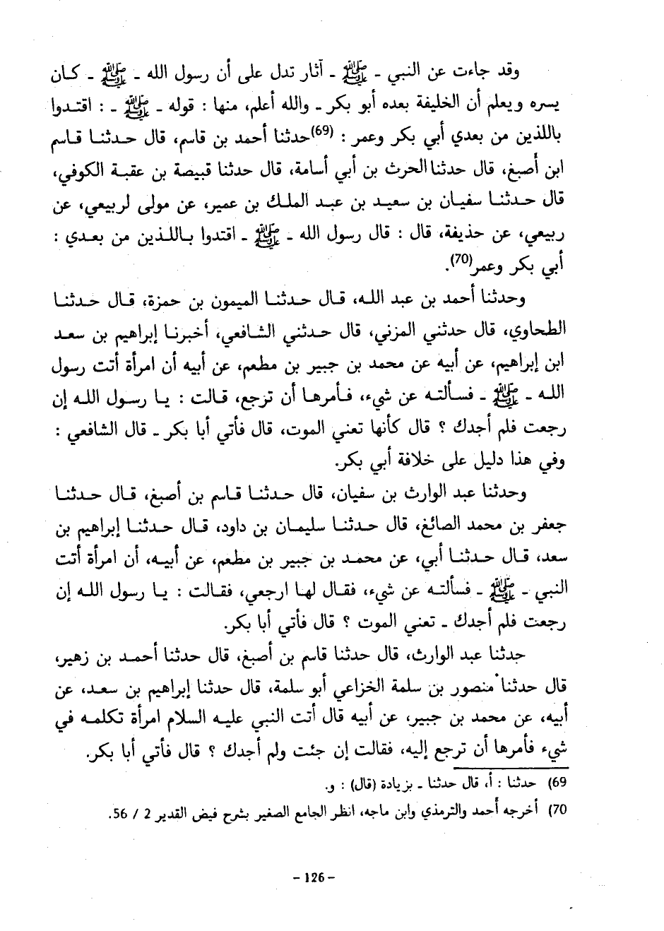 وَقَدْ جَاءَتْ عَنِ النَّبِيِّ صَلَّى اللَّهُ عَلَيْهِ وَسَلَّمَ آثَارٌ تَدُلُّ عَلَى أَنَّ رَسُولَ اللَّهِ صَلَّى اللَّهُ عَلَيْهِ وَسَلَّمَ كَانَ يَسُرُّهُ وَيَعْلَمُ أَنَّ الْخَلِيفَةَ بَعْدَهُ أَبُو بَكْرٍ وَاللَّهُ أَعْلَمُ مِنْهَا قَوْلُهُ صَلَّى اللَّهُ عَلَيْهِ وَسَلَّمَ اقْتَدُوا بِاللَّذَيْنِ مِنْ بَعْدِي أَبِي بَكْرٍ وَعُمَرَ حَدَّثَنَا أَحْمَدُ بْنُ قَاسِمٍ قَالَ حَدَّثَنَا قَاسِمُ ابن أَصْبَغَ قَالَ حَدَّثَنَا الْحَرْثُ بْنُ أَبِي أُسَامَةَ قَالَ حَدَّثَنَا قَبِيصَةُ بْنُ عُقْبَةَ الْكُوفِيُّ قَالَ حَدَّثَنَا سُفْيَانُ بْنُ سَعِيدِ بْنِ عَبْدِ الْمَلِكِ بْنِ عُمَيْرٍ عَنْ مَوْلًى لِرَبِيعِيٍّ عَنْ رَبِيعِيٍّ عَنْ حُذَيْفَةَ قَالَ قَالَ رَسُولُ اللَّهِ صَلَّى اللَّهُ عَلَيْهِ وَسَلَّمَ اقْتَدُوا بِاللَّذَيْنِ مِنْ بَعْدِي أَبِي بَكْرٍ وَعُمَرَ وَحَدَّثَنَا أَحْمَدُ بْنُ عَبْدِ اللَّهِ قَالَ حَدَّثَنَا الْمَيْمُونُ بْنُ حَمْزَةَ قَالَ حَدَّثَنَا الطَّحَاوِيُّ قَالَ حَدَّثَنِي الْمُزَنِيُّ قَالَ حَدَّثَنِي الشَّافِعِيُّ أَخْبَرَنَا إِبْرَاهِيمُ بْنُ سعد ابن إِبْرَاهِيمَ عَنْ أَبِيهِ عَنْ مُحَمَّدِ بْنِ جُبَيْرِ بْنِ مُطْعِمٍ عَنْ أَبِيهِ أَنَّ امْرَأَةً أَتَتْ رَسُولَ اللَّهِ صَلَّى اللَّهُ عَلَيْهِ وَسَلَّمَ فَسَأَلْتُهُ عَنْ شَيْءٍ فَأَمَرَهَا أَنْ تَرْجِعَ قَالَتْ يَا رَسُولَ اللَّهِ إِنْ رَجَعْتُ فَلَمْ أَجِدْكَ قَالَ كأنها تعني الموت قال فأتي أَبَا بَكْرٍ قَالَ الشَّافِعِيُّ وَفِي هَذَا دَلِيلٌ عَلَى خِلَافَةِ أَبِي بَكْرٍ وَحَدَّثَنَا عَبْدُ الْوَارِثِ بْنُ سُفْيَانَ قَالَ حَدَّثَنَا قَاسِمُ بْنُ أَصْبَغَ قَالَ حَدَّثَنَا جَعْفَرُ بْنُ مُحَمَّدٍ الصَّائِغُ قَالَ حَدَّثَنَا سُلَيْمَانُ بْنُ دَاوُدَ قَالَ حَدَّثَنَا إِبْرَاهِيمُ بْنُ سَعْدٍ قَالَ حَدَّثَنَا أُبَيٌّ عَنْ مُحَمَّدِ بْنِ جُبَيْرِ بْنِ مُطْعِمٍ عَنْ أَبِيهِ أَنَّ امْرَأَةً أَتَتِ النَّبِيَّ صَلَّى اللَّهُ عَلَيْهِ وَسَلَّمَ فَسَأَلَتْهُ عَنْ شَيْءٍ فَقَالَ لَهَا ارْجِعِي فَقَالَتْ يَا رَسُولَ اللَّهِ إِنْ رَجَعْتُ فَلَمْ أَجِدْكَ تَعْنِي الْمَوْتَ قَالَ فَأْتِي أَبَا بَكْرٍ حَدَّثَنَا عَبْدُ الْوَارِثِ قَالَ حَدَّثَنَا قَاسِمُ بْنُ أَصْبَغَ قَالَ حَدَّثَنَا أَحْمَدُ بْنُ زُهَيْرٍ قَالَ حَدَّثَنَا مَنْصُورُ بْنُ سَلَمَةَ الْخُزَاعِيُّ أَبُو سَلَمَةَ قَالَ حَدَّثَنَا إِبْرَاهِيمُ بْنُ سَعْدٍ عَنْ أَبِيهِ عَنْ مُحَمَّدِ بْنِ جُبَيْرٍ عَنْ أَبِيهِ قَالَ أَتَتِ النَّبِيَّ عَلَيْهِ السَّلَامُ امْرَأَةٌ تُكَلِّمُهُ فِي شَيْءٍ فَأَمَرَهَا أَنْ تَرْجِعَ إِلَيْهِ فَقَالَتْ إِنْ جِئْتُ ولم أجدك قال فأتي أبا بكر