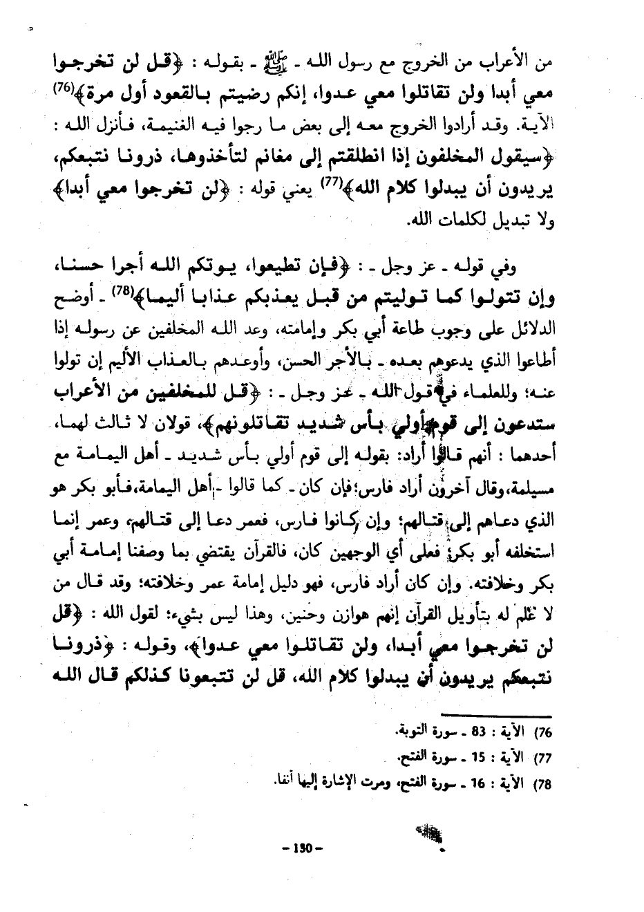 مِنَ الْأَعْرَابِ مِنَ الْخُرُوجِ مَعَ رَسُولِ اللَّهِ صَلَّى اللَّهُ عَلَيْهِ وَسَلَّمَ بقوله قل لَنْ تَخْرُجُوا مَعِيَ أَبَدًا وَلَنْ تُقَاتِلُوا مَعِيَ عَدُوًّا إِنَّكُمْ رَضِيتُمْ بِالْقُعُودِ أَوَّلَ مَرَّةٍ الْآيَةَ وَقَدْ أَرَادُوا الْخُرُوجَ مَعَهُ إِلَى بَعْضِ مَا رَجَوْا فِيهِ الْغَنِيمَةَ فَأَنْزَلَ اللَّهُ سَيَقُولُ الْمُخَلَّفُونَ إِذَا انْطَلَقْتُمْ إِلَى مَغَانِمَ لِتَأْخُذُوهَا ذَرُونَا نَتَّبِعْكُمْ يُرِيدُونَ أَنْ يُبَدِّلُوا كَلَامَ اللَّهِ يَعْنِي قَوْلَهُ لَنْ تَخْرُجُوا مَعِيَ أَبَدًا وَلَا تَبْدِيلَ لِكَلِمَاتِ اللَّهِ وَفِي قَوْلِهِ عَزَّ وَجَلَّ فَإِنْ تُطِيعُوا يُؤْتِكُمُ اللَّهُ أَجْرًا حَسَنًا وَإِنْ تَتَوَلَّوْا كَمَا تَوَلَّيْتُمْ مِنْ قَبْلُ يُعَذِّبْكُمْ عَذَابًا أَلِيمًا أَوْضَحُ الدَّلَائِلِ عَلَى وُجُوبِ طَاعَةِ أَبِي بَكْرٍ وَإِمَامَتِهِ وَعَدَ اللَّهُ الْمُخَلَّفِينَ عَنْ رَسُولِهِ إِذَا أَطَاعُوا الَّذِي يَدْعُوهُمْ بَعْدَهُ بِالْأَجْرِ الْحَسَنِ وَأَوْعَدَهُمْ بِالْعَذَابِ الْأَلِيمِ إِنْ تَوَلَّوْا عَنْهُ وَلِلْعُلَمَاءِ فِي قَوْلِ اللَّهِ عَزَّ وَجَلَّ قُلْ لِلْمُخَلَّفِينَ مِنَ الْأَعْرَابِ سَتُدْعَوْنَ إِلَى قَوْمٍ أُولِي بَأْسٍ شَدِيدٍ تُقَاتِلُونَهُمْ قَوْلَانِ لَا ثَالِثَ لَهُمَا أَحَدُهُمَا أَنَّهُمْ قَالُوا أَرَادَ بِقَوْلِهِ إِلَى قَوْمٍ أُولِي بَأْسٍ شَدِيدٍ أَهْلَ الْيَمَامَةِ مَعَ مُسَيْلِمَةَ وَقَالَ آخَرُونَ أَرَادَ فَارِسَ فَإِنْ كَانَ كَمَا قَالُوا أَهْلَ الْيَمَامَةِ فَأَبُو بَكْرٍ هُوَ الَّذِي دَعَاهُمْ إِلَى قِتَالِهِمْ وَإِنْ كَانُوا فَارِسَ فَعُمَرُ دَعَا إِلَى قِتَالِهِمْ وَعُمَرُ إِنَّمَا اسْتَخْلَفَهُ أَبُو بَكْرٍ فَعَلَى أَيِّ الْوَجْهَيْنِ كَانَ فَالْقُرْآنُ يَقْتَضِي بِمَا وَصَفْنَا إِمَامَةَ أَبِي بَكْرٍ وَخِلَافَتَهُ وَإِنْ كَانَ أَرَادَ فَارِسَ فَهُوَ دَلِيلُ إِمَامَةِ عُمَرَ وَخِلَافَتِهِ وَقَدْ قَالَ مَنْ لَا عِلْمَ لَهُ بِتَأْوِيلِ الْقُرْآنِ إِنَّهُمْ هَوَازِنُ وَحُنَيْنٌ وَهَذَا لَيْسَ بِشَيْءٍ لِقَوْلِ اللَّهِ قل لَنْ تَخْرُجُوا مَعِيَ أَبَدًا وَلَنْ تُقَاتِلُوا مَعِيَ عَدُوًّا وَقَوْلِهِ ذَرُونَا نَتَّبِعْكُمْ يُرِيدُونَ أَنْ يُبَدِّلُوا كَلَامَ اللَّهِ قُلْ لَنْ تَتَّبِعُونَا كَذَلِكُمْ قَالَ الله
