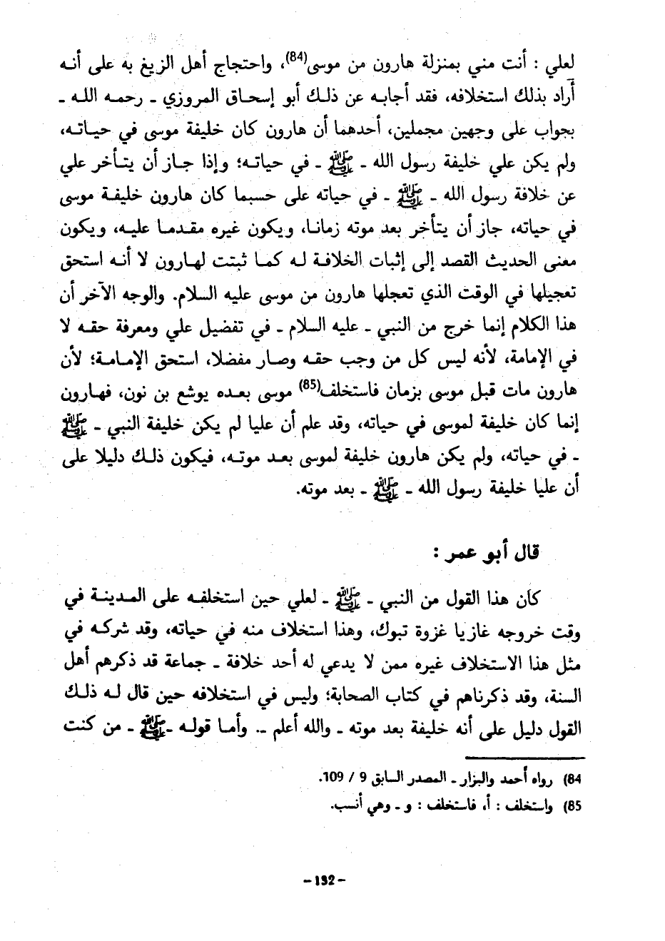 لِعَلِيٍّ أَنْتَ مِنِّي بِمَنْزِلَةِ هَارُونَ مِنْ مُوسَى وَاحْتِجَاجُ أَهْلِ الزَّيْغِ بِهِ عَلَى أَنَّهُ أَرَادَ بِذَلِكَ اسْتِخْلَافَهُ فَقَدْ أَجَابَهُ عَنْ ذَلِكَ أَبُو إِسْحَاقَ الْمَرْوَزِيُّ رَحِمَهُ اللَّهُ بِجَوَابٍ عَلَى وَجْهَيْنِ مُجْمَلَيْنِ أَحَدُهُمَا أَنَّ هَارُونَ كَانَ خَلِيفَةَ مُوسَى فِي حَيَاتِهِ وَلَمْ يَكُنْ عَلِيٌّ خَلِيفَةَ رَسُولِ اللَّهِ صَلَّى اللَّهُ عَلَيْهِ وَسَلَّمَ فِي حَيَاتِهِ وَإِذَا جَازَ أَنْ يَتَأَخَّرَ عَلِيٌّ عَنْ خِلَافَةِ رسول الله صلى الله عليه وسلم في حياته على حسبما كَانَ هَارُونُ خَلِيفَةَ مُوسَى فِي حَيَاتِهِ جَازَ أَنْ يَتَأَخَّرَ بَعْدَ مَوْتِهِ زَمَانًا وَيَكُونُ غَيْرُهُ مُقَدَّمًا عَلَيْهِ وَيَكُونُ مَعْنَى الْحَدِيثِ الْقَصْدَ إِلَى إِثْبَاتِ الْخِلَافَةِ لَهُ كَمَا ثَبَتَتْ لِهَارُونَ لَا أَنَّهُ اسْتَحَقَّ تَعْجِيلَهَا فِي الْوَقْتِ الَّذِي تَعَجَّلَهَا هَارُونُ مِنْ مُوسَى عَلَيْهِ السَّلَامُ وَالْوَجْهُ الْآخَرُ أَنَّ هَذَا الْكَلَامَ إِنَّمَا خَرَجَ مِنَ النَّبِيِّ عَلَيْهِ السَّلَامُ فِي تَفْضِيلِ عَلِيٍّ وَمَعْرِفَةِ حَقِّهِ لَا فِي الْإِمَامَةِ لِأَنَّهُ لَيْسَ كُلُّ مَنْ وَجَبَ حَقُّهُ وَصَارَ مُفَضَّلًا اسْتَحَقَّ الْإِمَامَةَ لِأَنَّ هَارُونَ مَاتَ قَبْلَ مُوسَى بِزَمَانٍ فَاسْتَخْلَفَ مُوسَى بَعْدَهُ يُوشَعَ بْنَ نُونٍ فَهَارُونُ إِنَّمَا كَانَ خَلِيفَةً لِمُوسَى فِي حَيَاتِهِ وَقَدْ عُلِمَ أَنَّ عَلِيًّا لَمْ يَكُنْ خَلِيفَةَ النَّبِيِّ صَلَّى اللَّهُ عَلَيْهِ وَسَلَّمَ فِي حَيَاتِهِ وَلَمْ يَكُنْ هَارُونُ خَلِيفَةً لِمُوسَى بَعْدَ مَوْتِهِ فَيَكُونُ ذَلِكَ دَلِيلًا عَلَى أَنَّ عَلِيًّا خَلِيفَةُ رَسُولِ اللَّهِ صَلَّى اللَّهُ عَلَيْهِ وَسَلَّمَ بَعْدَ مَوْتِهِ قَالَ أَبُو عُمَرَ كَانَ هَذَا الْقَوْلُ مِنَ النَّبِيِّ صَلَّى اللَّهُ عَلَيْهِ وَسَلَّمَ لِعَلِيٍّ حِينَ اسْتَخْلَفَهُ عَلَى الْمَدِينَةِ فِي وَقْتِ خُرُوجِهِ غَازِيًا غَزْوَةَ تَبُوكَ وَهَذَا اسْتِخْلَافٌ مِنْهُ فِي حَيَاتِهِ وَقَدْ شَرِكَهُ فِي مِثْلِ هَذَا الِاسْتِخْلَافِ غَيْرُهُ مَنْ لَا يَدَّعِي لَهُ أَحَدٌ خِلَافَةً جَمَاعَةٌ قَدْ ذَكَرَهُمْ أَهْلُ السُّنَّةِ وَقَدْ ذَكَرْنَاهُمْ فِي كِتَابِ الصَّحَابَةِ وَلَيْسَ فِي اسْتِخْلَافِهِ حِينَ قَالَ لَهُ ذَلِكَ الْقَوْلَ دَلِيلٌ عَلَى أَنَّهُ خَلِيفَةٌ بَعْدَ مَوْتِهِ وَاللَّهُ أَعْلَمُ وَأَمَّا قَوْلُهُ صَلَّى اللَّهُ عَلَيْهِ وَسَلَّمَ مَنْ كُنْتُ